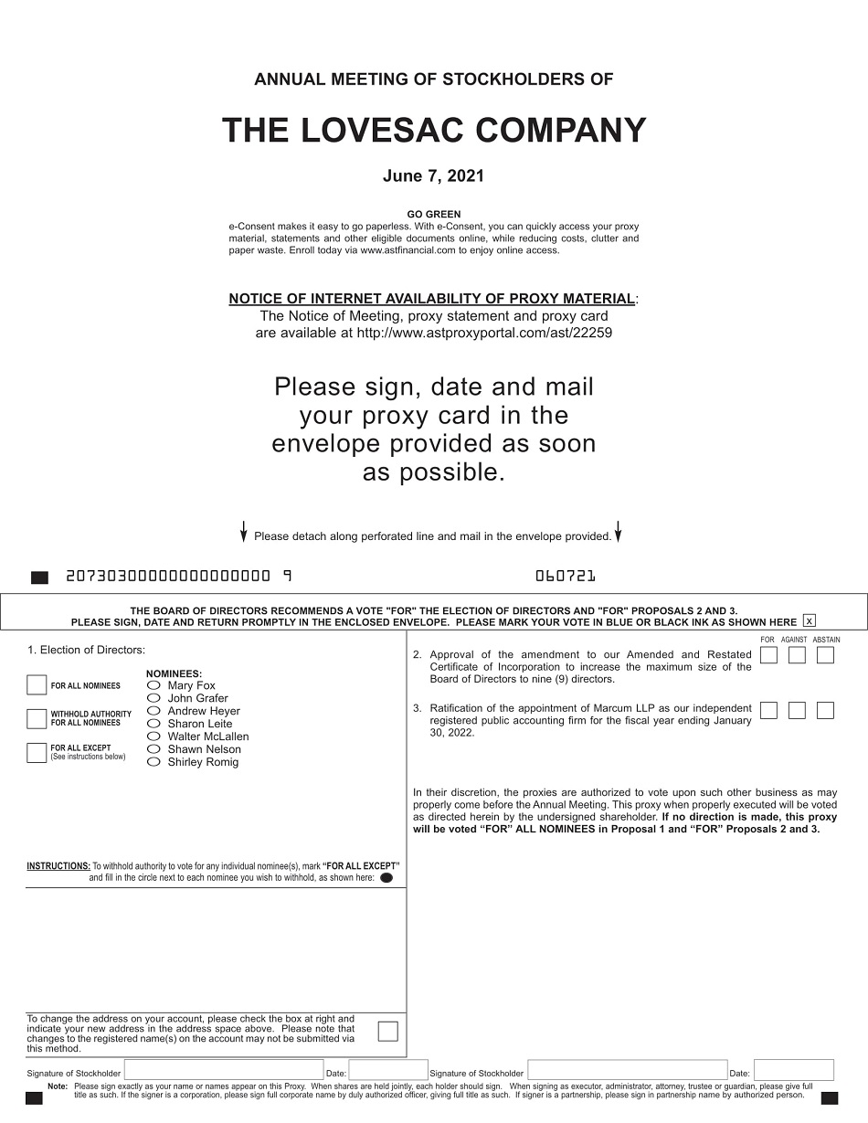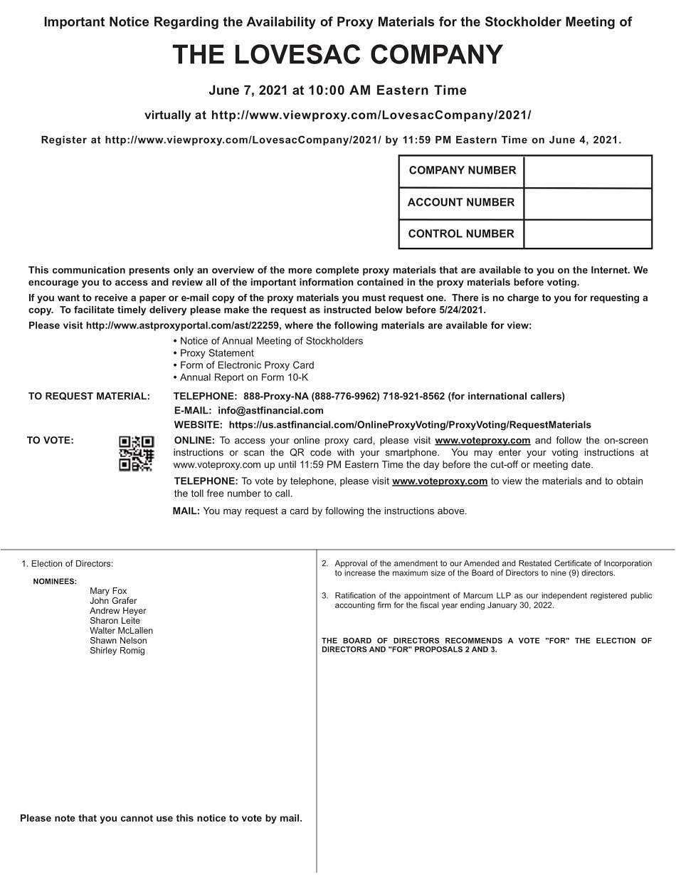 You are cordially invited to attend the 2021 Annual Meeting of Stockholders (the “Annual Meeting”) of The Lovesac Company at 10:00 a.m. Eastern Time on June 7, 2021, to be conducted virtually via live webcast by pre-registering at https://viewproxy.com/LovesacCompany/2021/.