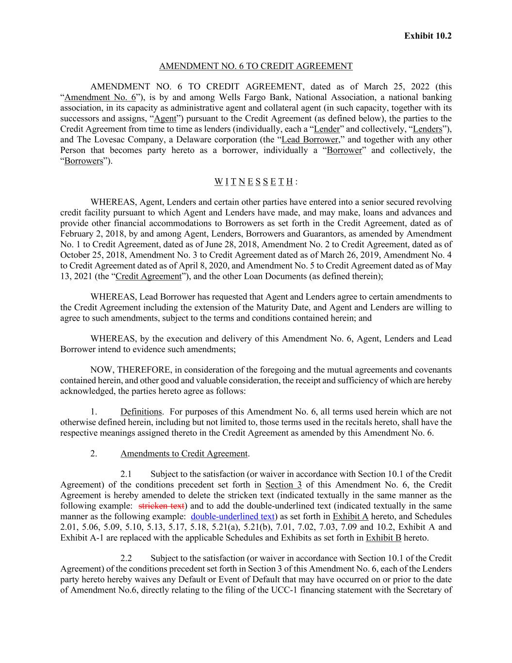 Exhibit 10.2 AMENDMENT NO. 6 TO CREDIT AGREEMENT AMENDMENT NO. 6 TO CREDIT AGREEMENT, dated as of March 25, 2022 (this “Amendment No. 6”), is by and among Wells Fargo Bank, National Association, a national banking association, in its capacity as administrative agent and collateral agent (in such capacity, together with its successors and assigns, “Agent”) pursuant to the Credit Agreement (as defined below), the parties to the Credit Agreement from time to time as lenders (individually, each a “Lender” and collectively, “Lenders”), and The Lovesac Company, a Delaware corporation (the “Lead Borrower,” and together with any other Person that becomes party hereto as a borrower, individually a “Borrower” and collectively, the “Borrowers”). W I T N E S S E T H : WHEREAS, Agent, Lenders and certain other parties have entered into a senior secured revolving credit facility pursuant to which Agent and Lenders have made, and may make, loans and advances and provide other financial accommodations to Borrowers as set forth in the Credit Agreement, dated as of February 2, 2018, by and among Agent, Lenders, Borrowers and Guarantors, as amended by Amendment No. 1 to Credit Agreement, dated as of June 28, 2018, Amendment No. 2 to Credit Agreement, dated as of October 25, 2018, Amendment No. 3 to Credit Agreement dated as of March 26, 2019, Amendment No. 4 to Credit Agreement dated as of April 8, 2020, and Amendment No. 5 to Credit Agreement dated as of May 13, 2021 (the “Credit Agreement”), and the other Loan Documents (as defined therein); WHEREAS, Lead Borrower has requested that Agent and Lenders agree to certain amendments to the Credit Agreement including the extension of the Maturity Date, and Agent and Lenders are willing to agree to such amendments, subject to the terms and conditions contained herein; and WHEREAS, by the execution and delivery of this Amendment No. 6, Agent, Lenders and Lead Borrower intend to evidence such amendments; NOW, THEREFORE, in consideration of the foregoing and the mutual agreements and covenants contained herein, and other good and valuable consideration, the receipt and sufficiency of which are hereby acknowledged, the parties hereto agree as follows: 1. Definitions. For purposes of this Amendment No. 6, all terms used herein which are not otherwise defined herein, including but not limited to, those terms used in the recitals hereto, shall have the respective meanings assigned thereto in the Credit Agreement as amended by this Amendment No. 6. 2. Amendments to Credit Agreement. 2.1 Subject to the satisfaction (or waiver in accordance with Section 10.1 of the Credit Agreement) of the conditions precedent set forth in Section 3 of this Amendment No. 6, the Credit Agreement is hereby amended to delete the stricken text (indicated textually in the same manner as the following example: stricken text) and to add the double-underlined text (indicated textually in the same manner as the following example: double-underlined text) as set forth in Exhibit A hereto, and Schedules 2.01, 5.06, 5.09, 5.10, 5.13, 5.17, 5.18, 5.21(a), 5.21(b), 7.01, 7.02, 7.03, 7.09 and 10.2, Exhibit A and Exhibit A-1 are replaced with the applicable Schedules and Exhibits as set forth in Exhibit B hereto. 2.2 Subject to the satisfaction (or waiver in accordance with Section 10.1 of the Credit Agreement) of the conditions precedent set forth in Section 3 of this Amendment No. 6, each of the Lenders party hereto hereby waives any Default or Event of Default that may have occurred on or prior to the date of Amendment No.6, directly relating to the filing of the UCC-1 financing statement with the Secretary of