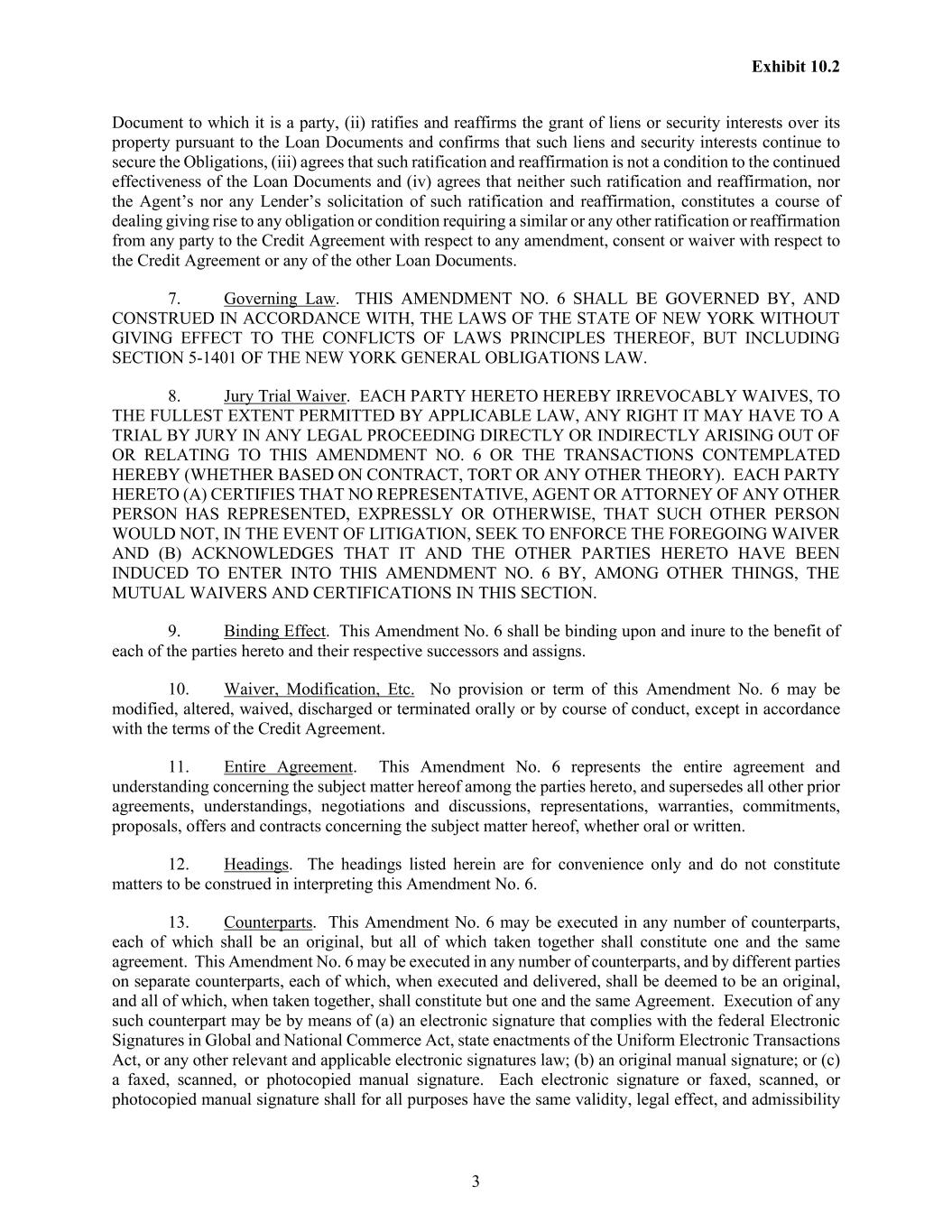 Exhibit 10.2 3 Document to which it is a party, (ii) ratifies and reaffirms the grant of liens or security interests over its property pursuant to the Loan Documents and confirms that such liens and security interests continue to secure the Obligations, (iii) agrees that such ratification and reaffirmation is not a condition to the continued effectiveness of the Loan Documents and (iv) agrees that neither such ratification and reaffirmation, nor the Agent’s nor any Lender’s solicitation of such ratification and reaffirmation, constitutes a course of dealing giving rise to any obligation or condition requiring a similar or any other ratification or reaffirmation from any party to the Credit Agreement with respect to any amendment, consent or waiver with respect to the Credit Agreement or any of the other Loan Documents. 7. Governing Law. THIS AMENDMENT NO. 6 SHALL BE GOVERNED BY, AND CONSTRUED IN ACCORDANCE WITH, THE LAWS OF THE STATE OF NEW YORK WITHOUT GIVING EFFECT TO THE CONFLICTS OF LAWS PRINCIPLES THEREOF, BUT INCLUDING SECTION 5-1401 OF THE NEW YORK GENERAL OBLIGATIONS LAW. 8. Jury Trial Waiver. EACH PARTY HERETO HEREBY IRREVOCABLY WAIVES, TO THE FULLEST EXTENT PERMITTED BY APPLICABLE LAW, ANY RIGHT IT MAY HAVE TO A TRIAL BY JURY IN ANY LEGAL PROCEEDING DIRECTLY OR INDIRECTLY ARISING OUT OF OR RELATING TO THIS AMENDMENT NO. 6 OR THE TRANSACTIONS CONTEMPLATED HEREBY (WHETHER BASED ON CONTRACT, TORT OR ANY OTHER THEORY). EACH PARTY HERETO (A) CERTIFIES THAT NO REPRESENTATIVE, AGENT OR ATTORNEY OF ANY OTHER PERSON HAS REPRESENTED, EXPRESSLY OR OTHERWISE, THAT SUCH OTHER PERSON WOULD NOT, IN THE EVENT OF LITIGATION, SEEK TO ENFORCE THE FOREGOING WAIVER AND (B) ACKNOWLEDGES THAT IT AND THE OTHER PARTIES HERETO HAVE BEEN INDUCED TO ENTER INTO THIS AMENDMENT NO. 6 BY, AMONG OTHER THINGS, THE MUTUAL WAIVERS AND CERTIFICATIONS IN THIS SECTION. 9. Binding Effect. This Amendment No. 6 shall be binding upon and inure to the benefit of each of the parties hereto and their respective successors and assigns. 10. Waiver, Modification, Etc. No provision or term of this Amendment No. 6 may be modified, altered, waived, discharged or terminated orally or by course of conduct, except in accordance with the terms of the Credit Agreement. 11. Entire Agreement. This Amendment No. 6 represents the entire agreement and understanding concerning the subject matter hereof among the parties hereto, and supersedes all other prior agreements, understandings, negotiations and discussions, representations, warranties, commitments, proposals, offers and contracts concerning the subject matter hereof, whether oral or written. 12. Headings. The headings listed herein are for convenience only and do not constitute matters to be construed in interpreting this Amendment No. 6. 13. Counterparts. This Amendment No. 6 may be executed in any number of counterparts, each of which shall be an original, but all of which taken together shall constitute one and the same agreement. This Amendment No. 6 may be executed in any number of counterparts, and by different parties on separate counterparts, each of which, when executed and delivered, shall be deemed to be an original, and all of which, when taken together, shall constitute but one and the same Agreement. Execution of any such counterpart may be by means of (a) an electronic signature that complies with the federal Electronic Signatures in Global and National Commerce Act, state enactments of the Uniform Electronic Transactions Act, or any other relevant and applicable electronic signatures law; (b) an original manual signature; or (c) a faxed, scanned, or photocopied manual signature. Each electronic signature or faxed, scanned, or photocopied manual signature shall for all purposes have the same validity, legal effect, and admissibility