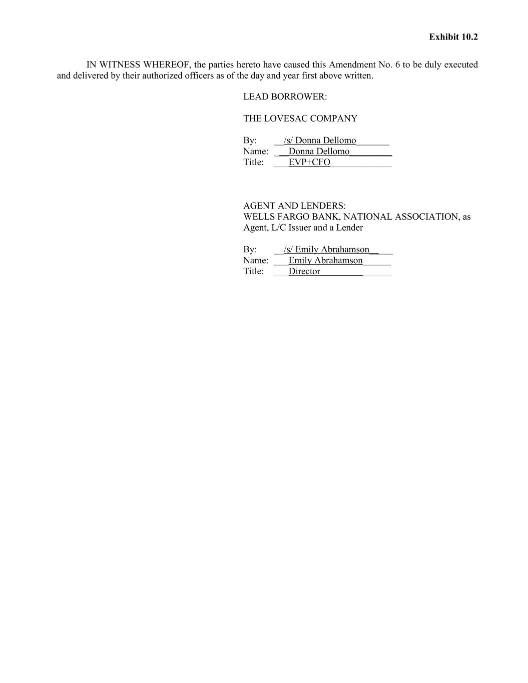 Exhibit 10.2 IN WITNESS WHEREOF, the parties hereto have caused this Amendment No. 6 to be duly executed and delivered by their authorized officers as of the day and year first above written. LEAD BORROWER: THE LOVESAC COMPANY By: __/s/ Donna Dellomo_______ Name: ___Donna Dellomo_________ Title: ___EVP+CFO_____________ AGENT AND LENDERS: WELLS FARGO BANK, NATIONAL ASSOCIATION, as Agent, L/C Issuer and a Lender By: __/s/ Emily Abrahamson_____ Name: ___Emily Abrahamson______ Title: ___Director_______________
