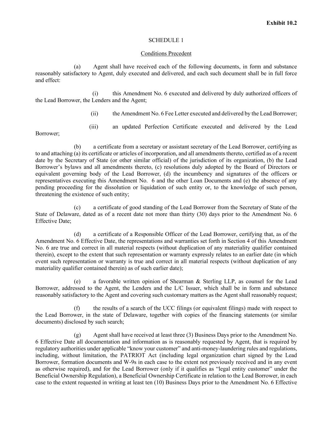 Exhibit 10.2 SCHEDULE 1 Conditions Precedent (a) Agent shall have received each of the following documents, in form and substance reasonably satisfactory to Agent, duly executed and delivered, and each such document shall be in full force and effect: (i) this Amendment No. 6 executed and delivered by duly authorized officers of the Lead Borrower, the Lenders and the Agent; (ii) the Amendment No. 6 Fee Letter executed and delivered by the Lead Borrower; (iii) an updated Perfection Certificate executed and delivered by the Lead Borrower; (b) a certificate from a secretary or assistant secretary of the Lead Borrower, certifying as to and attaching (a) its certificate or articles of incorporation, and all amendments thereto, certified as of a recent date by the Secretary of State (or other similar official) of the jurisdiction of its organization, (b) the Lead Borrower’s bylaws and all amendments thereto, (c) resolutions duly adopted by the Board of Directors or equivalent governing body of the Lead Borrower, (d) the incumbency and signatures of the officers or representatives executing this Amendment No. 6 and the other Loan Documents and (e) the absence of any pending proceeding for the dissolution or liquidation of such entity or, to the knowledge of such person, threatening the existence of such entity; (c) a certificate of good standing of the Lead Borrower from the Secretary of State of the State of Delaware, dated as of a recent date not more than thirty (30) days prior to the Amendment No. 6 Effective Date; (d) a certificate of a Responsible Officer of the Lead Borrower, certifying that, as of the Amendment No. 6 Effective Date, the representations and warranties set forth in Section 4 of this Amendment No. 6 are true and correct in all material respects (without duplication of any materiality qualifier contained therein), except to the extent that such representation or warranty expressly relates to an earlier date (in which event such representation or warranty is true and correct in all material respects (without duplication of any materiality qualifier contained therein) as of such earlier date); (e) a favorable written opinion of Shearman & Sterling LLP, as counsel for the Lead Borrower, addressed to the Agent, the Lenders and the L/C Issuer, which shall be in form and substance reasonably satisfactory to the Agent and covering such customary matters as the Agent shall reasonably request; (f) the results of a search of the UCC filings (or equivalent filings) made with respect to the Lead Borrower, in the state of Delaware, together with copies of the financing statements (or similar documents) disclosed by such search; (g) Agent shall have received at least three (3) Business Days prior to the Amendment No. 6 Effective Date all documentation and information as is reasonably requested by Agent, that is required by regulatory authorities under applicable “know your customer” and anti-money-laundering rules and regulations, including, without limitation, the PATRIOT Act (including legal organization chart signed by the Lead Borrower, formation documents and W-9s in each case to the extent not previously received and in any event as otherwise required), and for the Lead Borrower (only if it qualifies as “legal entity customer” under the Beneficial Ownership Regulation), a Beneficial Ownership Certificate in relation to the Lead Borrower, in each case to the extent requested in writing at least ten (10) Business Days prior to the Amendment No. 6 Effective
