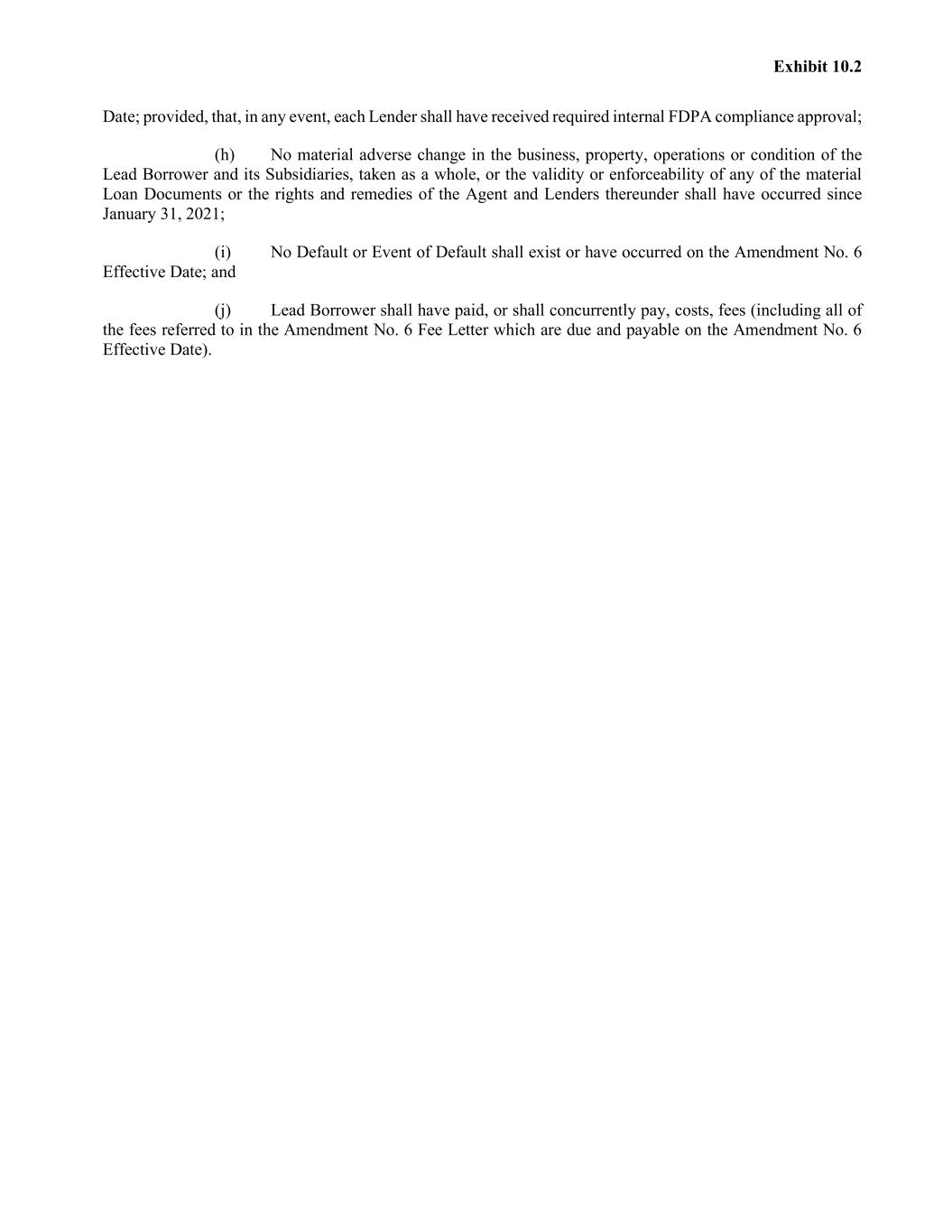 Exhibit 10.2 Date; provided, that, in any event, each Lender shall have received required internal FDPA compliance approval; (h) No material adverse change in the business, property, operations or condition of the Lead Borrower and its Subsidiaries, taken as a whole, or the validity or enforceability of any of the material Loan Documents or the rights and remedies of the Agent and Lenders thereunder shall have occurred since January 31, 2021; (i) No Default or Event of Default shall exist or have occurred on the Amendment No. 6 Effective Date; and (j) Lead Borrower shall have paid, or shall concurrently pay, costs, fees (including all of the fees referred to in the Amendment No. 6 Fee Letter which are due and payable on the Amendment No. 6 Effective Date).