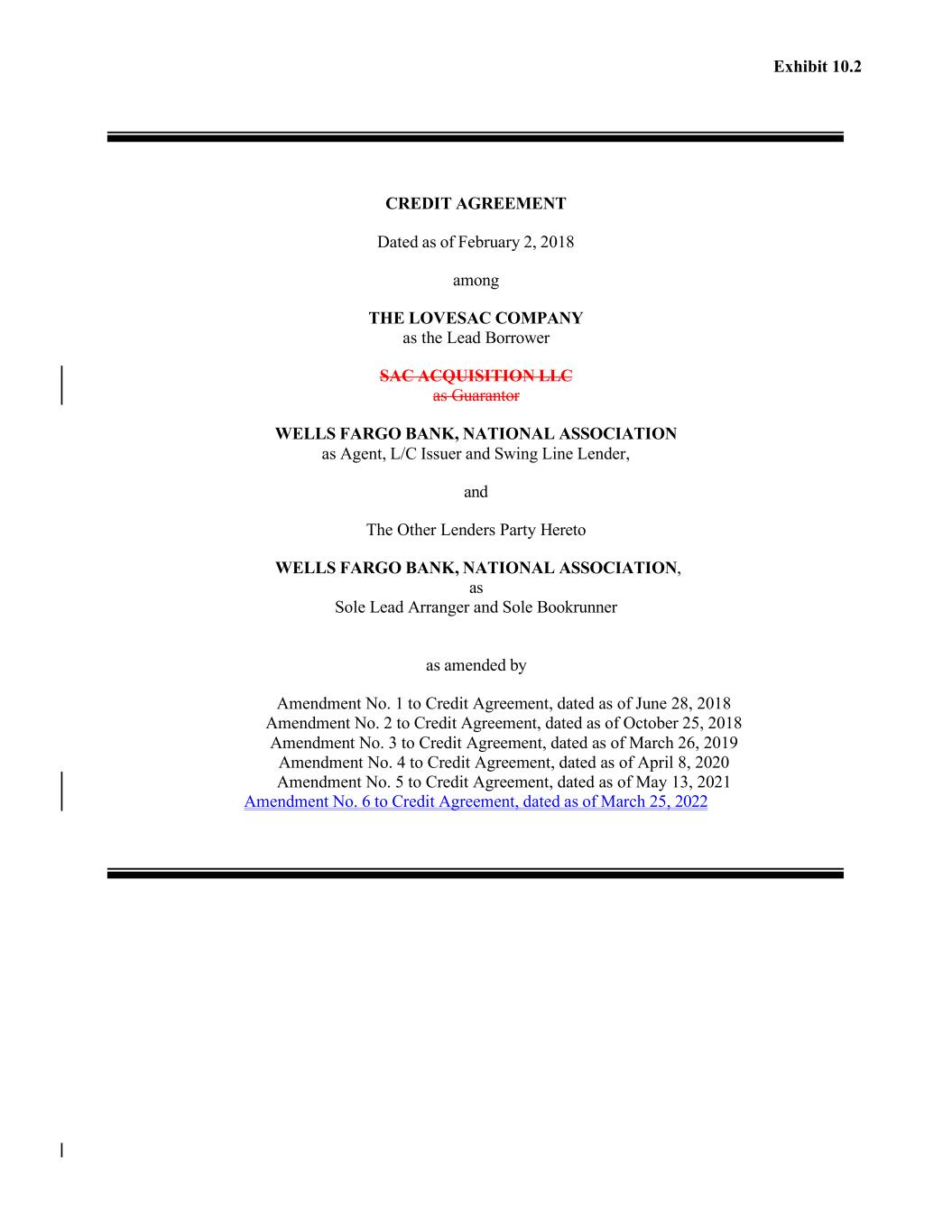 Exhibit 10.2 CREDIT AGREEMENT Dated as of February 2, 2018 among THE LOVESAC COMPANY as the Lead Borrower SAC ACQUISITION LLC as Guarantor WELLS FARGO BANK, NATIONAL ASSOCIATION as Agent, L/C Issuer and Swing Line Lender, and The Other Lenders Party Hereto WELLS FARGO BANK, NATIONAL ASSOCIATION, as Sole Lead Arranger and Sole Bookrunner as amended by Amendment No. 1 to Credit Agreement, dated as of June 28, 2018 Amendment No. 2 to Credit Agreement, dated as of October 25, 2018 Amendment No. 3 to Credit Agreement, dated as of March 26, 2019 Amendment No. 4 to Credit Agreement, dated as of April 8, 2020 Amendment No. 5 to Credit Agreement, dated as of May 13, 2021 Amendment No. 6 to Credit Agreement, dated as of March 25, 2022