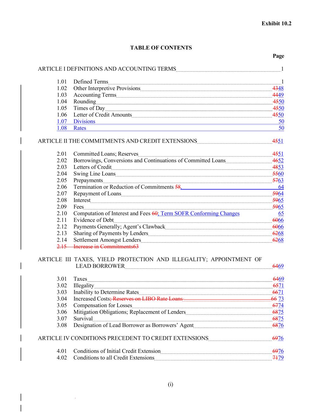 Exhibit 10.2 TABLE OF CONTENTS Page ARTICLE I DEFINITIONS AND ACCOUNTING TERMS 1 1.01 Defined Terms 1 1.02 Other Interpretive Provisions 4348 1.03 Accounting Terms 4449 1.04 Rounding 4550 1.05 Times of Day 4550 1.06 Letter of Credit Amounts 4550 1.07 Divisions 50 1.08 Rates 50 ARTICLE II THE COMMITMENTS AND CREDIT EXTENSIONS 4551 2.01 Committed Loans; Reserves 4551 2.02 Borrowings, Conversions and Continuations of Committed Loans 4652 2.03 Letters of Credit 4853 2.04 Swing Line Loans 5560 2.05 Prepayments 5763 2.06 Termination or Reduction of Commitments 58. 64 2.07 Repayment of Loans 5964 2.08 Interest 5965 2.09 Fees 5965 2.10 Computation of Interest and Fees 60; Term SOFR Conforming Changes 65 2.11 Evidence of Debt 6066 2.12 Payments Generally; Agent’s Clawback 6066 2.13 Sharing of Payments by Lenders 6268 2.14 Settlement Amongst Lenders 6268 2.15 Increase in Commitments63 ARTICLE III TAXES, YIELD PROTECTION AND ILLEGALITY; APPOINTMENT OF LEAD BORROWER 6469 3.01 Taxes 6469 3.02 Illegality 6571 3.03 Inability to Determine Rates 6671 3.04 Increased Costs; Reserves on LIBO Rate Loans 66 73 3.05 Compensation for Losses 6774 3.06 Mitigation Obligations; Replacement of Lenders 6875 3.07 Survival 6875 3.08 Designation of Lead Borrower as Borrowers’ Agent 6876 ARTICLE IV CONDITIONS PRECEDENT TO CREDIT EXTENSIONS 6976 4.01 Conditions of Initial Credit Extension 6976 4.02 Conditions to all Credit Extensions 7179 (i)