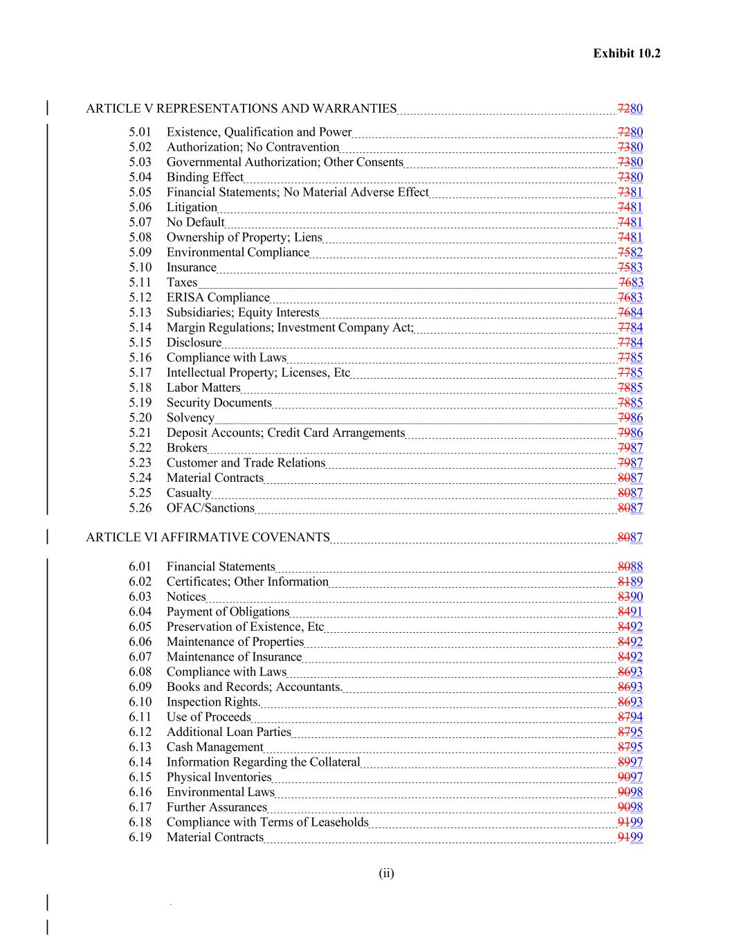 Exhibit 10.2 ARTICLE V REPRESENTATIONS AND WARRANTIES 7280 5.01 Existence, Qualification and Power 7280 5.02 Authorization; No Contravention 7380 5.03 Governmental Authorization; Other Consents 7380 5.04 Binding Effect 7380 5.05 Financial Statements; No Material Adverse Effect 7381 5.06 Litigation 7481 5.07 No Default 7481 5.08 Ownership of Property; Liens 7481 5.09 Environmental Compliance 7582 5.10 Insurance 7583 5.11 Taxes 7683 5.12 ERISA Compliance 7683 5.13 Subsidiaries; Equity Interests 7684 5.14 Margin Regulations; Investment Company Act; 7784 5.15 Disclosure 7784 5.16 Compliance with Laws 7785 5.17 Intellectual Property; Licenses, Etc 7785 5.18 Labor Matters 7885 5.19 Security Documents 7885 5.20 Solvency 7986 5.21 Deposit Accounts; Credit Card Arrangements 7986 5.22 Brokers 7987 5.23 Customer and Trade Relations 7987 5.24 Material Contracts 8087 5.25 Casualty 8087 5.26 OFAC/Sanctions 8087 ARTICLE VI AFFIRMATIVE COVENANTS 8087 6.01 Financial Statements 8088 6.02 Certificates; Other Information 8189 6.03 Notices 8390 6.04 Payment of Obligations 8491 6.05 Preservation of Existence, Etc 8492 6.06 Maintenance of Properties 8492 6.07 Maintenance of Insurance 8492 6.08 Compliance with Laws 8693 6.09 Books and Records; Accountants. 8693 6.10 Inspection Rights. 8693 6.11 Use of Proceeds 8794 6.12 Additional Loan Parties 8795 6.13 Cash Management 8795 6.14 Information Regarding the Collateral 8997 6.15 Physical Inventories 9097 6.16 Environmental Laws 9098 6.17 Further Assurances 9098 6.18 Compliance with Terms of Leaseholds 9199 6.19 Material Contracts 9199 (ii)