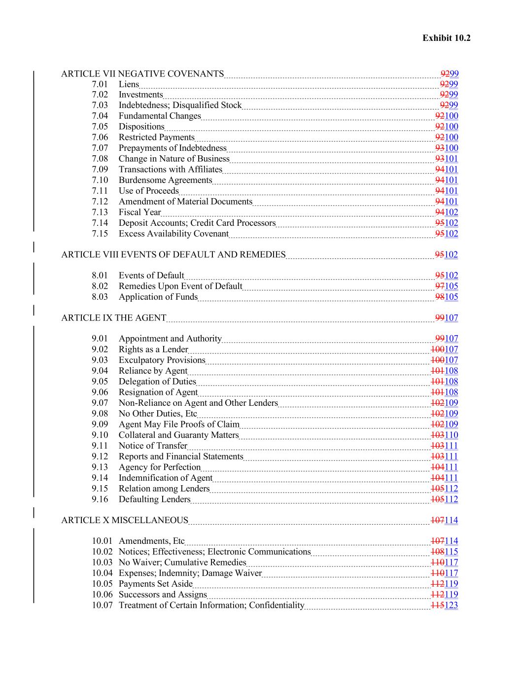 Exhibit 10.2 ARTICLE VII NEGATIVE COVENANTS 9299 7.01 Liens 9299 7.02 Investments 9299 7.03 Indebtedness; Disqualified Stock 9299 7.04 Fundamental Changes 92100 7.05 Dispositions 92100 7.06 Restricted Payments 92100 7.07 Prepayments of Indebtedness 93100 7.08 Change in Nature of Business 93101 7.09 Transactions with Affiliates 94101 7.10 Burdensome Agreements 94101 7.11 Use of Proceeds 94101 7.12 Amendment of Material Documents 94101 7.13 Fiscal Year 94102 7.14 Deposit Accounts; Credit Card Processors 95102 7.15 Excess Availability Covenant 95102 ARTICLE VIII EVENTS OF DEFAULT AND REMEDIES 95102 8.01 Events of Default 95102 8.02 Remedies Upon Event of Default 97105 8.03 Application of Funds 98105 ARTICLE IX THE AGENT 99107 9.01 Appointment and Authority 99107 9.02 Rights as a Lender 100107 9.03 Exculpatory Provisions 100107 9.04 Reliance by Agent 101108 9.05 Delegation of Duties 101108 9.06 Resignation of Agent 101108 9.07 Non-Reliance on Agent and Other Lenders 102109 9.08 No Other Duties, Etc 102109 9.09 Agent May File Proofs of Claim 102109 9.10 Collateral and Guaranty Matters 103110 9.11 Notice of Transfer 103111 9.12 Reports and Financial Statements 103111 9.13 Agency for Perfection 104111 9.14 Indemnification of Agent 104111 9.15 Relation among Lenders 105112 9.16 Defaulting Lenders 105112 ARTICLE X MISCELLANEOUS 107114 10.01 Amendments, Etc 107114 10.02 Notices; Effectiveness; Electronic Communications 108115 10.03 No Waiver; Cumulative Remedies 110117 10.04 Expenses; Indemnity; Damage Waiver 110117 10.05 Payments Set Aside 112119 10.06 Successors and Assigns 112119 10.07 Treatment of Certain Information; Confidentiality 115123
