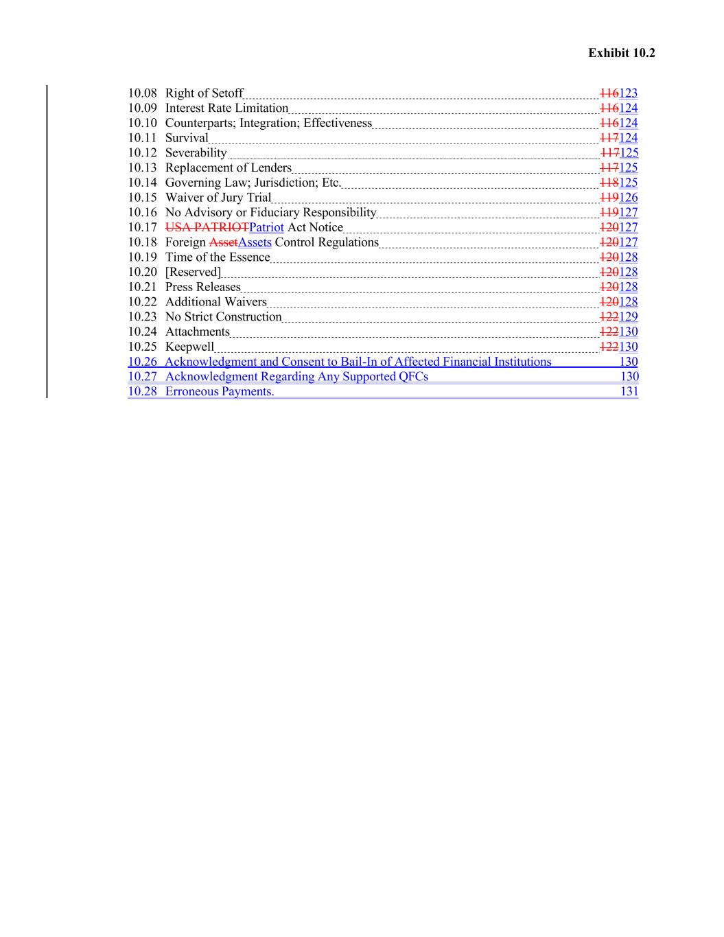 Exhibit 10.2 10.08 Right of Setoff 116123 10.09 Interest Rate Limitation 116124 10.10 Counterparts; Integration; Effectiveness 116124 10.11 Survival 117124 10.12 Severability 117125 10.13 Replacement of Lenders 117125 10.14 Governing Law; Jurisdiction; Etc. 118125 10.15 Waiver of Jury Trial 119126 10.16 No Advisory or Fiduciary Responsibility 119127 10.17 USA PATRIOTPatriot Act Notice 120127 10.18 Foreign AssetAssets Control Regulations 120127 10.19 Time of the Essence 120128 10.20 [Reserved] 120128 10.21 Press Releases 120128 10.22 Additional Waivers 120128 10.23 No Strict Construction 122129 10.24 Attachments 122130 10.25 Keepwell 122130 10.26 Acknowledgment and Consent to Bail-In of Affected Financial Institutions 130 10.27 Acknowledgment Regarding Any Supported QFCs 130 10.28 Erroneous Payments. 131