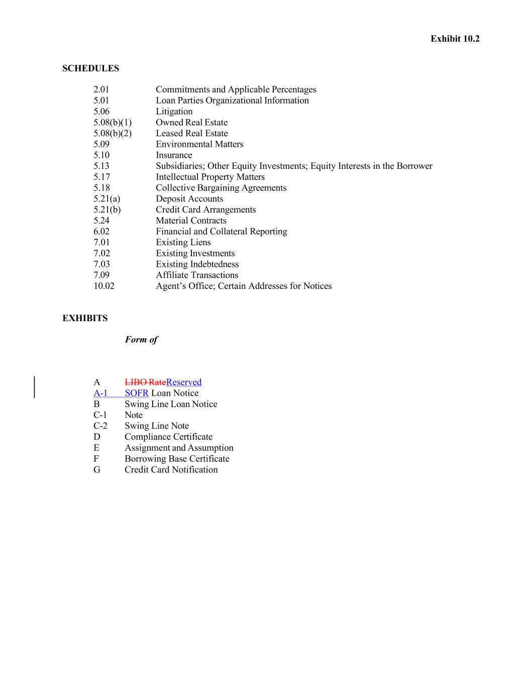 Exhibit 10.2 SCHEDULES 2.01 Commitments and Applicable Percentages 5.01 Loan Parties Organizational Information 5.06 Litigation 5.08(b)(1) Owned Real Estate 5.08(b)(2) Leased Real Estate 5.09 Environmental Matters 5.10 Insurance 5.13 Subsidiaries; Other Equity Investments; Equity Interests in the Borrower 5.17 Intellectual Property Matters 5.18 Collective Bargaining Agreements 5.21(a) Deposit Accounts 5.21(b) Credit Card Arrangements 5.24 Material Contracts 6.02 Financial and Collateral Reporting 7.01 Existing Liens 7.02 Existing Investments 7.03 Existing Indebtedness 7.09 Affiliate Transactions 10.02 Agent’s Office; Certain Addresses for Notices EXHIBITS Form of A LIBO RateReserved A-1 SOFR Loan Notice B Swing Line Loan Notice C-1 Note C-2 Swing Line Note D Compliance Certificate E Assignment and Assumption F Borrowing Base Certificate G Credit Card Notification