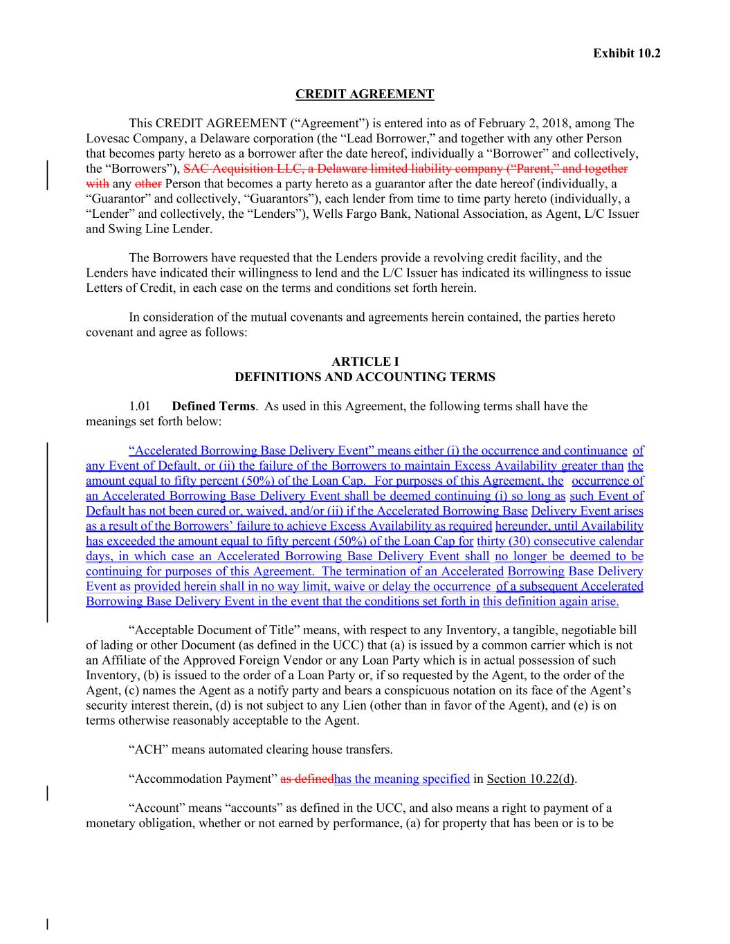 13 Exhibit 10.2 (c) (d) any “change in control” or “sale” or “disposition” or similar event as defined in any document governing Material Indebtedness of any Loan Party; or (d) (e) the ParentLead Borrower fails at any time to own, directly or indirectly, one hundred percent (100%) of the Equity Interests of each other Loan Party free and clear of all Liens (other than the Liens in favor of the Agent), except where such failure is as a result of a transaction permitted by the Loan Documents. “Closing Date” means the first date all the conditions precedent in Section 4.01 are satisfied or waived in accordance with Section 10.01. “Code” means the Internal Revenue Code of 1986, and the regulations promulgated thereunder, as amended and in effect. “Collateral” means any and all “Collateral” as defined in any applicable Security Document and all other property that is or is intended under the terms of the Security Documents to be subject to Liens in favor of the Agent. “Collateral Access Agreement” means an agreement reasonably satisfactory in form and substance to the Agent executed and delivered by (a) a bailee or other Person in possession of Collateral, and (b) any landlord of Real Estate leased by any Loan Party where books and records or Collateral included in the Borrowing Base is located. “Collection Account” means any Deposit Account of a Loan Party that at any time receives, or is otherwise established for the purpose of receiving, payments in respect of Credit Card Receivables, Accounts or other proceeds of any Collateral, including, without limitation, the Deposit Accounts designated as Collection Accounts in Schedule 5.21(a). “Commercial Letter of Credit” means any Letter of Credit issued for the purpose of providing the primary payment mechanism in connection with the purchase of any materials, goods or services by a Loan Party in the ordinary course of business of such Loan Party. “Commercial Letter of Credit Agreement” means the Commercial Letter of Credit Agreementcommercial letter of credit agreement relating to the issuance of a Commercial Letter of Credit in substantially the form from time to time in use by the L/C Issuer. “Commitment” means, as to each Lender, its obligation to (a) make Committed Loans to the Borrowers pursuant to Section 2.01, (b) purchase participations in L/C Obligations, and (c) purchase participations in Swing Line Loans, in an aggregate principal amount at any one time outstanding not to exceed the amount set forth opposite such Lender’s name on Schedule 2.01 or in the Assignment and Assumption pursuant to which such Lender becomes a party hereto, as applicable, as such amount may be adjusted from time to time in accordance with this Agreement. “Committed Borrowing” means a borrowing consisting of simultaneous Committed Loans of the same Type and, in the case of LIBO RateSOFR Loans, having the same Interest Period made by each of the Lenders pursuant to Section 2.01. “Committed Increase” has the meaning specified in Section 2.15(a). “Committed Loan” has the meaning specified in Section 2.01(a). “Commodity Exchange Act” means the Commodity Exchange Act (7 U.S.C. § 1 et seq.), as amended from time to time, and any successor statute.