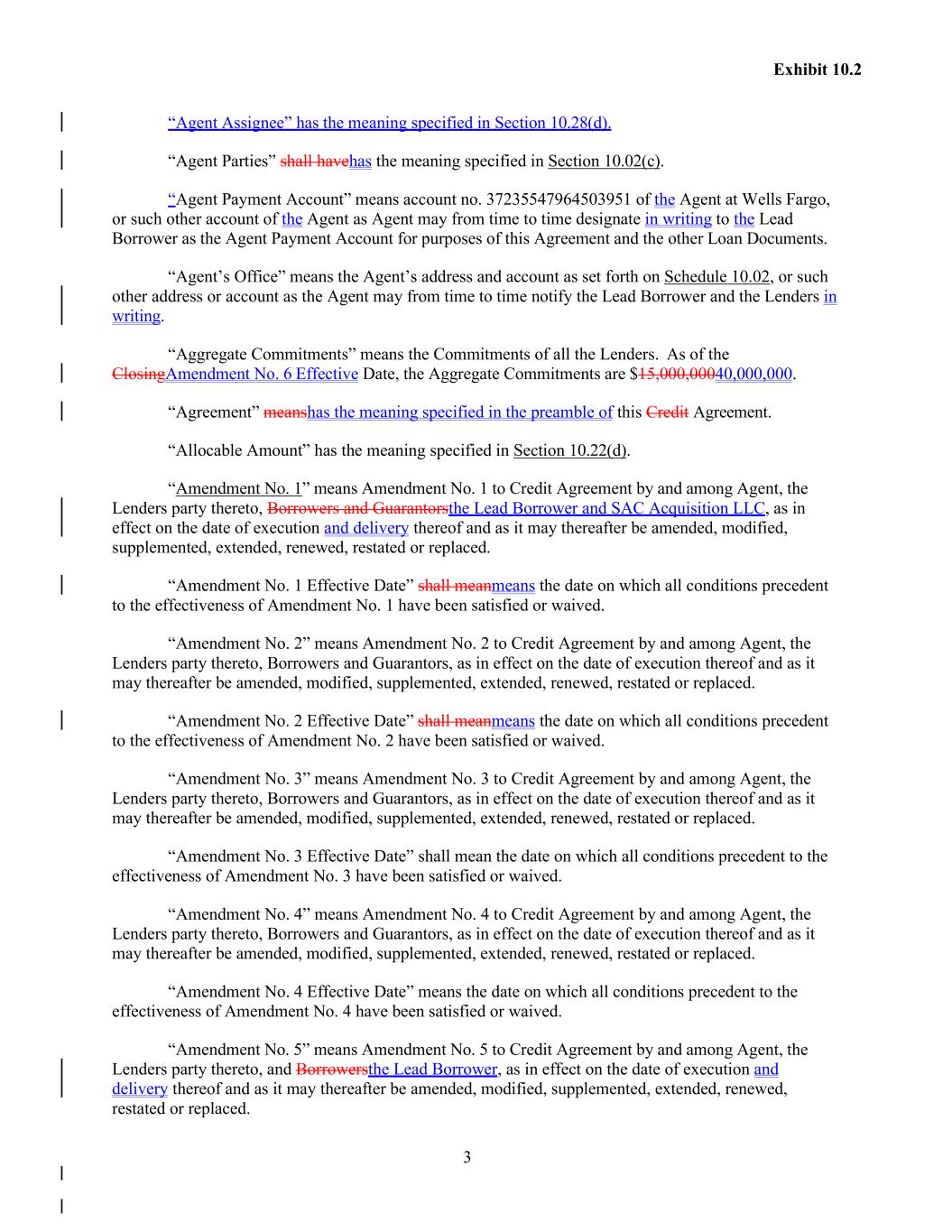 3 Exhibit 10.2 “Agent Assignee” has the meaning specified in Section 10.28(d). “Agent Parties” shall havehas the meaning specified in Section 10.02(c). “Agent Payment Account” means account no. 37235547964503951 of the Agent at Wells Fargo, or such other account of the Agent as Agent may from time to time designate in writing to the Lead Borrower as the Agent Payment Account for purposes of this Agreement and the other Loan Documents. “Agent’s Office” means the Agent’s address and account as set forth on Schedule 10.02, or such other address or account as the Agent may from time to time notify the Lead Borrower and the Lenders in writing. “Aggregate Commitments” means the Commitments of all the Lenders. As of the ClosingAmendment No. 6 Effective Date, the Aggregate Commitments are $15,000,00040,000,000. “Agreement” meanshas the meaning specified in the preamble of this Credit Agreement. “Allocable Amount” has the meaning specified in Section 10.22(d). “Amendment No. 1” means Amendment No. 1 to Credit Agreement by and among Agent, the Lenders party thereto, Borrowers and Guarantorsthe Lead Borrower and SAC Acquisition LLC, as in effect on the date of execution and delivery thereof and as it may thereafter be amended, modified, supplemented, extended, renewed, restated or replaced. “Amendment No. 1 Effective Date” shall meanmeans the date on which all conditions precedent to the effectiveness of Amendment No. 1 have been satisfied or waived. “Amendment No. 2” means Amendment No. 2 to Credit Agreement by and among Agent, the Lenders party thereto, Borrowers and Guarantors, as in effect on the date of execution thereof and as it may thereafter be amended, modified, supplemented, extended, renewed, restated or replaced. “Amendment No. 2 Effective Date” shall meanmeans the date on which all conditions precedent to the effectiveness of Amendment No. 2 have been satisfied or waived. “Amendment No. 3” means Amendment No. 3 to Credit Agreement by and among Agent, the Lenders party thereto, Borrowers and Guarantors, as in effect on the date of execution thereof and as it may thereafter be amended, modified, supplemented, extended, renewed, restated or replaced. “Amendment No. 3 Effective Date” shall mean the date on which all conditions precedent to the effectiveness of Amendment No. 3 have been satisfied or waived. “Amendment No. 4” means Amendment No. 4 to Credit Agreement by and among Agent, the Lenders party thereto, Borrowers and Guarantors, as in effect on the date of execution thereof and as it may thereafter be amended, modified, supplemented, extended, renewed, restated or replaced. “Amendment No. 4 Effective Date” means the date on which all conditions precedent to the effectiveness of Amendment No. 4 have been satisfied or waived. “Amendment No. 5” means Amendment No. 5 to Credit Agreement by and among Agent, the Lenders party thereto, and Borrowersthe Lead Borrower, as in effect on the date of execution and delivery thereof and as it may thereafter be amended, modified, supplemented, extended, renewed, restated or replaced.