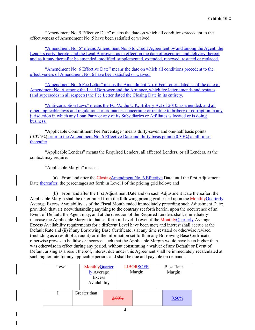 4 Exhibit 10.2 “Amendment No. 5 Effective Date” means the date on which all conditions precedent to the effectiveness of Amendment No. 5 have been satisfied or waived. “Amendment No. 6” means Amendment No. 6 to Credit Agreement by and among the Agent, the Lenders party thereto, and the Lead Borrower, as in effect on the date of execution and delivery thereof and as it may thereafter be amended, modified, supplemented, extended, renewed, restated or replaced. “Amendment No. 6 Effective Date” means the date on which all conditions precedent to the effectiveness of Amendment No. 6 have been satisfied or waived. “Amendment No. 6 Fee Letter” means the Amendment No. 6 Fee Letter, dated as of the date of Amendment No. 6, among the Lead Borrower and the Arranger, which fee letter amends and restates (and supersedes in all respects) the Fee Letter dated the Closing Date in its entirety. “Anti-corruption Laws” means the FCPA, the U.K. Bribery Act of 2010, as amended, and all other applicable laws and regulations or ordinances concerning or relating to bribery or corruption in any jurisdiction in which any Loan Party or any of its Subsidiaries or Affiliates is located or is doing business. “Applicable Commitment Fee Percentage” means thirty-seven and one-half basis points (0.375%) prior to the Amendment No. 6 Effective Date and thirty basis points (0.30%) at all times thereafter. “Applicable Lenders” means the Required Lenders, all affected Lenders, or all Lenders, as the context may require. “Applicable Margin” means: (a) From and after the ClosingAmendment No. 6 Effective Date until the first Adjustment Date thereafter, the percentages set forth in Level I of the pricing grid below; and (b) From and after the first Adjustment Date and on each Adjustment Date thereafter, the Applicable Margin shall be determined from the following pricing grid based upon the MonthlyQuarterly Average Excess Availability as of the Fiscal Month ended immediately preceding such Adjustment Date; provided, that, (i) notwithstanding anything to the contrary set forth herein, upon the occurrence of an Event of Default, the Agent may, and at the direction of the Required Lenders shall, immediately increase the Applicable Margin to that set forth in Level II (even if the MonthlyQuarterly Average Excess Availability requirements for a different Level have been met) and interest shall accrue at the Default Rate and (ii) if any Borrowing Base Certificate is at any time restated or otherwise revised (including as a result of an audit) or if the information set forth in any Borrowing Base Certificate otherwise proves to be false or incorrect such that the Applicable Margin would have been higher than was otherwise in effect during any period, without constituting a waiver of any Default or Event of Default arising as a result thereof, interest due under this Agreement shall be immediately recalculated at such higher rate for any applicable periods and shall be due and payable on demand. Level MonthlyQuarter ly Average Excess Availability LIBORSOFR Margin Base Rate Margin I Greater than 2.00% 0.50%