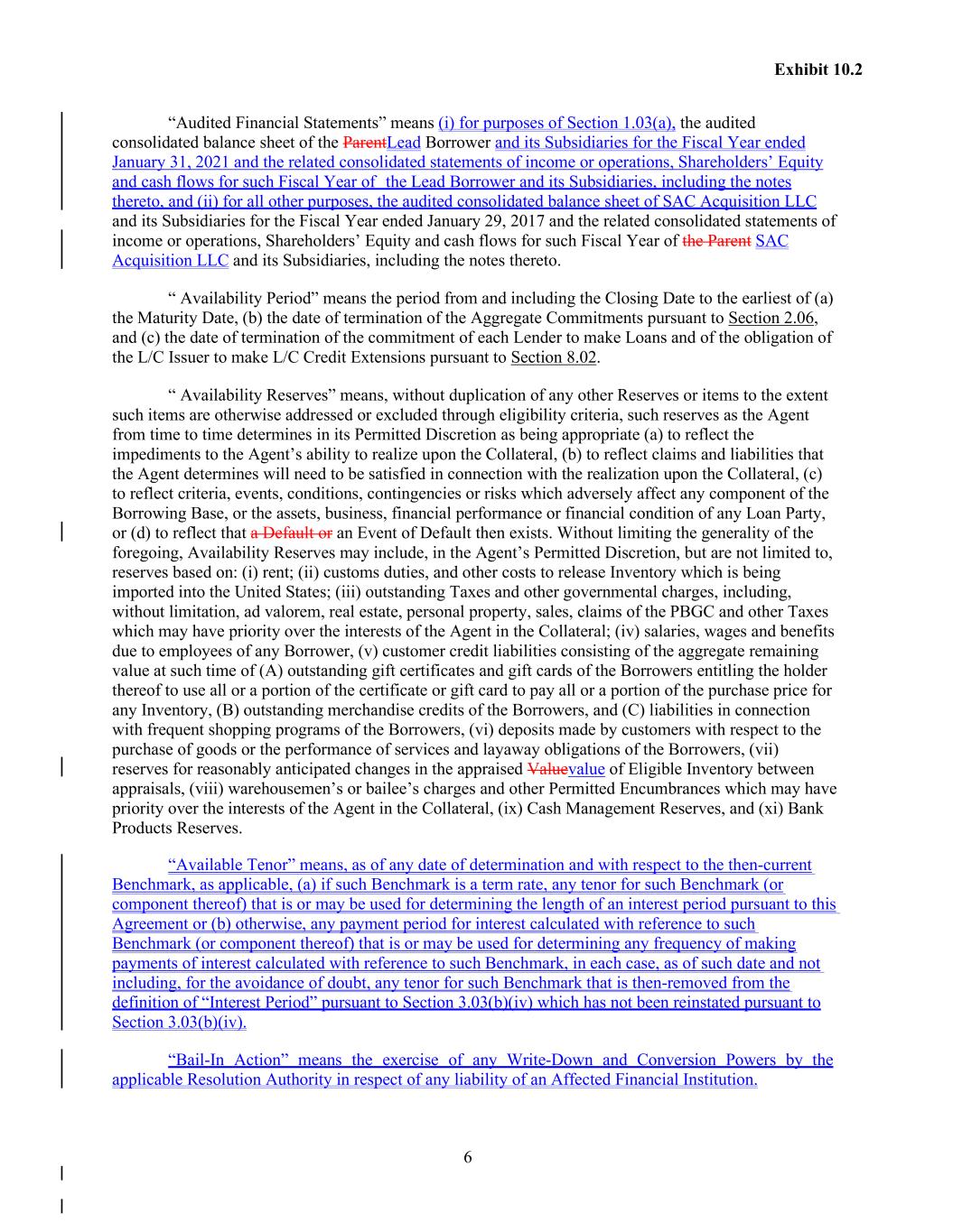 6 Exhibit 10.2 “Audited Financial Statements” means (i) for purposes of Section 1.03(a), the audited consolidated balance sheet of the ParentLead Borrower and its Subsidiaries for the Fiscal Year ended January 31, 2021 and the related consolidated statements of income or operations, Shareholders’ Equity and cash flows for such Fiscal Year of the Lead Borrower and its Subsidiaries, including the notes thereto, and (ii) for all other purposes, the audited consolidated balance sheet of SAC Acquisition LLC and its Subsidiaries for the Fiscal Year ended January 29, 2017 and the related consolidated statements of income or operations, Shareholders’ Equity and cash flows for such Fiscal Year of the Parent SAC Acquisition LLC and its Subsidiaries, including the notes thereto. “ Availability Period” means the period from and including the Closing Date to the earliest of (a) the Maturity Date, (b) the date of termination of the Aggregate Commitments pursuant to Section 2.06, and (c) the date of termination of the commitment of each Lender to make Loans and of the obligation of the L/C Issuer to make L/C Credit Extensions pursuant to Section 8.02. “ Availability Reserves” means, without duplication of any other Reserves or items to the extent such items are otherwise addressed or excluded through eligibility criteria, such reserves as the Agent from time to time determines in its Permitted Discretion as being appropriate (a) to reflect the impediments to the Agent’s ability to realize upon the Collateral, (b) to reflect claims and liabilities that the Agent determines will need to be satisfied in connection with the realization upon the Collateral, (c) to reflect criteria, events, conditions, contingencies or risks which adversely affect any component of the Borrowing Base, or the assets, business, financial performance or financial condition of any Loan Party, or (d) to reflect that a Default or an Event of Default then exists. Without limiting the generality of the foregoing, Availability Reserves may include, in the Agent’s Permitted Discretion, but are not limited to, reserves based on: (i) rent; (ii) customs duties, and other costs to release Inventory which is being imported into the United States; (iii) outstanding Taxes and other governmental charges, including, without limitation, ad valorem, real estate, personal property, sales, claims of the PBGC and other Taxes which may have priority over the interests of the Agent in the Collateral; (iv) salaries, wages and benefits due to employees of any Borrower, (v) customer credit liabilities consisting of the aggregate remaining value at such time of (A) outstanding gift certificates and gift cards of the Borrowers entitling the holder thereof to use all or a portion of the certificate or gift card to pay all or a portion of the purchase price for any Inventory, (B) outstanding merchandise credits of the Borrowers, and (C) liabilities in connection with frequent shopping programs of the Borrowers, (vi) deposits made by customers with respect to the purchase of goods or the performance of services and layaway obligations of the Borrowers, (vii) reserves for reasonably anticipated changes in the appraised Valuevalue of Eligible Inventory between appraisals, (viii) warehousemen’s or bailee’s charges and other Permitted Encumbrances which may have priority over the interests of the Agent in the Collateral, (ix) Cash Management Reserves, and (xi) Bank Products Reserves. “Available Tenor” means, as of any date of determination and with respect to the then-current Benchmark, as applicable, (a) if such Benchmark is a term rate, any tenor for such Benchmark (or component thereof) that is or may be used for determining the length of an interest period pursuant to this Agreement or (b) otherwise, any payment period for interest calculated with reference to such Benchmark (or component thereof) that is or may be used for determining any frequency of making payments of interest calculated with reference to such Benchmark, in each case, as of such date and not including, for the avoidance of doubt, any tenor for such Benchmark that is then-removed from the definition of “Interest Period” pursuant to Section 3.03(b)(iv) which has not been reinstated pursuant to Section 3.03(b)(iv). “Bail-In Action” means the exercise of any Write-Down and Conversion Powers by the applicable Resolution Authority in respect of any liability of an Affected Financial Institution.