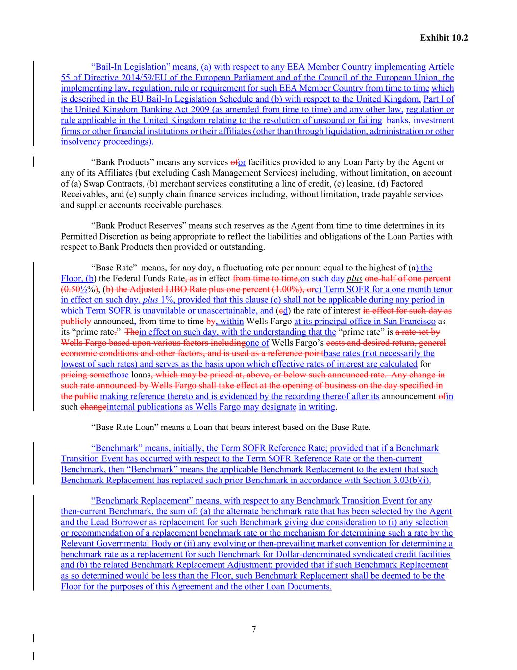 7 Exhibit 10.2 “Bail-In Legislation” means, (a) with respect to any EEA Member Country implementing Article 55 of Directive 2014/59/EU of the European Parliament and of the Council of the European Union, the implementing law, regulation, rule or requirement for such EEA Member Country from time to time which is described in the EU Bail-In Legislation Schedule and (b) with respect to the United Kingdom, Part I of the United Kingdom Banking Act 2009 (as amended from time to time) and any other law, regulation or rule applicable in the United Kingdom relating to the resolution of unsound or failing banks, investment firms or other financial institutions or their affiliates (other than through liquidation, administration or other insolvency proceedings). “Bank Products” means any services ofor facilities provided to any Loan Party by the Agent or any of its Affiliates (but excluding Cash Management Services) including, without limitation, on account of (a) Swap Contracts, (b) merchant services constituting a line of credit, (c) leasing, (d) Factored Receivables, and (e) supply chain finance services including, without limitation, trade payable services and supplier accounts receivable purchases. “Bank Product Reserves” means such reserves as the Agent from time to time determines in its Permitted Discretion as being appropriate to reflect the liabilities and obligations of the Loan Parties with respect to Bank Products then provided or outstanding. “Base Rate” means, for any day, a fluctuating rate per annum equal to the highest of (a) the Floor, (b) the Federal Funds Rate, as in effect from time to time,on such day plus one-half of one percent (0.50½%), (b) the Adjusted LIBO Rate plus one percent (1.00%), orc) Term SOFR for a one month tenor in effect on such day, plus 1%, provided that this clause (c) shall not be applicable during any period in which Term SOFR is unavailable or unascertainable, and (cd) the rate of interest in effect for such day as publicly announced, from time to time by, within Wells Fargo at its principal office in San Francisco as its “prime rate.” Thein effect on such day, with the understanding that the “prime rate” is a rate set by Wells Fargo based upon various factors includingone of Wells Fargo’s costs and desired return, general economic conditions and other factors, and is used as a reference pointbase rates (not necessarily the lowest of such rates) and serves as the basis upon which effective rates of interest are calculated for pricing somethose loans, which may be priced at, above, or below such announced rate. Any change in such rate announced by Wells Fargo shall take effect at the opening of business on the day specified in the public making reference thereto and is evidenced by the recording thereof after its announcement ofin such changeinternal publications as Wells Fargo may designate in writing. “Base Rate Loan” means a Loan that bears interest based on the Base Rate. “Benchmark” means, initially, the Term SOFR Reference Rate; provided that if a Benchmark Transition Event has occurred with respect to the Term SOFR Reference Rate or the then-current Benchmark, then “Benchmark” means the applicable Benchmark Replacement to the extent that such Benchmark Replacement has replaced such prior Benchmark in accordance with Section 3.03(b)(i). “Benchmark Replacement” means, with respect to any Benchmark Transition Event for any then-current Benchmark, the sum of: (a) the alternate benchmark rate that has been selected by the Agent and the Lead Borrower as replacement for such Benchmark giving due consideration to (i) any selection or recommendation of a replacement benchmark rate or the mechanism for determining such a rate by the Relevant Governmental Body or (ii) any evolving or then-prevailing market convention for determining a benchmark rate as a replacement for such Benchmark for Dollar-denominated syndicated credit facilities and (b) the related Benchmark Replacement Adjustment; provided that if such Benchmark Replacement as so determined would be less than the Floor, such Benchmark Replacement shall be deemed to be the Floor for the purposes of this Agreement and the other Loan Documents.