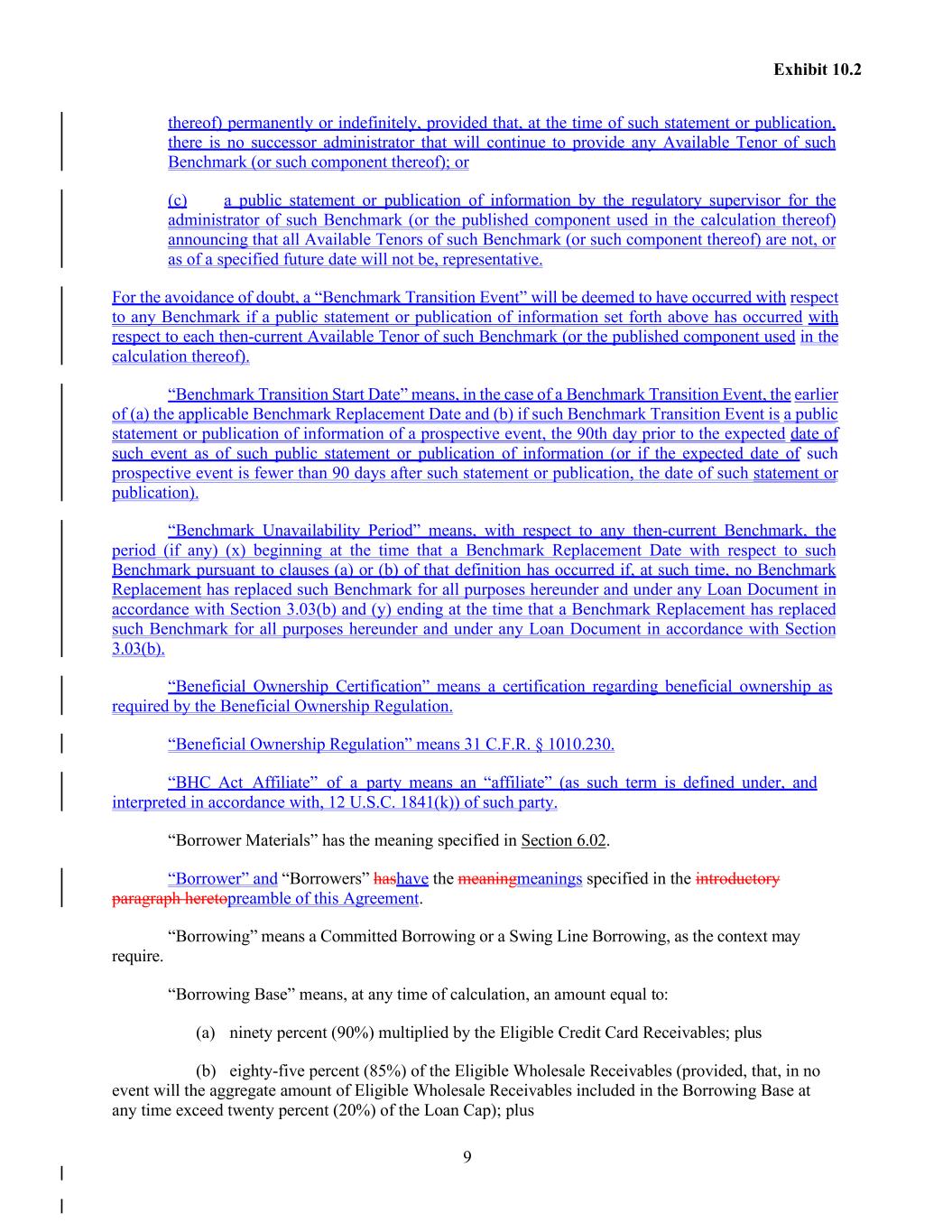 9 Exhibit 10.2 thereof) permanently or indefinitely, provided that, at the time of such statement or publication, there is no successor administrator that will continue to provide any Available Tenor of such Benchmark (or such component thereof); or (c) a public statement or publication of information by the regulatory supervisor for the administrator of such Benchmark (or the published component used in the calculation thereof) announcing that all Available Tenors of such Benchmark (or such component thereof) are not, or as of a specified future date will not be, representative. For the avoidance of doubt, a “Benchmark Transition Event” will be deemed to have occurred with respect to any Benchmark if a public statement or publication of information set forth above has occurred with respect to each then-current Available Tenor of such Benchmark (or the published component used in the calculation thereof). “Benchmark Transition Start Date” means, in the case of a Benchmark Transition Event, the earlier of (a) the applicable Benchmark Replacement Date and (b) if such Benchmark Transition Event is a public statement or publication of information of a prospective event, the 90th day prior to the expected date of such event as of such public statement or publication of information (or if the expected date of such prospective event is fewer than 90 days after such statement or publication, the date of such statement or publication). “Benchmark Unavailability Period” means, with respect to any then-current Benchmark, the period (if any) (x) beginning at the time that a Benchmark Replacement Date with respect to such Benchmark pursuant to clauses (a) or (b) of that definition has occurred if, at such time, no Benchmark Replacement has replaced such Benchmark for all purposes hereunder and under any Loan Document in accordance with Section 3.03(b) and (y) ending at the time that a Benchmark Replacement has replaced such Benchmark for all purposes hereunder and under any Loan Document in accordance with Section 3.03(b). “Beneficial Ownership Certification” means a certification regarding beneficial ownership as required by the Beneficial Ownership Regulation. “Beneficial Ownership Regulation” means 31 C.F.R. § 1010.230. “BHC Act Affiliate” of a party means an “affiliate” (as such term is defined under, and interpreted in accordance with, 12 U.S.C. 1841(k)) of such party. “Borrower Materials” has the meaning specified in Section 6.02. “Borrower” and “Borrowers” hashave the meaningmeanings specified in the introductory paragraph heretopreamble of this Agreement. “Borrowing” means a Committed Borrowing or a Swing Line Borrowing, as the context may require. “Borrowing Base” means, at any time of calculation, an amount equal to: (a) ninety percent (90%) multiplied by the Eligible Credit Card Receivables; plus (b) eighty-five percent (85%) of the Eligible Wholesale Receivables (provided, that, in no event will the aggregate amount of Eligible Wholesale Receivables included in the Borrowing Base at any time exceed twenty percent (20%) of the Loan Cap); plus