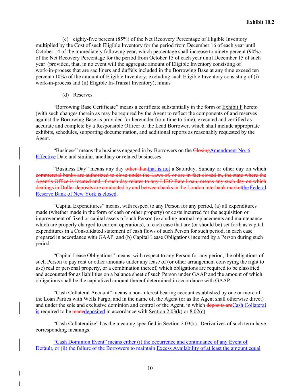 10 Exhibit 10.2 (c) eighty-five percent (85%) of the Net Recovery Percentage of Eligible Inventory multiplied by the Cost of such Eligible Inventory for the period from December 16 of each year until October 14 of the immediately following year, which percentage shall increase to ninety percent (90%) of the Net Recovery Percentage for the period from October 15 of each year until December 15 of such year (provided, that, in no event will the aggregate amount of Eligible Inventory consisting of work-in-process that are sac liners and duffels included in the Borrowing Base at any time exceed ten percent (10%) of the amount of Eligible Inventory, excluding such Eligible Inventory consisting of (i) work-in-process and (ii) Eligible In-Transit Inventory); minus (d) Reserves. “Borrowing Base Certificate” means a certificate substantially in the form of Exhibit F hereto (with such changes therein as may be required by the Agent to reflect the components of and reserves against the Borrowing Base as provided for hereunder from time to time), executed and certified as accurate and complete by a Responsible Officer of the Lead Borrower, which shall include appropriate exhibits, schedules, supporting documentation, and additional reports as reasonably requested by the Agent. “Business” means the business engaged in by Borrowers on the ClosingAmendment No. 6 Effective Date and similar, ancillary or related businesses. “Business Day” means any day other thanthat is not a Saturday, Sunday or other day on which commercial banks are authorized to close under the Laws of, or are in fact closed in, the state where the Agent’s Office is located and, if such day relates to any LIBO Rate Loan, means any such day on which dealings in Dollar deposits are conducted by and between banks in the London interbank marketthe Federal Reserve Bank of New York is closed. “Capital Expenditures” means, with respect to any Person for any period, (a) all expenditures made (whether made in the form of cash or other property) or costs incurred for the acquisition or improvement of fixed or capital assets of such Person (excluding normal replacements and maintenance which are properly charged to current operations), in each case that are (or should be) set forth as capital expenditures in a Consolidated statement of cash flows of such Person for such period, in each case prepared in accordance with GAAP, and (b) Capital Lease Obligations incurred by a Person during such period. “Capital Lease Obligations” means, with respect to any Person for any period, the obligations of such Person to pay rent or other amounts under any lease of (or other arrangement conveying the right to use) real or personal property, or a combination thereof, which obligations are required to be classified and accounted for as liabilities on a balance sheet of such Person under GAAP and the amount of which obligations shall be the capitalized amount thereof determined in accordance with GAAP. “Cash Collateral Account” means a non-interest bearing account established by one or more of the Loan Parties with Wells Fargo, and in the name of, the Agent (or as the Agent shall otherwise direct) and under the sole and exclusive dominion and control of the Agent, in which deposits areCash Collateral is required to be madedeposited in accordance with Section 2.03(k) or 8.02(c). “Cash Collateralize” has the meaning specified in Section 2.03(k). Derivatives of such term have corresponding meanings. “Cash Dominion Event” means either (i) the occurrence and continuance of any Event of Default, or (ii) the failure of the Borrowers to maintain Excess Availability of at least the amount equal