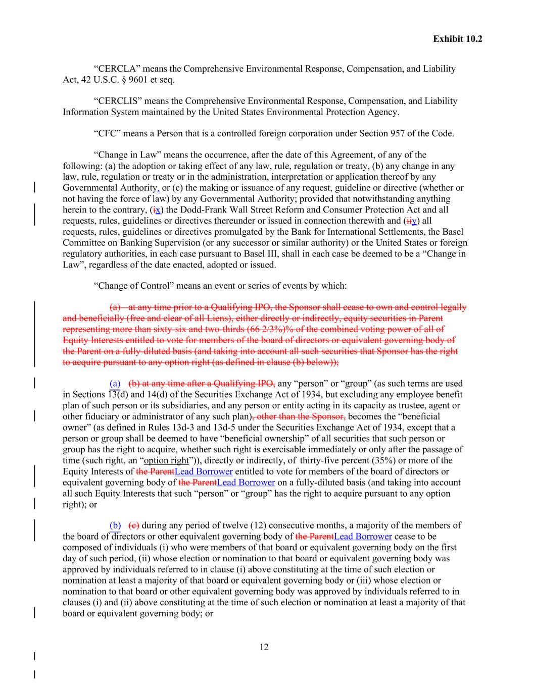 12 Exhibit 10.2 “CERCLA” means the Comprehensive Environmental Response, Compensation, and Liability Act, 42 U.S.C. § 9601 et seq. “CERCLIS” means the Comprehensive Environmental Response, Compensation, and Liability Information System maintained by the United States Environmental Protection Agency. “CFC” means a Person that is a controlled foreign corporation under Section 957 of the Code. “Change in Law” means the occurrence, after the date of this Agreement, of any of the following: (a) the adoption or taking effect of any law, rule, regulation or treaty, (b) any change in any law, rule, regulation or treaty or in the administration, interpretation or application thereof by any Governmental Authority, or (c) the making or issuance of any request, guideline or directive (whether or not having the force of law) by any Governmental Authority; provided that notwithstanding anything herein to the contrary, (ix) the Dodd-Frank Wall Street Reform and Consumer Protection Act and all requests, rules, guidelines or directives thereunder or issued in connection therewith and (iiy) all requests, rules, guidelines or directives promulgated by the Bank for International Settlements, the Basel Committee on Banking Supervision (or any successor or similar authority) or the United States or foreign regulatory authorities, in each case pursuant to Basel III, shall in each case be deemed to be a “Change in Law”, regardless of the date enacted, adopted or issued. “Change of Control” means an event or series of events by which: (a) at any time prior to a Qualifying IPO, the Sponsor shall cease to own and control legally and beneficially (free and clear of all Liens), either directly or indirectly, equity securities in Parent representing more than sixty-six and two-thirds (66 2/3%)% of the combined voting power of all of Equity Interests entitled to vote for members of the board of directors or equivalent governing body of the Parent on a fully-diluted basis (and taking into account all such securities that Sponsor has the right to acquire pursuant to any option right (as defined in clause (b) below)); (a) (b) at any time after a Qualifying IPO, any “person” or “group” (as such terms are used in Sections 13(d) and 14(d) of the Securities Exchange Act of 1934, but excluding any employee benefit plan of such person or its subsidiaries, and any person or entity acting in its capacity as trustee, agent or other fiduciary or administrator of any such plan), other than the Sponsor, becomes the “beneficial owner” (as defined in Rules 13d-3 and 13d-5 under the Securities Exchange Act of 1934, except that a person or group shall be deemed to have “beneficial ownership” of all securities that such person or group has the right to acquire, whether such right is exercisable immediately or only after the passage of time (such right, an “option right”)), directly or indirectly, of thirty-five percent (35%) or more of the Equity Interests of the ParentLead Borrower entitled to vote for members of the board of directors or equivalent governing body of the ParentLead Borrower on a fully-diluted basis (and taking into account all such Equity Interests that such “person” or “group” has the right to acquire pursuant to any option right); or (b) (c) during any period of twelve (12) consecutive months, a majority of the members of the board of directors or other equivalent governing body of the ParentLead Borrower cease to be composed of individuals (i) who were members of that board or equivalent governing body on the first day of such period, (ii) whose election or nomination to that board or equivalent governing body was approved by individuals referred to in clause (i) above constituting at the time of such election or nomination at least a majority of that board or equivalent governing body or (iii) whose election or nomination to that board or other equivalent governing body was approved by individuals referred to in clauses (i) and (ii) above constituting at the time of such election or nomination at least a majority of that board or equivalent governing body; or