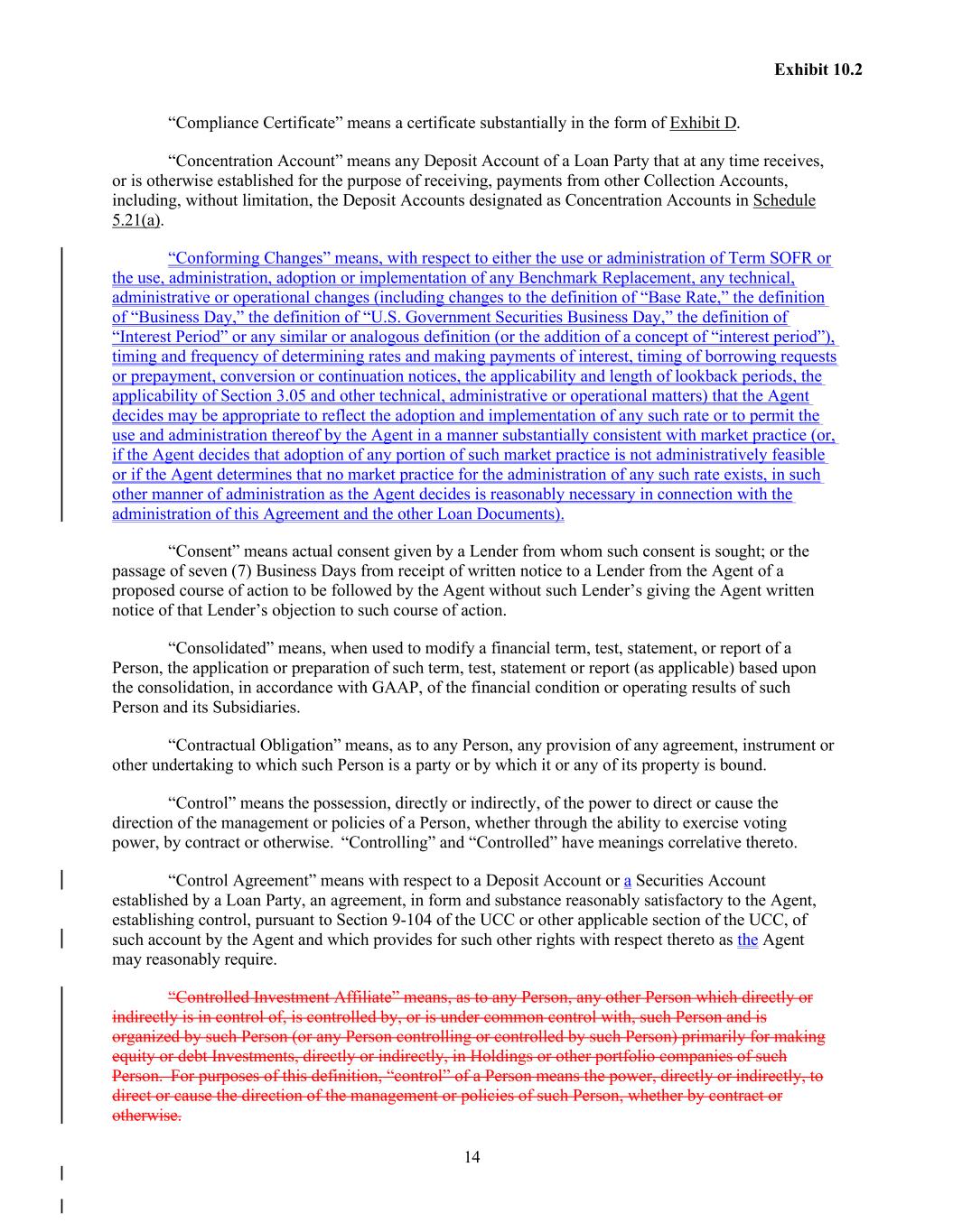 14 Exhibit 10.2 “Compliance Certificate” means a certificate substantially in the form of Exhibit D. “Concentration Account” means any Deposit Account of a Loan Party that at any time receives, or is otherwise established for the purpose of receiving, payments from other Collection Accounts, including, without limitation, the Deposit Accounts designated as Concentration Accounts in Schedule 5.21(a). “Conforming Changes” means, with respect to either the use or administration of Term SOFR or the use, administration, adoption or implementation of any Benchmark Replacement, any technical, administrative or operational changes (including changes to the definition of “Base Rate,” the definition of “Business Day,” the definition of “U.S. Government Securities Business Day,” the definition of “Interest Period” or any similar or analogous definition (or the addition of a concept of “interest period”), timing and frequency of determining rates and making payments of interest, timing of borrowing requests or prepayment, conversion or continuation notices, the applicability and length of lookback periods, the applicability of Section 3.05 and other technical, administrative or operational matters) that the Agent decides may be appropriate to reflect the adoption and implementation of any such rate or to permit the use and administration thereof by the Agent in a manner substantially consistent with market practice (or, if the Agent decides that adoption of any portion of such market practice is not administratively feasible or if the Agent determines that no market practice for the administration of any such rate exists, in such other manner of administration as the Agent decides is reasonably necessary in connection with the administration of this Agreement and the other Loan Documents). “Consent” means actual consent given by a Lender from whom such consent is sought; or the passage of seven (7) Business Days from receipt of written notice to a Lender from the Agent of a proposed course of action to be followed by the Agent without such Lender’s giving the Agent written notice of that Lender’s objection to such course of action. “Consolidated” means, when used to modify a financial term, test, statement, or report of a Person, the application or preparation of such term, test, statement or report (as applicable) based upon the consolidation, in accordance with GAAP, of the financial condition or operating results of such Person and its Subsidiaries. “Contractual Obligation” means, as to any Person, any provision of any agreement, instrument or other undertaking to which such Person is a party or by which it or any of its property is bound. “Control” means the possession, directly or indirectly, of the power to direct or cause the direction of the management or policies of a Person, whether through the ability to exercise voting power, by contract or otherwise. “Controlling” and “Controlled” have meanings correlative thereto. “Control Agreement” means with respect to a Deposit Account or a Securities Account established by a Loan Party, an agreement, in form and substance reasonably satisfactory to the Agent, establishing control, pursuant to Section 9-104 of the UCC or other applicable section of the UCC, of such account by the Agent and which provides for such other rights with respect thereto as the Agent may reasonably require. “Controlled Investment Affiliate” means, as to any Person, any other Person which directly or indirectly is in control of, is controlled by, or is under common control with, such Person and is organized by such Person (or any Person controlling or controlled by such Person) primarily for making equity or debt Investments, directly or indirectly, in Holdings or other portfolio companies of such Person. For purposes of this definition, “control” of a Person means the power, directly or indirectly, to direct or cause the direction of the management or policies of such Person, whether by contract or otherwise.