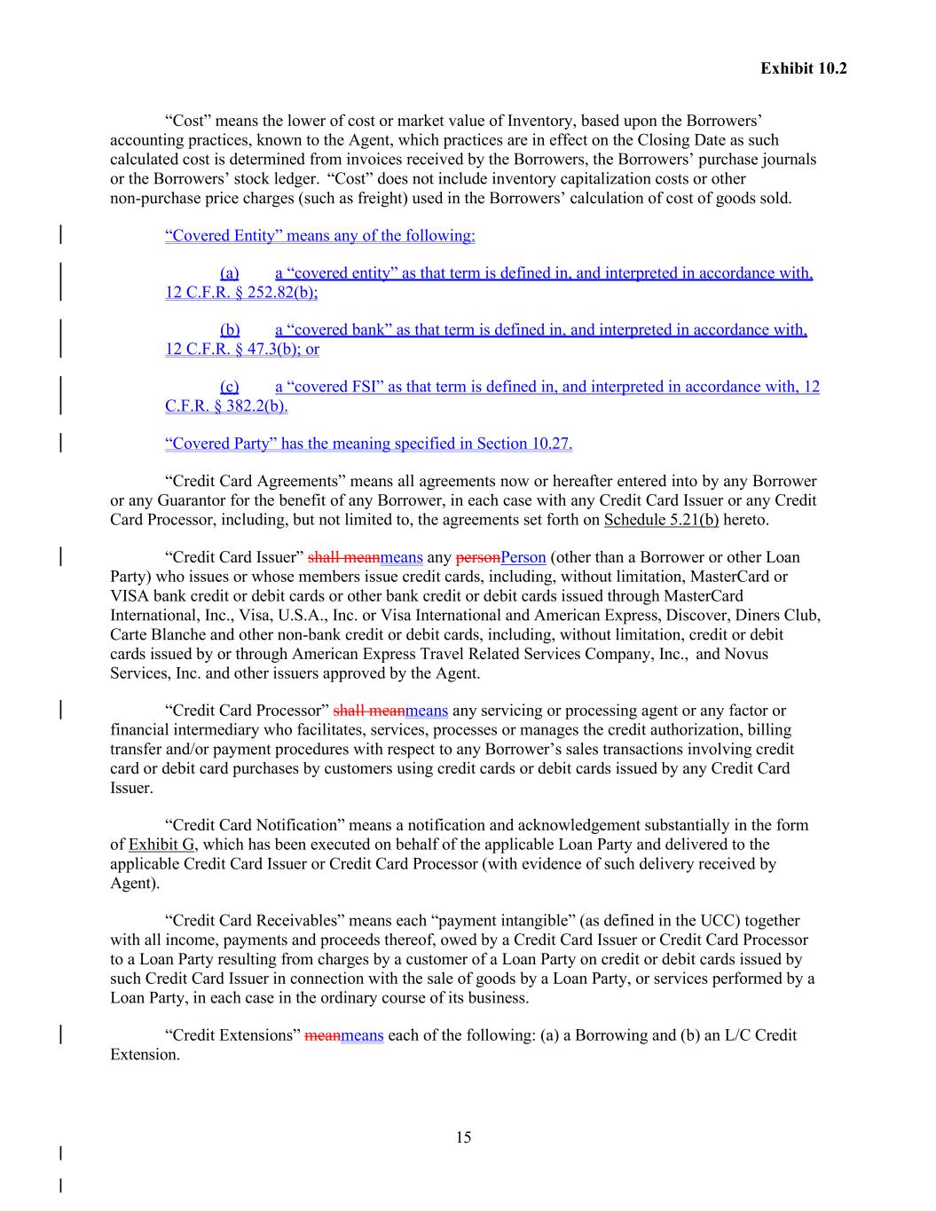 15 Exhibit 10.2 “Cost” means the lower of cost or market value of Inventory, based upon the Borrowers’ accounting practices, known to the Agent, which practices are in effect on the Closing Date as such calculated cost is determined from invoices received by the Borrowers, the Borrowers’ purchase journals or the Borrowers’ stock ledger. “Cost” does not include inventory capitalization costs or other non-purchase price charges (such as freight) used in the Borrowers’ calculation of cost of goods sold. “Covered Entity” means any of the following: (a) a “covered entity” as that term is defined in, and interpreted in accordance with, 12 C.F.R. § 252.82(b); (b) a “covered bank” as that term is defined in, and interpreted in accordance with, 12 C.F.R. § 47.3(b); or (c) a “covered FSI” as that term is defined in, and interpreted in accordance with, 12 C.F.R. § 382.2(b). “Covered Party” has the meaning specified in Section 10.27. “Credit Card Agreements” means all agreements now or hereafter entered into by any Borrower or any Guarantor for the benefit of any Borrower, in each case with any Credit Card Issuer or any Credit Card Processor, including, but not limited to, the agreements set forth on Schedule 5.21(b) hereto. “Credit Card Issuer” shall meanmeans any personPerson (other than a Borrower or other Loan Party) who issues or whose members issue credit cards, including, without limitation, MasterCard or VISA bank credit or debit cards or other bank credit or debit cards issued through MasterCard International, Inc., Visa, U.S.A., Inc. or Visa International and American Express, Discover, Diners Club, Carte Blanche and other non-bank credit or debit cards, including, without limitation, credit or debit cards issued by or through American Express Travel Related Services Company, Inc., and Novus Services, Inc. and other issuers approved by the Agent. “Credit Card Processor” shall meanmeans any servicing or processing agent or any factor or financial intermediary who facilitates, services, processes or manages the credit authorization, billing transfer and/or payment procedures with respect to any Borrower’s sales transactions involving credit card or debit card purchases by customers using credit cards or debit cards issued by any Credit Card Issuer. “Credit Card Notification” means a notification and acknowledgement substantially in the form of Exhibit G, which has been executed on behalf of the applicable Loan Party and delivered to the applicable Credit Card Issuer or Credit Card Processor (with evidence of such delivery received by Agent). “Credit Card Receivables” means each “payment intangible” (as defined in the UCC) together with all income, payments and proceeds thereof, owed by a Credit Card Issuer or Credit Card Processor to a Loan Party resulting from charges by a customer of a Loan Party on credit or debit cards issued by such Credit Card Issuer in connection with the sale of goods by a Loan Party, or services performed by a Loan Party, in each case in the ordinary course of its business. “Credit Extensions” meanmeans each of the following: (a) a Borrowing and (b) an L/C Credit Extension.