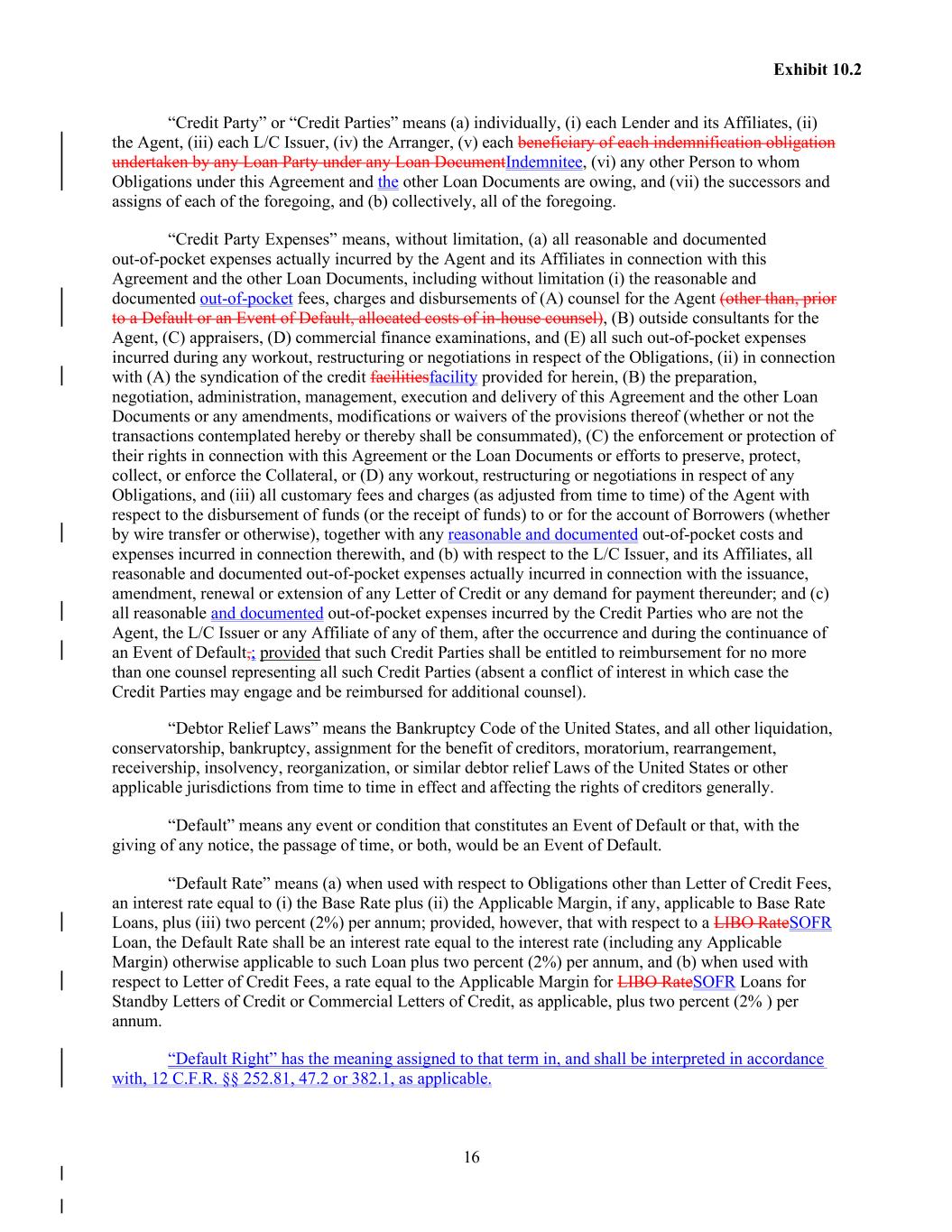 16 Exhibit 10.2 “Credit Party” or “Credit Parties” means (a) individually, (i) each Lender and its Affiliates, (ii) the Agent, (iii) each L/C Issuer, (iv) the Arranger, (v) each beneficiary of each indemnification obligation undertaken by any Loan Party under any Loan DocumentIndemnitee, (vi) any other Person to whom Obligations under this Agreement and the other Loan Documents are owing, and (vii) the successors and assigns of each of the foregoing, and (b) collectively, all of the foregoing. “Credit Party Expenses” means, without limitation, (a) all reasonable and documented out-of-pocket expenses actually incurred by the Agent and its Affiliates in connection with this Agreement and the other Loan Documents, including without limitation (i) the reasonable and documented out-of-pocket fees, charges and disbursements of (A) counsel for the Agent (other than, prior to a Default or an Event of Default, allocated costs of in-house counsel), (B) outside consultants for the Agent, (C) appraisers, (D) commercial finance examinations, and (E) all such out-of-pocket expenses incurred during any workout, restructuring or negotiations in respect of the Obligations, (ii) in connection with (A) the syndication of the credit facilitiesfacility provided for herein, (B) the preparation, negotiation, administration, management, execution and delivery of this Agreement and the other Loan Documents or any amendments, modifications or waivers of the provisions thereof (whether or not the transactions contemplated hereby or thereby shall be consummated), (C) the enforcement or protection of their rights in connection with this Agreement or the Loan Documents or efforts to preserve, protect, collect, or enforce the Collateral, or (D) any workout, restructuring or negotiations in respect of any Obligations, and (iii) all customary fees and charges (as adjusted from time to time) of the Agent with respect to the disbursement of funds (or the receipt of funds) to or for the account of Borrowers (whether by wire transfer or otherwise), together with any reasonable and documented out-of-pocket costs and expenses incurred in connection therewith, and (b) with respect to the L/C Issuer, and its Affiliates, all reasonable and documented out-of-pocket expenses actually incurred in connection with the issuance, amendment, renewal or extension of any Letter of Credit or any demand for payment thereunder; and (c) all reasonable and documented out-of-pocket expenses incurred by the Credit Parties who are not the Agent, the L/C Issuer or any Affiliate of any of them, after the occurrence and during the continuance of an Event of Default,; provided that such Credit Parties shall be entitled to reimbursement for no more than one counsel representing all such Credit Parties (absent a conflict of interest in which case the Credit Parties may engage and be reimbursed for additional counsel). “Debtor Relief Laws” means the Bankruptcy Code of the United States, and all other liquidation, conservatorship, bankruptcy, assignment for the benefit of creditors, moratorium, rearrangement, receivership, insolvency, reorganization, or similar debtor relief Laws of the United States or other applicable jurisdictions from time to time in effect and affecting the rights of creditors generally. “Default” means any event or condition that constitutes an Event of Default or that, with the giving of any notice, the passage of time, or both, would be an Event of Default. “Default Rate” means (a) when used with respect to Obligations other than Letter of Credit Fees, an interest rate equal to (i) the Base Rate plus (ii) the Applicable Margin, if any, applicable to Base Rate Loans, plus (iii) two percent (2%) per annum; provided, however, that with respect to a LIBO RateSOFR Loan, the Default Rate shall be an interest rate equal to the interest rate (including any Applicable Margin) otherwise applicable to such Loan plus two percent (2%) per annum, and (b) when used with respect to Letter of Credit Fees, a rate equal to the Applicable Margin for LIBO RateSOFR Loans for Standby Letters of Credit or Commercial Letters of Credit, as applicable, plus two percent (2% ) per annum. “Default Right” has the meaning assigned to that term in, and shall be interpreted in accordance with, 12 C.F.R. §§ 252.81, 47.2 or 382.1, as applicable.