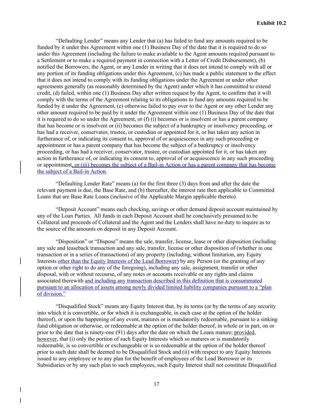 17 Exhibit 10.2 “Defaulting Lender” means any Lender that (a) has failed to fund any amounts required to be funded by it under this Agreement within one (1) Business Day of the date that it is required to do so under this Agreement (including the failure to make available to the Agent amounts required pursuant to a Settlement or to make a required payment in connection with a Letter of Credit Disbursement), (b) notified the Borrowers, the Agent, or any Lender in writing that it does not intend to comply with all or any portion of its funding obligations under this Agreement, (c) has made a public statement to the effect that it does not intend to comply with its funding obligations under the Agreement or under other agreements generally (as reasonably determined by the Agent) under which it has committed to extend credit, (d) failed, within one (1) Business Day after written request by the Agent, to confirm that it will comply with the terms of the Agreement relating to its obligations to fund any amounts required to be funded by it under the Agreement, (e) otherwise failed to pay over to the Agent or any other Lender any other amount required to be paid by it under the Agreement within one (1) Business Day of the date that it is required to do so under the Agreement, or (f) (i) becomes or is insolvent or has a parent company that has become or is insolvent or (ii) becomes the subject of a bankruptcy or insolvency proceeding, or has had a receiver, conservator, trustee, or custodian or appointed for it, or has taken any action in furtherance of, or indicating its consent to, approval of or acquiescence in any such proceeding or appointment or has a parent company that has become the subject of a bankruptcy or insolvency proceeding, or has had a receiver, conservator, trustee, or custodian appointed for it, or has taken any action in furtherance of, or indicating its consent to, approval of or acquiescence in any such proceeding or appointment, or (iii) becomes the subject of a Bail-in Action or has a parent company that has become the subject of a Bail-in Action. “Defaulting Lender Rate” means (a) for the first three (3) days from and after the date the relevant payment is due, the Base Rate, and (b) thereafter, the interest rate then applicable to Committed Loans that are Base Rate Loans (inclusive of the Applicable Margin applicable thereto). “Deposit Account” means each checking, savings or other demand deposit account maintained by any of the Loan Parties. All funds in each Deposit Account shall be conclusively presumed to be Collateral and proceeds of Collateral and the Agent and the Lenders shall have no duty to inquire as to the source of the amounts on deposit in any Deposit Account. “Disposition” or “Dispose” means the sale, transfer, license, lease or other disposition (including any sale and leaseback transaction and any sale, transfer, license or other disposition of (whether in one transaction or in a series of transactions) of any property (including, without limitation, any Equity Interests other than the Equity Interests of the Lead Borrower) by any Person (or the granting of any option or other right to do any of the foregoing), including any sale, assignment, transfer or other disposal, with or without recourse, of any notes or accounts receivable or any rights and claims associated therewith and including any transaction described in this definition that is consummated pursuant to an allocation of assets among newly divided limited liability companies pursuant to a “plan of division.” “Disqualified Stock” means any Equity Interest that, by its terms (or by the terms of any security into which it is convertible, or for which it is exchangeable, in each case at the option of the holder thereof), or upon the happening of any event, matures or is mandatorily redeemable, pursuant to a sinking fund obligation or otherwise, or redeemable at the option of the holder thereof, in whole or in part, on or prior to the date that is ninety-one (91) days after the date on which the Loans mature; provided, however, that (i) only the portion of such Equity Interests which so matures or is mandatorily redeemable, is so convertible or exchangeable or is so redeemable at the option of the holder thereof prior to such date shall be deemed to be Disqualified Stock and (ii) with respect to any Equity Interests issued to any employee or to any plan for the benefit of employees of the Lead Borrower or its Subsidiaries or by any such plan to such employees, such Equity Interest shall not constitute Disqualified