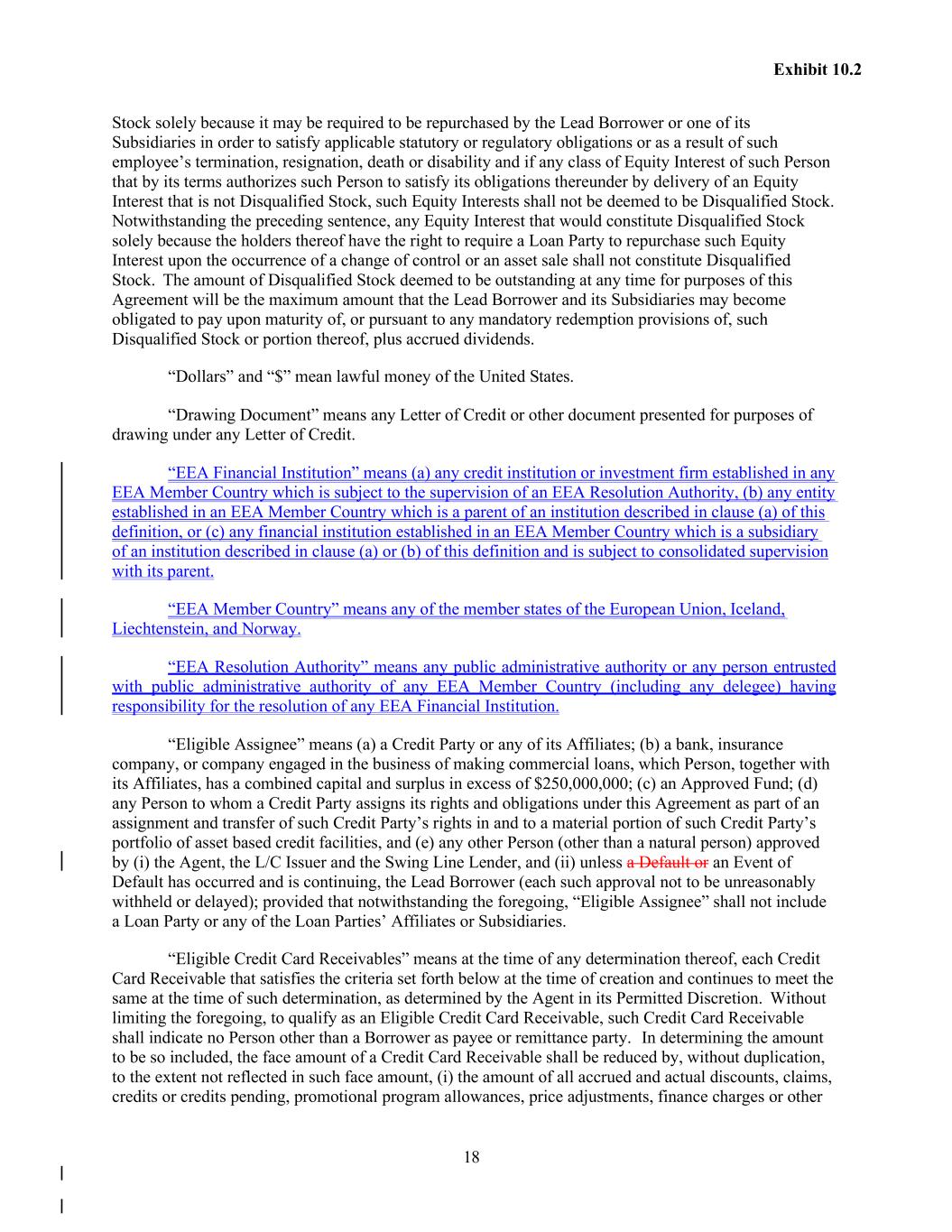 18 Exhibit 10.2 Stock solely because it may be required to be repurchased by the Lead Borrower or one of its Subsidiaries in order to satisfy applicable statutory or regulatory obligations or as a result of such employee’s termination, resignation, death or disability and if any class of Equity Interest of such Person that by its terms authorizes such Person to satisfy its obligations thereunder by delivery of an Equity Interest that is not Disqualified Stock, such Equity Interests shall not be deemed to be Disqualified Stock. Notwithstanding the preceding sentence, any Equity Interest that would constitute Disqualified Stock solely because the holders thereof have the right to require a Loan Party to repurchase such Equity Interest upon the occurrence of a change of control or an asset sale shall not constitute Disqualified Stock. The amount of Disqualified Stock deemed to be outstanding at any time for purposes of this Agreement will be the maximum amount that the Lead Borrower and its Subsidiaries may become obligated to pay upon maturity of, or pursuant to any mandatory redemption provisions of, such Disqualified Stock or portion thereof, plus accrued dividends. “Dollars” and “$” mean lawful money of the United States. “Drawing Document” means any Letter of Credit or other document presented for purposes of drawing under any Letter of Credit. “EEA Financial Institution” means (a) any credit institution or investment firm established in any EEA Member Country which is subject to the supervision of an EEA Resolution Authority, (b) any entity established in an EEA Member Country which is a parent of an institution described in clause (a) of this definition, or (c) any financial institution established in an EEA Member Country which is a subsidiary of an institution described in clause (a) or (b) of this definition and is subject to consolidated supervision with its parent. “EEA Member Country” means any of the member states of the European Union, Iceland, Liechtenstein, and Norway. “EEA Resolution Authority” means any public administrative authority or any person entrusted with public administrative authority of any EEA Member Country (including any delegee) having responsibility for the resolution of any EEA Financial Institution. “Eligible Assignee” means (a) a Credit Party or any of its Affiliates; (b) a bank, insurance company, or company engaged in the business of making commercial loans, which Person, together with its Affiliates, has a combined capital and surplus in excess of $250,000,000; (c) an Approved Fund; (d) any Person to whom a Credit Party assigns its rights and obligations under this Agreement as part of an assignment and transfer of such Credit Party’s rights in and to a material portion of such Credit Party’s portfolio of asset based credit facilities, and (e) any other Person (other than a natural person) approved by (i) the Agent, the L/C Issuer and the Swing Line Lender, and (ii) unless a Default or an Event of Default has occurred and is continuing, the Lead Borrower (each such approval not to be unreasonably withheld or delayed); provided that notwithstanding the foregoing, “Eligible Assignee” shall not include a Loan Party or any of the Loan Parties’ Affiliates or Subsidiaries. “Eligible Credit Card Receivables” means at the time of any determination thereof, each Credit Card Receivable that satisfies the criteria set forth below at the time of creation and continues to meet the same at the time of such determination, as determined by the Agent in its Permitted Discretion. Without limiting the foregoing, to qualify as an Eligible Credit Card Receivable, such Credit Card Receivable shall indicate no Person other than a Borrower as payee or remittance party. In determining the amount to be so included, the face amount of a Credit Card Receivable shall be reduced by, without duplication, to the extent not reflected in such face amount, (i) the amount of all accrued and actual discounts, claims, credits or credits pending, promotional program allowances, price adjustments, finance charges or other
