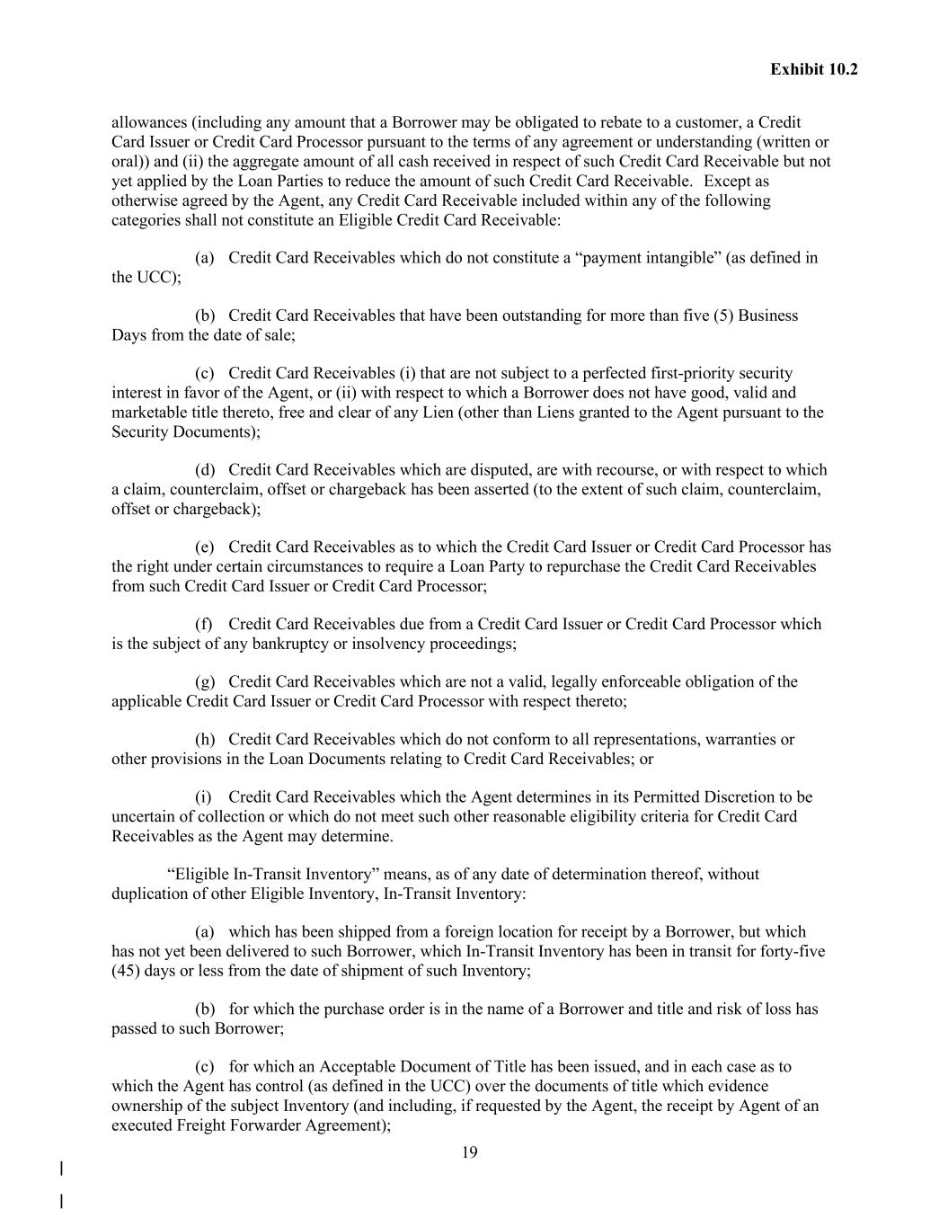 19 Exhibit 10.2 allowances (including any amount that a Borrower may be obligated to rebate to a customer, a Credit Card Issuer or Credit Card Processor pursuant to the terms of any agreement or understanding (written or oral)) and (ii) the aggregate amount of all cash received in respect of such Credit Card Receivable but not yet applied by the Loan Parties to reduce the amount of such Credit Card Receivable. Except as otherwise agreed by the Agent, any Credit Card Receivable included within any of the following categories shall not constitute an Eligible Credit Card Receivable: (a) Credit Card Receivables which do not constitute a “payment intangible” (as defined in the UCC); (b) Credit Card Receivables that have been outstanding for more than five (5) Business Days from the date of sale; (c) Credit Card Receivables (i) that are not subject to a perfected first-priority security interest in favor of the Agent, or (ii) with respect to which a Borrower does not have good, valid and marketable title thereto, free and clear of any Lien (other than Liens granted to the Agent pursuant to the Security Documents); (d) Credit Card Receivables which are disputed, are with recourse, or with respect to which a claim, counterclaim, offset or chargeback has been asserted (to the extent of such claim, counterclaim, offset or chargeback); (e) Credit Card Receivables as to which the Credit Card Issuer or Credit Card Processor has the right under certain circumstances to require a Loan Party to repurchase the Credit Card Receivables from such Credit Card Issuer or Credit Card Processor; (f) Credit Card Receivables due from a Credit Card Issuer or Credit Card Processor which is the subject of any bankruptcy or insolvency proceedings; (g) Credit Card Receivables which are not a valid, legally enforceable obligation of the applicable Credit Card Issuer or Credit Card Processor with respect thereto; (h) Credit Card Receivables which do not conform to all representations, warranties or other provisions in the Loan Documents relating to Credit Card Receivables; or (i) Credit Card Receivables which the Agent determines in its Permitted Discretion to be uncertain of collection or which do not meet such other reasonable eligibility criteria for Credit Card Receivables as the Agent may determine. “Eligible In-Transit Inventory” means, as of any date of determination thereof, without duplication of other Eligible Inventory, In-Transit Inventory: (a) which has been shipped from a foreign location for receipt by a Borrower, but which has not yet been delivered to such Borrower, which In-Transit Inventory has been in transit for forty-five (45) days or less from the date of shipment of such Inventory; (b) for which the purchase order is in the name of a Borrower and title and risk of loss has passed to such Borrower; (c) for which an Acceptable Document of Title has been issued, and in each case as to which the Agent has control (as defined in the UCC) over the documents of title which evidence ownership of the subject Inventory (and including, if requested by the Agent, the receipt by Agent of an executed Freight Forwarder Agreement);