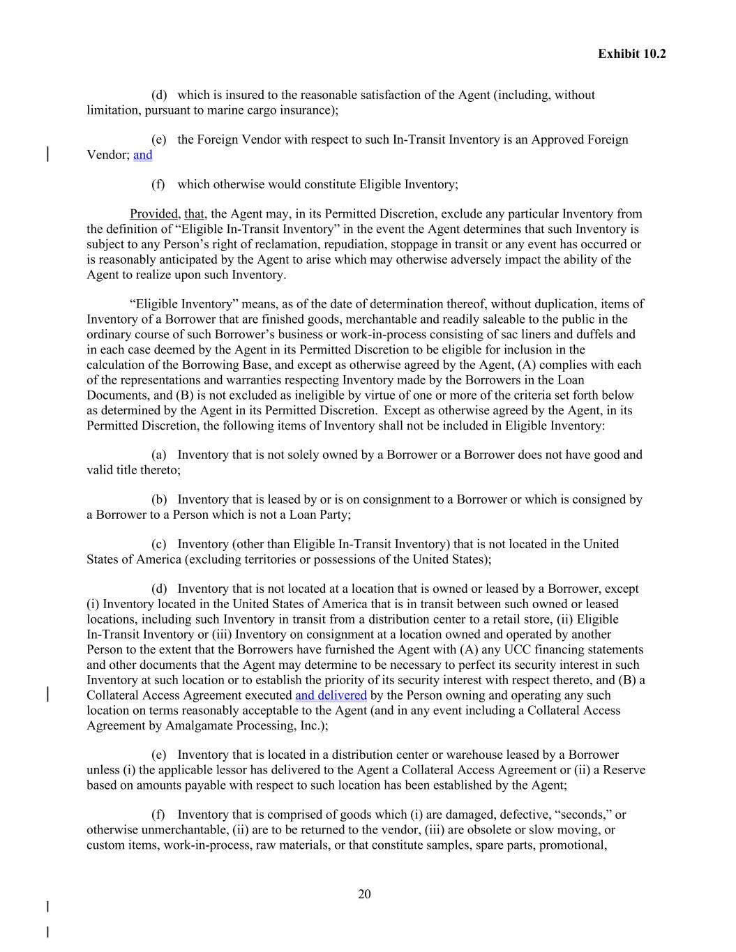 20 Exhibit 10.2 (d) which is insured to the reasonable satisfaction of the Agent (including, without limitation, pursuant to marine cargo insurance); (e) the Foreign Vendor with respect to such In-Transit Inventory is an Approved Foreign Vendor; and (f) which otherwise would constitute Eligible Inventory; Provided, that, the Agent may, in its Permitted Discretion, exclude any particular Inventory from the definition of “Eligible In-Transit Inventory” in the event the Agent determines that such Inventory is subject to any Person’s right of reclamation, repudiation, stoppage in transit or any event has occurred or is reasonably anticipated by the Agent to arise which may otherwise adversely impact the ability of the Agent to realize upon such Inventory. “Eligible Inventory” means, as of the date of determination thereof, without duplication, items of Inventory of a Borrower that are finished goods, merchantable and readily saleable to the public in the ordinary course of such Borrower’s business or work-in-process consisting of sac liners and duffels and in each case deemed by the Agent in its Permitted Discretion to be eligible for inclusion in the calculation of the Borrowing Base, and except as otherwise agreed by the Agent, (A) complies with each of the representations and warranties respecting Inventory made by the Borrowers in the Loan Documents, and (B) is not excluded as ineligible by virtue of one or more of the criteria set forth below as determined by the Agent in its Permitted Discretion. Except as otherwise agreed by the Agent, in its Permitted Discretion, the following items of Inventory shall not be included in Eligible Inventory: (a) Inventory that is not solely owned by a Borrower or a Borrower does not have good and valid title thereto; (b) Inventory that is leased by or is on consignment to a Borrower or which is consigned by a Borrower to a Person which is not a Loan Party; (c) Inventory (other than Eligible In-Transit Inventory) that is not located in the United States of America (excluding territories or possessions of the United States); (d) Inventory that is not located at a location that is owned or leased by a Borrower, except (i) Inventory located in the United States of America that is in transit between such owned or leased locations, including such Inventory in transit from a distribution center to a retail store, (ii) Eligible In-Transit Inventory or (iii) Inventory on consignment at a location owned and operated by another Person to the extent that the Borrowers have furnished the Agent with (A) any UCC financing statements and other documents that the Agent may determine to be necessary to perfect its security interest in such Inventory at such location or to establish the priority of its security interest with respect thereto, and (B) a Collateral Access Agreement executed and delivered by the Person owning and operating any such location on terms reasonably acceptable to the Agent (and in any event including a Collateral Access Agreement by Amalgamate Processing, Inc.); (e) Inventory that is located in a distribution center or warehouse leased by a Borrower unless (i) the applicable lessor has delivered to the Agent a Collateral Access Agreement or (ii) a Reserve based on amounts payable with respect to such location has been established by the Agent; (f) Inventory that is comprised of goods which (i) are damaged, defective, “seconds,” or otherwise unmerchantable, (ii) are to be returned to the vendor, (iii) are obsolete or slow moving, or custom items, work-in-process, raw materials, or that constitute samples, spare parts, promotional,