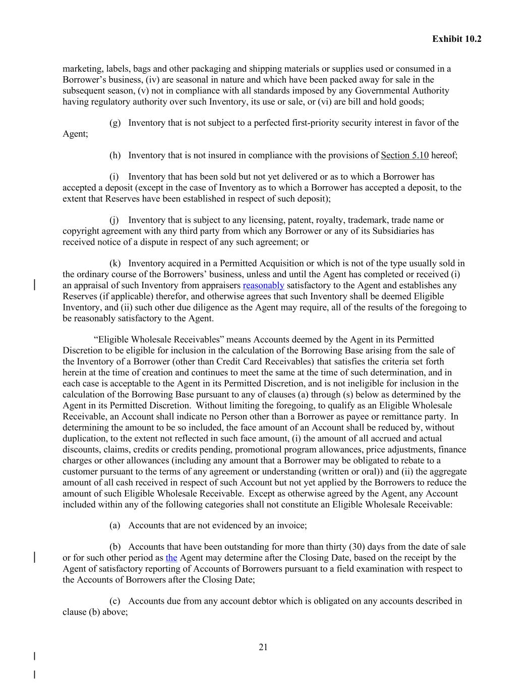 21 Exhibit 10.2 marketing, labels, bags and other packaging and shipping materials or supplies used or consumed in a Borrower’s business, (iv) are seasonal in nature and which have been packed away for sale in the subsequent season, (v) not in compliance with all standards imposed by any Governmental Authority having regulatory authority over such Inventory, its use or sale, or (vi) are bill and hold goods; (g) Inventory that is not subject to a perfected first-priority security interest in favor of the Agent; (h) Inventory that is not insured in compliance with the provisions of Section 5.10 hereof; (i) Inventory that has been sold but not yet delivered or as to which a Borrower has accepted a deposit (except in the case of Inventory as to which a Borrower has accepted a deposit, to the extent that Reserves have been established in respect of such deposit); (j) Inventory that is subject to any licensing, patent, royalty, trademark, trade name or copyright agreement with any third party from which any Borrower or any of its Subsidiaries has received notice of a dispute in respect of any such agreement; or (k) Inventory acquired in a Permitted Acquisition or which is not of the type usually sold in the ordinary course of the Borrowers’ business, unless and until the Agent has completed or received (i) an appraisal of such Inventory from appraisers reasonably satisfactory to the Agent and establishes any Reserves (if applicable) therefor, and otherwise agrees that such Inventory shall be deemed Eligible Inventory, and (ii) such other due diligence as the Agent may require, all of the results of the foregoing to be reasonably satisfactory to the Agent. “Eligible Wholesale Receivables” means Accounts deemed by the Agent in its Permitted Discretion to be eligible for inclusion in the calculation of the Borrowing Base arising from the sale of the Inventory of a Borrower (other than Credit Card Receivables) that satisfies the criteria set forth herein at the time of creation and continues to meet the same at the time of such determination, and in each case is acceptable to the Agent in its Permitted Discretion, and is not ineligible for inclusion in the calculation of the Borrowing Base pursuant to any of clauses (a) through (s) below as determined by the Agent in its Permitted Discretion. Without limiting the foregoing, to qualify as an Eligible Wholesale Receivable, an Account shall indicate no Person other than a Borrower as payee or remittance party. In determining the amount to be so included, the face amount of an Account shall be reduced by, without duplication, to the extent not reflected in such face amount, (i) the amount of all accrued and actual discounts, claims, credits or credits pending, promotional program allowances, price adjustments, finance charges or other allowances (including any amount that a Borrower may be obligated to rebate to a customer pursuant to the terms of any agreement or understanding (written or oral)) and (ii) the aggregate amount of all cash received in respect of such Account but not yet applied by the Borrowers to reduce the amount of such Eligible Wholesale Receivable. Except as otherwise agreed by the Agent, any Account included within any of the following categories shall not constitute an Eligible Wholesale Receivable: (a) Accounts that are not evidenced by an invoice; (b) Accounts that have been outstanding for more than thirty (30) days from the date of sale or for such other period as the Agent may determine after the Closing Date, based on the receipt by the Agent of satisfactory reporting of Accounts of Borrowers pursuant to a field examination with respect to the Accounts of Borrowers after the Closing Date; (c) Accounts due from any account debtor which is obligated on any accounts described in clause (b) above;