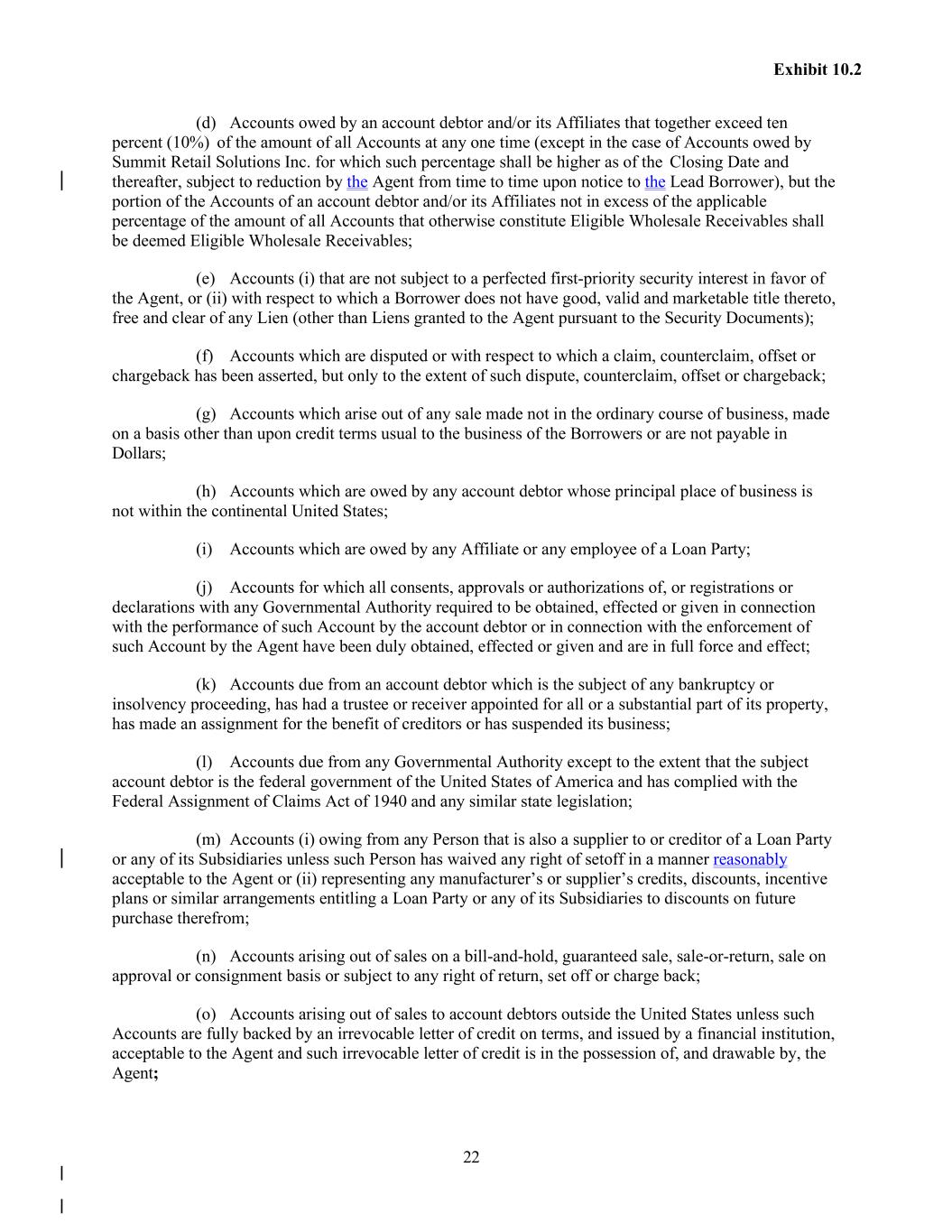 22 Exhibit 10.2 (d) Accounts owed by an account debtor and/or its Affiliates that together exceed ten percent (10%) of the amount of all Accounts at any one time (except in the case of Accounts owed by Summit Retail Solutions Inc. for which such percentage shall be higher as of the Closing Date and thereafter, subject to reduction by the Agent from time to time upon notice to the Lead Borrower), but the portion of the Accounts of an account debtor and/or its Affiliates not in excess of the applicable percentage of the amount of all Accounts that otherwise constitute Eligible Wholesale Receivables shall be deemed Eligible Wholesale Receivables; (e) Accounts (i) that are not subject to a perfected first-priority security interest in favor of the Agent, or (ii) with respect to which a Borrower does not have good, valid and marketable title thereto, free and clear of any Lien (other than Liens granted to the Agent pursuant to the Security Documents); (f) Accounts which are disputed or with respect to which a claim, counterclaim, offset or chargeback has been asserted, but only to the extent of such dispute, counterclaim, offset or chargeback; (g) Accounts which arise out of any sale made not in the ordinary course of business, made on a basis other than upon credit terms usual to the business of the Borrowers or are not payable in Dollars; (h) Accounts which are owed by any account debtor whose principal place of business is not within the continental United States; (i) Accounts which are owed by any Affiliate or any employee of a Loan Party; (j) Accounts for which all consents, approvals or authorizations of, or registrations or declarations with any Governmental Authority required to be obtained, effected or given in connection with the performance of such Account by the account debtor or in connection with the enforcement of such Account by the Agent have been duly obtained, effected or given and are in full force and effect; (k) Accounts due from an account debtor which is the subject of any bankruptcy or insolvency proceeding, has had a trustee or receiver appointed for all or a substantial part of its property, has made an assignment for the benefit of creditors or has suspended its business; (l) Accounts due from any Governmental Authority except to the extent that the subject account debtor is the federal government of the United States of America and has complied with the Federal Assignment of Claims Act of 1940 and any similar state legislation; (m) Accounts (i) owing from any Person that is also a supplier to or creditor of a Loan Party or any of its Subsidiaries unless such Person has waived any right of setoff in a manner reasonably acceptable to the Agent or (ii) representing any manufacturer’s or supplier’s credits, discounts, incentive plans or similar arrangements entitling a Loan Party or any of its Subsidiaries to discounts on future purchase therefrom; (n) Accounts arising out of sales on a bill-and-hold, guaranteed sale, sale-or-return, sale on approval or consignment basis or subject to any right of return, set off or charge back; (o) Accounts arising out of sales to account debtors outside the United States unless such Accounts are fully backed by an irrevocable letter of credit on terms, and issued by a financial institution, acceptable to the Agent and such irrevocable letter of credit is in the possession of, and drawable by, the Agent;