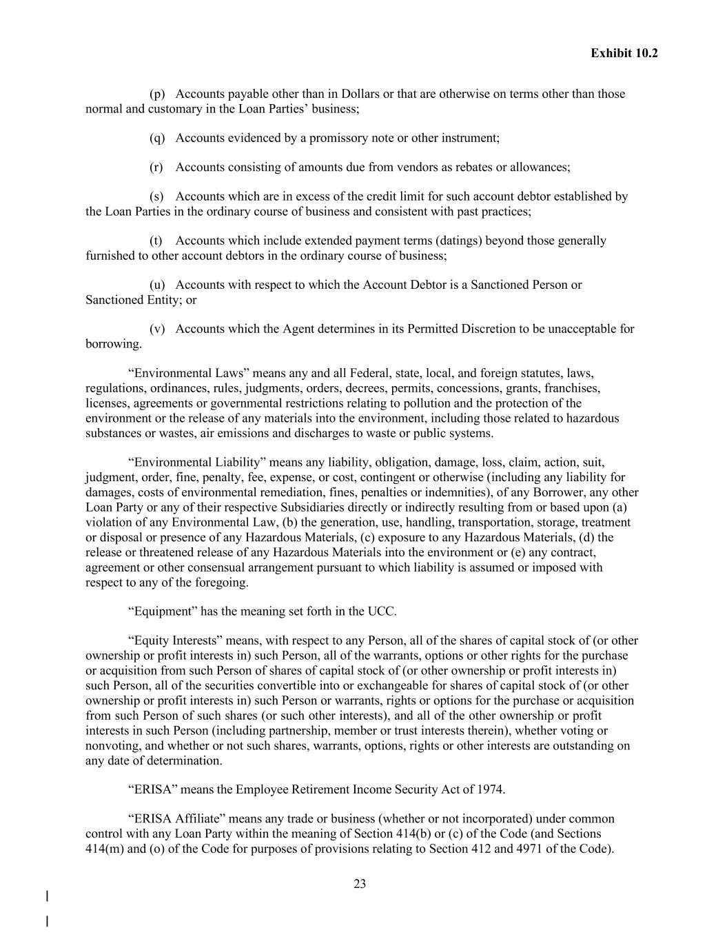23 Exhibit 10.2 (p) Accounts payable other than in Dollars or that are otherwise on terms other than those normal and customary in the Loan Parties’ business; (q) Accounts evidenced by a promissory note or other instrument; (r) Accounts consisting of amounts due from vendors as rebates or allowances; (s) Accounts which are in excess of the credit limit for such account debtor established by the Loan Parties in the ordinary course of business and consistent with past practices; (t) Accounts which include extended payment terms (datings) beyond those generally furnished to other account debtors in the ordinary course of business; (u) Accounts with respect to which the Account Debtor is a Sanctioned Person or Sanctioned Entity; or (v) Accounts which the Agent determines in its Permitted Discretion to be unacceptable for borrowing. “Environmental Laws” means any and all Federal, state, local, and foreign statutes, laws, regulations, ordinances, rules, judgments, orders, decrees, permits, concessions, grants, franchises, licenses, agreements or governmental restrictions relating to pollution and the protection of the environment or the release of any materials into the environment, including those related to hazardous substances or wastes, air emissions and discharges to waste or public systems. “Environmental Liability” means any liability, obligation, damage, loss, claim, action, suit, judgment, order, fine, penalty, fee, expense, or cost, contingent or otherwise (including any liability for damages, costs of environmental remediation, fines, penalties or indemnities), of any Borrower, any other Loan Party or any of their respective Subsidiaries directly or indirectly resulting from or based upon (a) violation of any Environmental Law, (b) the generation, use, handling, transportation, storage, treatment or disposal or presence of any Hazardous Materials, (c) exposure to any Hazardous Materials, (d) the release or threatened release of any Hazardous Materials into the environment or (e) any contract, agreement or other consensual arrangement pursuant to which liability is assumed or imposed with respect to any of the foregoing. “Equipment” has the meaning set forth in the UCC. “Equity Interests” means, with respect to any Person, all of the shares of capital stock of (or other ownership or profit interests in) such Person, all of the warrants, options or other rights for the purchase or acquisition from such Person of shares of capital stock of (or other ownership or profit interests in) such Person, all of the securities convertible into or exchangeable for shares of capital stock of (or other ownership or profit interests in) such Person or warrants, rights or options for the purchase or acquisition from such Person of such shares (or such other interests), and all of the other ownership or profit interests in such Person (including partnership, member or trust interests therein), whether voting or nonvoting, and whether or not such shares, warrants, options, rights or other interests are outstanding on any date of determination. “ERISA” means the Employee Retirement Income Security Act of 1974. “ERISA Affiliate” means any trade or business (whether or not incorporated) under common control with any Loan Party within the meaning of Section 414(b) or (c) of the Code (and Sections 414(m) and (o) of the Code for purposes of provisions relating to Section 412 and 4971 of the Code).
