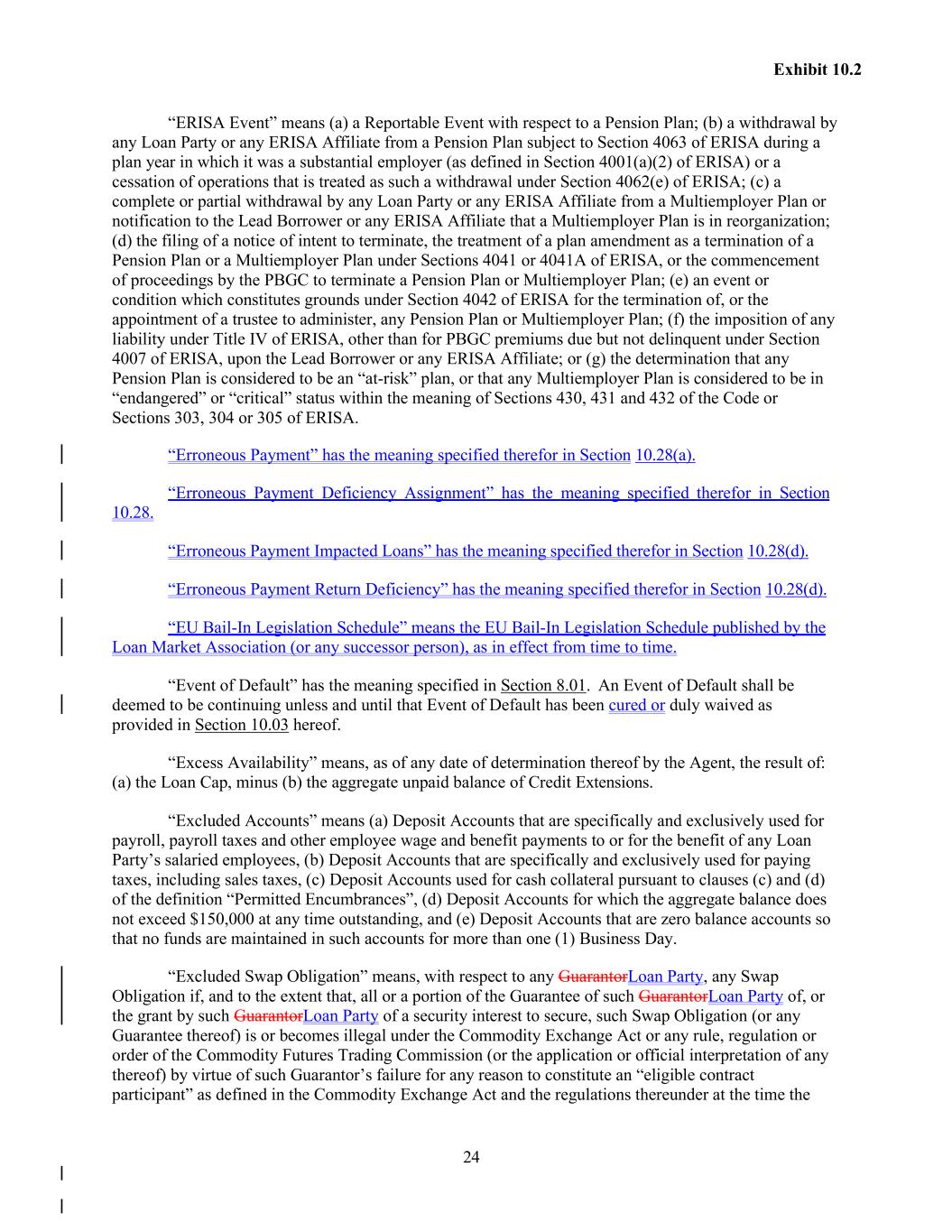 24 Exhibit 10.2 “ERISA Event” means (a) a Reportable Event with respect to a Pension Plan; (b) a withdrawal by any Loan Party or any ERISA Affiliate from a Pension Plan subject to Section 4063 of ERISA during a plan year in which it was a substantial employer (as defined in Section 4001(a)(2) of ERISA) or a cessation of operations that is treated as such a withdrawal under Section 4062(e) of ERISA; (c) a complete or partial withdrawal by any Loan Party or any ERISA Affiliate from a Multiemployer Plan or notification to the Lead Borrower or any ERISA Affiliate that a Multiemployer Plan is in reorganization; (d) the filing of a notice of intent to terminate, the treatment of a plan amendment as a termination of a Pension Plan or a Multiemployer Plan under Sections 4041 or 4041A of ERISA, or the commencement of proceedings by the PBGC to terminate a Pension Plan or Multiemployer Plan; (e) an event or condition which constitutes grounds under Section 4042 of ERISA for the termination of, or the appointment of a trustee to administer, any Pension Plan or Multiemployer Plan; (f) the imposition of any liability under Title IV of ERISA, other than for PBGC premiums due but not delinquent under Section 4007 of ERISA, upon the Lead Borrower or any ERISA Affiliate; or (g) the determination that any Pension Plan is considered to be an “at-risk” plan, or that any Multiemployer Plan is considered to be in “endangered” or “critical” status within the meaning of Sections 430, 431 and 432 of the Code or Sections 303, 304 or 305 of ERISA. “Erroneous Payment” has the meaning specified therefor in Section 10.28(a). “Erroneous Payment Deficiency Assignment” has the meaning specified therefor in Section 10.28. “Erroneous Payment Impacted Loans” has the meaning specified therefor in Section 10.28(d). “Erroneous Payment Return Deficiency” has the meaning specified therefor in Section 10.28(d). “EU Bail-In Legislation Schedule” means the EU Bail-In Legislation Schedule published by the Loan Market Association (or any successor person), as in effect from time to time. “Event of Default” has the meaning specified in Section 8.01. An Event of Default shall be deemed to be continuing unless and until that Event of Default has been cured or duly waived as provided in Section 10.03 hereof. “Excess Availability” means, as of any date of determination thereof by the Agent, the result of: (a) the Loan Cap, minus (b) the aggregate unpaid balance of Credit Extensions. “Excluded Accounts” means (a) Deposit Accounts that are specifically and exclusively used for payroll, payroll taxes and other employee wage and benefit payments to or for the benefit of any Loan Party’s salaried employees, (b) Deposit Accounts that are specifically and exclusively used for paying taxes, including sales taxes, (c) Deposit Accounts used for cash collateral pursuant to clauses (c) and (d) of the definition “Permitted Encumbrances”, (d) Deposit Accounts for which the aggregate balance does not exceed $150,000 at any time outstanding, and (e) Deposit Accounts that are zero balance accounts so that no funds are maintained in such accounts for more than one (1) Business Day. “Excluded Swap Obligation” means, with respect to any GuarantorLoan Party, any Swap Obligation if, and to the extent that, all or a portion of the Guarantee of such GuarantorLoan Party of, or the grant by such GuarantorLoan Party of a security interest to secure, such Swap Obligation (or any Guarantee thereof) is or becomes illegal under the Commodity Exchange Act or any rule, regulation or order of the Commodity Futures Trading Commission (or the application or official interpretation of any thereof) by virtue of such Guarantor’s failure for any reason to constitute an “eligible contract participant” as defined in the Commodity Exchange Act and the regulations thereunder at the time the