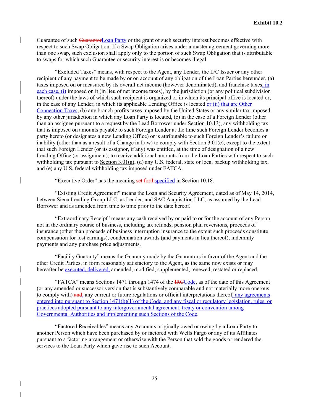 25 Exhibit 10.2 Guarantee of such GuarantorLoan Party or the grant of such security interest becomes effective with respect to such Swap Obligation. If a Swap Obligation arises under a master agreement governing more than one swap, such exclusion shall apply only to the portion of such Swap Obligation that is attributable to swaps for which such Guarantee or security interest is or becomes illegal. “Excluded Taxes” means, with respect to the Agent, any Lender, the L/C Issuer or any other recipient of any payment to be made by or on account of any obligation of the Loan Parties hereunder, (a) taxes imposed on or measured by its overall net income (however denominated), and franchise taxes, in each case, (i) imposed on it (in lieu of net income taxes), by the jurisdiction (or any political subdivision thereof) under the laws of which such recipient is organized or in which its principal office is located or, in the case of any Lender, in which its applicable Lending Office is located or (ii) that are Other Connection Taxes, (b) any branch profits taxes imposed by the United States or any similar tax imposed by any other jurisdiction in which any Loan Party is located, (c) in the case of a Foreign Lender (other than an assignee pursuant to a request by the Lead Borrower under Section 10.13), any withholding tax that is imposed on amounts payable to such Foreign Lender at the time such Foreign Lender becomes a party hereto (or designates a new Lending Office) or is attributable to such Foreign Lender’s failure or inability (other than as a result of a Change in Law) to comply with Section 3.01(e), except to the extent that such Foreign Lender (or its assignor, if any) was entitled, at the time of designation of a new Lending Office (or assignment), to receive additional amounts from the Loan Parties with respect to such withholding tax pursuant to Section 3.01(a), (d) any U.S. federal, state or local backup withholding tax, and (e) any U.S. federal withholding tax imposed under FATCA. “Executive Order” has the meaning set forthspecified in Section 10.18. “Existing Credit Agreement” means the Loan and Security Agreement, dated as of May 14, 2014, between Siena Lending Group LLC, as Lender, and SAC Acquisition LLC, as assumed by the Lead Borrower and as amended from time to time prior to the date hereof. “Extraordinary Receipt” means any cash received by or paid to or for the account of any Person not in the ordinary course of business, including tax refunds, pension plan reversions, proceeds of insurance (other than proceeds of business interruption insurance to the extent such proceeds constitute compensation for lost earnings), condemnation awards (and payments in lieu thereof), indemnity payments and any purchase price adjustments. “Facility Guaranty” means the Guaranty made by the Guarantors in favor of the Agent and the other Credit Parties, in form reasonably satisfactory to the Agent, as the same now exists or may hereafter be executed, delivered, amended, modified, supplemented, renewed, restated or replaced. “FATCA” means Sections 1471 through 1474 of the IRCCode, as of the date of this Agreement (or any amended or successor version that is substantively comparable and not materially more onerous to comply with) and, any current or future regulations or official interpretations thereof, any agreements entered into pursuant to Section 1471(b)(1) of the Code, and any fiscal or regulatory legislation, rules, or practices adopted pursuant to any intergovernmental agreement, treaty or convention among Governmental Authorities and implementing such Sections of the Code. “Factored Receivables” means any Accounts originally owed or owing by a Loan Party to another Person which have been purchased by or factored with Wells Fargo or any of its Affiliates pursuant to a factoring arrangement or otherwise with the Person that sold the goods or rendered the services to the Loan Party which gave rise to such Account.