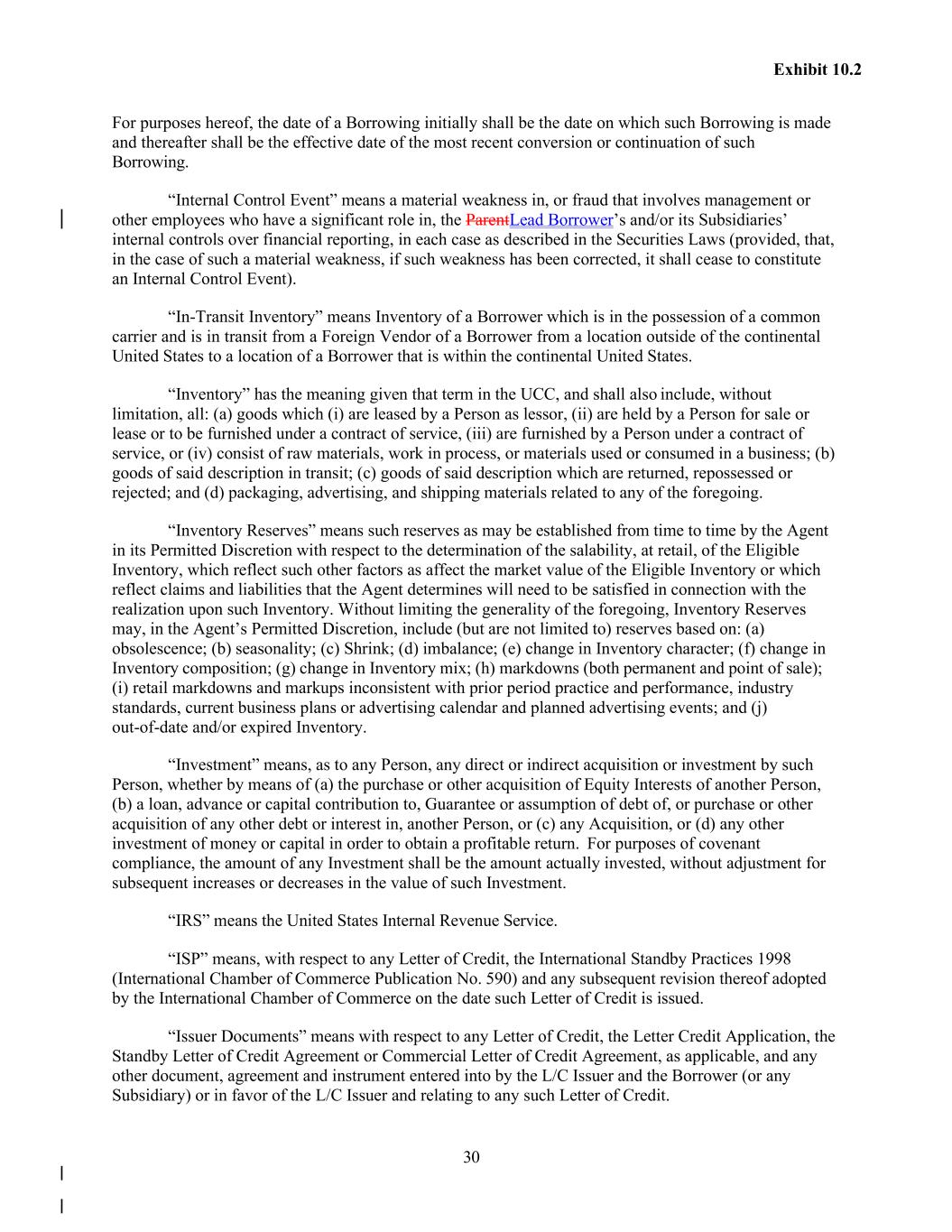 30 Exhibit 10.2 For purposes hereof, the date of a Borrowing initially shall be the date on which such Borrowing is made and thereafter shall be the effective date of the most recent conversion or continuation of such Borrowing. “Internal Control Event” means a material weakness in, or fraud that involves management or other employees who have a significant role in, the ParentLead Borrower’s and/or its Subsidiaries’ internal controls over financial reporting, in each case as described in the Securities Laws (provided, that, in the case of such a material weakness, if such weakness has been corrected, it shall cease to constitute an Internal Control Event). “In-Transit Inventory” means Inventory of a Borrower which is in the possession of a common carrier and is in transit from a Foreign Vendor of a Borrower from a location outside of the continental United States to a location of a Borrower that is within the continental United States. “Inventory” has the meaning given that term in the UCC, and shall also include, without limitation, all: (a) goods which (i) are leased by a Person as lessor, (ii) are held by a Person for sale or lease or to be furnished under a contract of service, (iii) are furnished by a Person under a contract of service, or (iv) consist of raw materials, work in process, or materials used or consumed in a business; (b) goods of said description in transit; (c) goods of said description which are returned, repossessed or rejected; and (d) packaging, advertising, and shipping materials related to any of the foregoing. “Inventory Reserves” means such reserves as may be established from time to time by the Agent in its Permitted Discretion with respect to the determination of the salability, at retail, of the Eligible Inventory, which reflect such other factors as affect the market value of the Eligible Inventory or which reflect claims and liabilities that the Agent determines will need to be satisfied in connection with the realization upon such Inventory. Without limiting the generality of the foregoing, Inventory Reserves may, in the Agent’s Permitted Discretion, include (but are not limited to) reserves based on: (a) obsolescence; (b) seasonality; (c) Shrink; (d) imbalance; (e) change in Inventory character; (f) change in Inventory composition; (g) change in Inventory mix; (h) markdowns (both permanent and point of sale); (i) retail markdowns and markups inconsistent with prior period practice and performance, industry standards, current business plans or advertising calendar and planned advertising events; and (j) out-of-date and/or expired Inventory. “Investment” means, as to any Person, any direct or indirect acquisition or investment by such Person, whether by means of (a) the purchase or other acquisition of Equity Interests of another Person, (b) a loan, advance or capital contribution to, Guarantee or assumption of debt of, or purchase or other acquisition of any other debt or interest in, another Person, or (c) any Acquisition, or (d) any other investment of money or capital in order to obtain a profitable return. For purposes of covenant compliance, the amount of any Investment shall be the amount actually invested, without adjustment for subsequent increases or decreases in the value of such Investment. “IRS” means the United States Internal Revenue Service. “ISP” means, with respect to any Letter of Credit, the International Standby Practices 1998 (International Chamber of Commerce Publication No. 590) and any subsequent revision thereof adopted by the International Chamber of Commerce on the date such Letter of Credit is issued. “Issuer Documents” means with respect to any Letter of Credit, the Letter Credit Application, the Standby Letter of Credit Agreement or Commercial Letter of Credit Agreement, as applicable, and any other document, agreement and instrument entered into by the L/C Issuer and the Borrower (or any Subsidiary) or in favor of the L/C Issuer and relating to any such Letter of Credit.