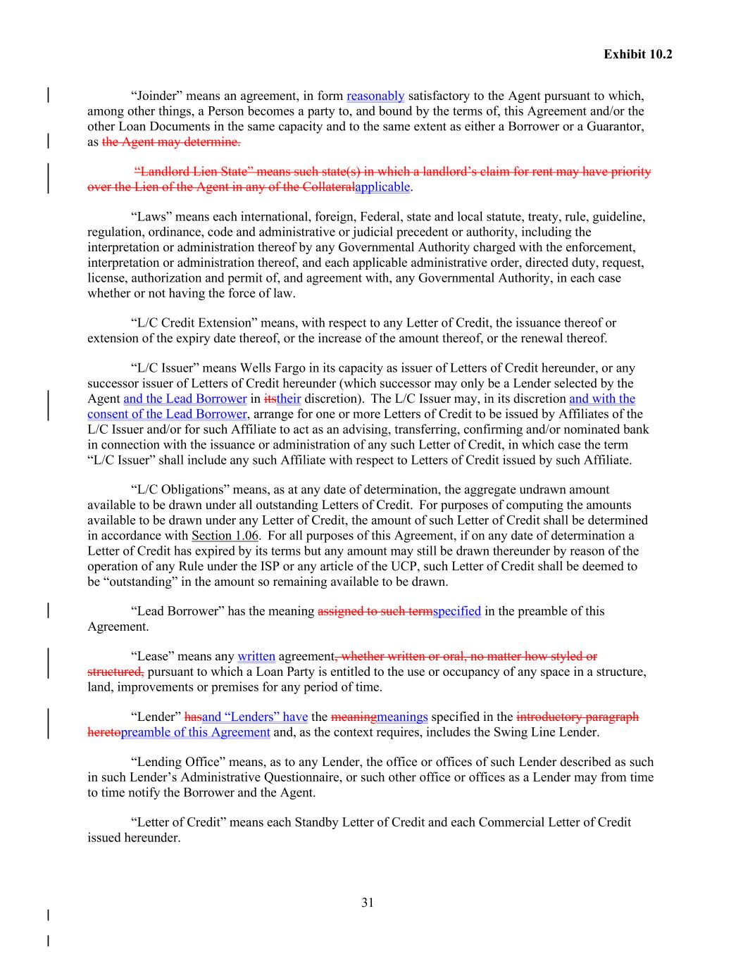 31 Exhibit 10.2 “Joinder” means an agreement, in form reasonably satisfactory to the Agent pursuant to which, among other things, a Person becomes a party to, and bound by the terms of, this Agreement and/or the other Loan Documents in the same capacity and to the same extent as either a Borrower or a Guarantor, as the Agent may determine. “Landlord Lien State” means such state(s) in which a landlord’s claim for rent may have priority over the Lien of the Agent in any of the Collateralapplicable. “Laws” means each international, foreign, Federal, state and local statute, treaty, rule, guideline, regulation, ordinance, code and administrative or judicial precedent or authority, including the interpretation or administration thereof by any Governmental Authority charged with the enforcement, interpretation or administration thereof, and each applicable administrative order, directed duty, request, license, authorization and permit of, and agreement with, any Governmental Authority, in each case whether or not having the force of law. “L/C Credit Extension” means, with respect to any Letter of Credit, the issuance thereof or extension of the expiry date thereof, or the increase of the amount thereof, or the renewal thereof. “L/C Issuer” means Wells Fargo in its capacity as issuer of Letters of Credit hereunder, or any successor issuer of Letters of Credit hereunder (which successor may only be a Lender selected by the Agent and the Lead Borrower in itstheir discretion). The L/C Issuer may, in its discretion and with the consent of the Lead Borrower, arrange for one or more Letters of Credit to be issued by Affiliates of the L/C Issuer and/or for such Affiliate to act as an advising, transferring, confirming and/or nominated bank in connection with the issuance or administration of any such Letter of Credit, in which case the term “L/C Issuer” shall include any such Affiliate with respect to Letters of Credit issued by such Affiliate. “L/C Obligations” means, as at any date of determination, the aggregate undrawn amount available to be drawn under all outstanding Letters of Credit. For purposes of computing the amounts available to be drawn under any Letter of Credit, the amount of such Letter of Credit shall be determined in accordance with Section 1.06. For all purposes of this Agreement, if on any date of determination a Letter of Credit has expired by its terms but any amount may still be drawn thereunder by reason of the operation of any Rule under the ISP or any article of the UCP, such Letter of Credit shall be deemed to be “outstanding” in the amount so remaining available to be drawn. “Lead Borrower” has the meaning assigned to such termspecified in the preamble of this Agreement. “Lease” means any written agreement, whether written or oral, no matter how styled or structured, pursuant to which a Loan Party is entitled to the use or occupancy of any space in a structure, land, improvements or premises for any period of time. “Lender” hasand “Lenders” have the meaningmeanings specified in the introductory paragraph heretopreamble of this Agreement and, as the context requires, includes the Swing Line Lender. “Lending Office” means, as to any Lender, the office or offices of such Lender described as such in such Lender’s Administrative Questionnaire, or such other office or offices as a Lender may from time to time notify the Borrower and the Agent. “Letter of Credit” means each Standby Letter of Credit and each Commercial Letter of Credit issued hereunder.