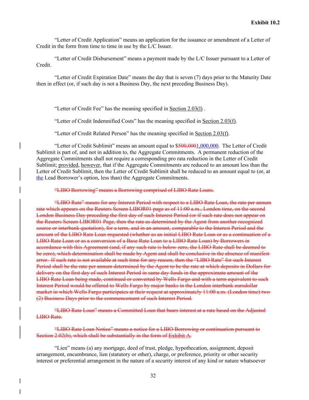 32 Exhibit 10.2 “Letter of Credit Application” means an application for the issuance or amendment of a Letter of Credit in the form from time to time in use by the L/C Issuer. “Letter of Credit Disbursement” means a payment made by the L/C Issuer pursuant to a Letter of Credit. “Letter of Credit Expiration Date” means the day that is seven (7) days prior to the Maturity Date then in effect (or, if such day is not a Business Day, the next preceding Business Day). “Letter of Credit Fee” has the meaning specified in Section 2.03(l) . “Letter of Credit Indemnified Costs” has the meaning specified in Section 2.03(f). “Letter of Credit Related Person” has the meaning specified in Section 2.03(f). “Letter of Credit Sublimit” means an amount equal to $500,0001,000,000. The Letter of Credit Sublimit is part of, and not in addition to, the Aggregate Commitments. A permanent reduction of the Aggregate Commitments shall not require a corresponding pro rata reduction in the Letter of Credit Sublimit; provided, however, that if the Aggregate Commitments are reduced to an amount less than the Letter of Credit Sublimit, then the Letter of Credit Sublimit shall be reduced to an amount equal to (or, at the Lead Borrower’s option, less than) the Aggregate Commitments. “LIBO Borrowing” means a Borrowing comprised of LIBO Rate Loans. “LIBO Rate” means for any Interest Period with respect to a LIBO Rate Loan, the rate per annum rate which appears on the Reuters Screen LIBOR01 page as of 11:00 a.m., London time, on the second London Business Day preceding the first day of such Interest Period (or if such rate does not appear on the Reuters Screen LIBOR01 Page, then the rate as determined by the Agent from another recognized source or interbank quotation), for a term, and in an amount, comparable to the Interest Period and the amount of the LIBO Rate Loan requested (whether as an initial LIBO Rate Loan or as a continuation of a LIBO Rate Loan or as a conversion of a Base Rate Loan to a LIBO Rate Loan) by Borrowers in accordance with this Agreement (and, if any such rate is below zero, the LIBO Rate shall be deemed to be zero), which determination shall be made by Agent and shall be conclusive in the absence of manifest error. If such rate is not available at such time for any reason, then the “LIBO Rate” for such Interest Period shall be the rate per annum determined by the Agent to be the rate at which deposits in Dollars for delivery on the first day of such Interest Period in same day funds in the approximate amount of the LIBO Rate Loan being made, continued or converted by Wells Fargo and with a term equivalent to such Interest Period would be offered to Wells Fargo by major banks in the London interbank eurodollar market in which Wells Fargo participates at their request at approximately 11:00 a.m. (London time) two (2) Business Days prior to the commencement of such Interest Period. “LIBO Rate Loan” means a Committed Loan that bears interest at a rate based on the Adjusted LIBO Rate. “LIBO Rate Loan Notice” means a notice for a LIBO Borrowing or continuation pursuant to Section 2.02(b), which shall be substantially in the form of Exhibit A. “Lien” means (a) any mortgage, deed of trust, pledge, hypothecation, assignment, deposit arrangement, encumbrance, lien (statutory or other), charge, or preference, priority or other security interest or preferential arrangement in the nature of a security interest of any kind or nature whatsoever