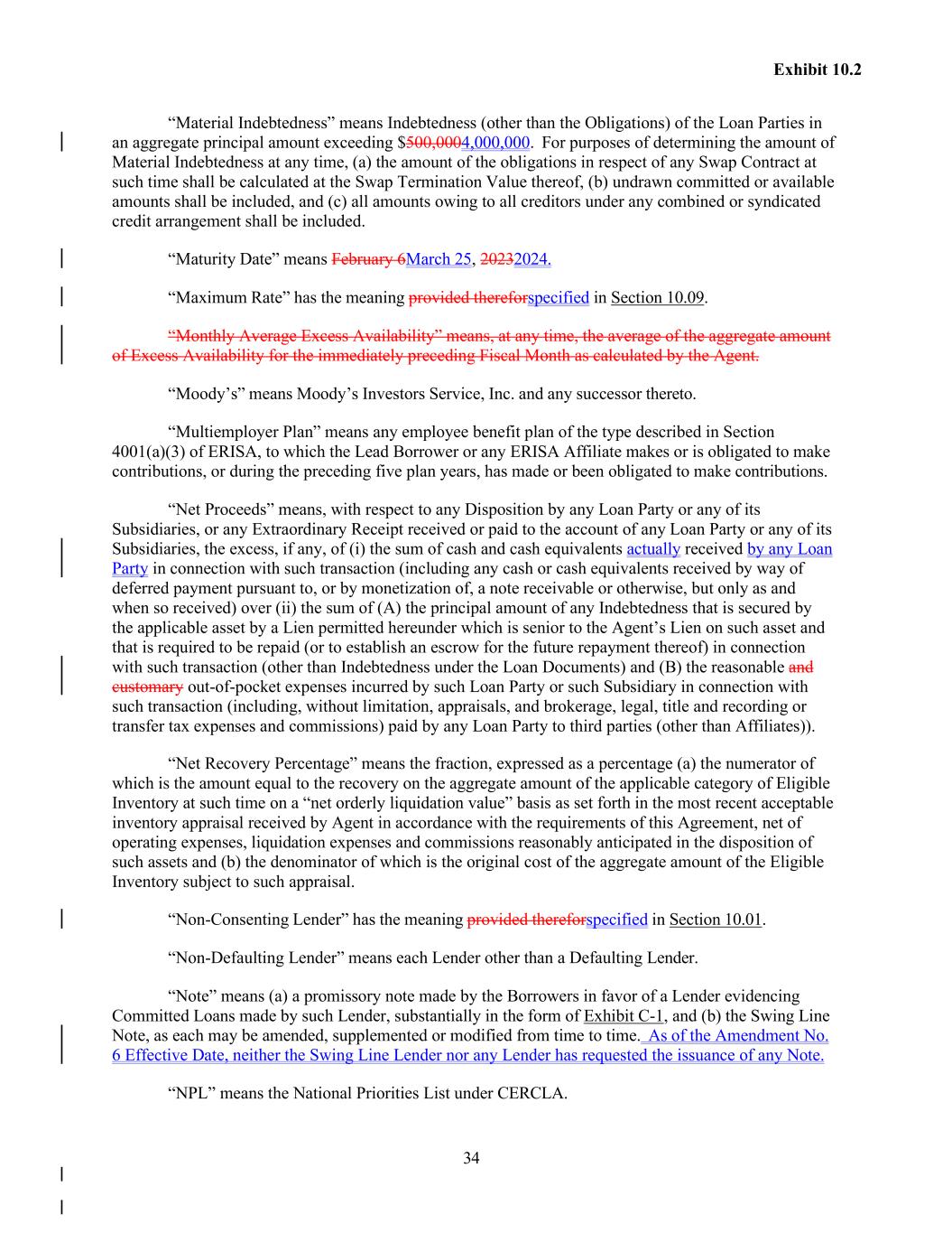 34 Exhibit 10.2 “Material Indebtedness” means Indebtedness (other than the Obligations) of the Loan Parties in an aggregate principal amount exceeding $500,0004,000,000. For purposes of determining the amount of Material Indebtedness at any time, (a) the amount of the obligations in respect of any Swap Contract at such time shall be calculated at the Swap Termination Value thereof, (b) undrawn committed or available amounts shall be included, and (c) all amounts owing to all creditors under any combined or syndicated credit arrangement shall be included. “Maturity Date” means February 6March 25, 20232024. “Maximum Rate” has the meaning provided thereforspecified in Section 10.09. “Monthly Average Excess Availability” means, at any time, the average of the aggregate amount of Excess Availability for the immediately preceding Fiscal Month as calculated by the Agent. “Moody’s” means Moody’s Investors Service, Inc. and any successor thereto. “Multiemployer Plan” means any employee benefit plan of the type described in Section 4001(a)(3) of ERISA, to which the Lead Borrower or any ERISA Affiliate makes or is obligated to make contributions, or during the preceding five plan years, has made or been obligated to make contributions. “Net Proceeds” means, with respect to any Disposition by any Loan Party or any of its Subsidiaries, or any Extraordinary Receipt received or paid to the account of any Loan Party or any of its Subsidiaries, the excess, if any, of (i) the sum of cash and cash equivalents actually received by any Loan Party in connection with such transaction (including any cash or cash equivalents received by way of deferred payment pursuant to, or by monetization of, a note receivable or otherwise, but only as and when so received) over (ii) the sum of (A) the principal amount of any Indebtedness that is secured by the applicable asset by a Lien permitted hereunder which is senior to the Agent’s Lien on such asset and that is required to be repaid (or to establish an escrow for the future repayment thereof) in connection with such transaction (other than Indebtedness under the Loan Documents) and (B) the reasonable and customary out-of-pocket expenses incurred by such Loan Party or such Subsidiary in connection with such transaction (including, without limitation, appraisals, and brokerage, legal, title and recording or transfer tax expenses and commissions) paid by any Loan Party to third parties (other than Affiliates)). “Net Recovery Percentage” means the fraction, expressed as a percentage (a) the numerator of which is the amount equal to the recovery on the aggregate amount of the applicable category of Eligible Inventory at such time on a “net orderly liquidation value” basis as set forth in the most recent acceptable inventory appraisal received by Agent in accordance with the requirements of this Agreement, net of operating expenses, liquidation expenses and commissions reasonably anticipated in the disposition of such assets and (b) the denominator of which is the original cost of the aggregate amount of the Eligible Inventory subject to such appraisal. “Non-Consenting Lender” has the meaning provided thereforspecified in Section 10.01. “Non-Defaulting Lender” means each Lender other than a Defaulting Lender. “Note” means (a) a promissory note made by the Borrowers in favor of a Lender evidencing Committed Loans made by such Lender, substantially in the form of Exhibit C-1, and (b) the Swing Line Note, as each may be amended, supplemented or modified from time to time. As of the Amendment No. 6 Effective Date, neither the Swing Line Lender nor any Lender has requested the issuance of any Note. “NPL” means the National Priorities List under CERCLA.