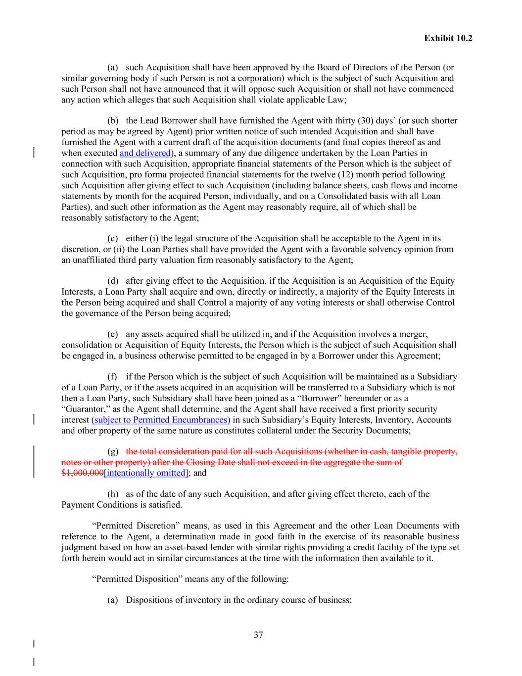 37 Exhibit 10.2 (a) such Acquisition shall have been approved by the Board of Directors of the Person (or similar governing body if such Person is not a corporation) which is the subject of such Acquisition and such Person shall not have announced that it will oppose such Acquisition or shall not have commenced any action which alleges that such Acquisition shall violate applicable Law; (b) the Lead Borrower shall have furnished the Agent with thirty (30) days’ (or such shorter period as may be agreed by Agent) prior written notice of such intended Acquisition and shall have furnished the Agent with a current draft of the acquisition documents (and final copies thereof as and when executed and delivered), a summary of any due diligence undertaken by the Loan Parties in connection with such Acquisition, appropriate financial statements of the Person which is the subject of such Acquisition, pro forma projected financial statements for the twelve (12) month period following such Acquisition after giving effect to such Acquisition (including balance sheets, cash flows and income statements by month for the acquired Person, individually, and on a Consolidated basis with all Loan Parties), and such other information as the Agent may reasonably require, all of which shall be reasonably satisfactory to the Agent; (c) either (i) the legal structure of the Acquisition shall be acceptable to the Agent in its discretion, or (ii) the Loan Parties shall have provided the Agent with a favorable solvency opinion from an unaffiliated third party valuation firm reasonably satisfactory to the Agent; (d) after giving effect to the Acquisition, if the Acquisition is an Acquisition of the Equity Interests, a Loan Party shall acquire and own, directly or indirectly, a majority of the Equity Interests in the Person being acquired and shall Control a majority of any voting interests or shall otherwise Control the governance of the Person being acquired; (e) any assets acquired shall be utilized in, and if the Acquisition involves a merger, consolidation or Acquisition of Equity Interests, the Person which is the subject of such Acquisition shall be engaged in, a business otherwise permitted to be engaged in by a Borrower under this Agreement; (f) if the Person which is the subject of such Acquisition will be maintained as a Subsidiary of a Loan Party, or if the assets acquired in an acquisition will be transferred to a Subsidiary which is not then a Loan Party, such Subsidiary shall have been joined as a “Borrower” hereunder or as a “Guarantor,” as the Agent shall determine, and the Agent shall have received a first priority security interest (subject to Permitted Encumbrances) in such Subsidiary’s Equity Interests, Inventory, Accounts and other property of the same nature as constitutes collateral under the Security Documents; (g) the total consideration paid for all such Acquisitions (whether in cash, tangible property, notes or other property) after the Closing Date shall not exceed in the aggregate the sum of $1,000,000[intentionally omitted]; and (h) as of the date of any such Acquisition, and after giving effect thereto, each of the Payment Conditions is satisfied. “Permitted Discretion” means, as used in this Agreement and the other Loan Documents with reference to the Agent, a determination made in good faith in the exercise of its reasonable business judgment based on how an asset-based lender with similar rights providing a credit facility of the type set forth herein would act in similar circumstances at the time with the information then available to it. “Permitted Disposition” means any of the following: (a) Dispositions of inventory in the ordinary course of business;