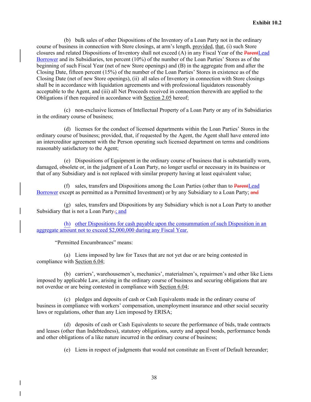 38 Exhibit 10.2 (b) bulk sales of other Dispositions of the Inventory of a Loan Party not in the ordinary course of business in connection with Store closings, at arm’s length, provided, that, (i) such Store closures and related Dispositions of Inventory shall not exceed (A) in any Fiscal Year of the ParentLead Borrower and its Subsidiaries, ten percent (10%) of the number of the Loan Parties’ Stores as of the beginning of such Fiscal Year (net of new Store openings) and (B) in the aggregate from and after the Closing Date, fifteen percent (15%) of the number of the Loan Parties’ Stores in existence as of the Closing Date (net of new Store openings), (ii) all sales of Inventory in connection with Store closings shall be in accordance with liquidation agreements and with professional liquidators reasonably acceptable to the Agent, and (iii) all Net Proceeds received in connection therewith are applied to the Obligations if then required in accordance with Section 2.05 hereof; (c) non-exclusive licenses of Intellectual Property of a Loan Party or any of its Subsidiaries in the ordinary course of business; (d) licenses for the conduct of licensed departments within the Loan Parties’ Stores in the ordinary course of business; provided, that, if requested by the Agent, the Agent shall have entered into an intercreditor agreement with the Person operating such licensed department on terms and conditions reasonably satisfactory to the Agent; (e) Dispositions of Equipment in the ordinary course of business that is substantially worn, damaged, obsolete or, in the judgment of a Loan Party, no longer useful or necessary in its business or that of any Subsidiary and is not replaced with similar property having at least equivalent value; (f) sales, transfers and Dispositions among the Loan Parties (other than to ParentLead Borrower except as permitted as a Permitted Investment) or by any Subsidiary to a Loan Party; and (g) sales, transfers and Dispositions by any Subsidiary which is not a Loan Party to another Subsidiary that is not a Loan Party.; and (h) other Dispositions for cash payable upon the consummation of such Disposition in an aggregate amount not to exceed $2,000,000 during any Fiscal Year. “Permitted Encumbrances” means: (a) Liens imposed by law for Taxes that are not yet due or are being contested in compliance with Section 6.04; (b) carriers’, warehousemen’s, mechanics’, materialmen’s, repairmen’s and other like Liens imposed by applicable Law, arising in the ordinary course of business and securing obligations that are not overdue or are being contested in compliance with Section 6.04; (c) pledges and deposits of cash or Cash Equivalents made in the ordinary course of business in compliance with workers’ compensation, unemployment insurance and other social security laws or regulations, other than any Lien imposed by ERISA; (d) deposits of cash or Cash Equivalents to secure the performance of bids, trade contracts and leases (other than Indebtedness), statutory obligations, surety and appeal bonds, performance bonds and other obligations of a like nature incurred in the ordinary course of business; (e) Liens in respect of judgments that would not constitute an Event of Default hereunder;