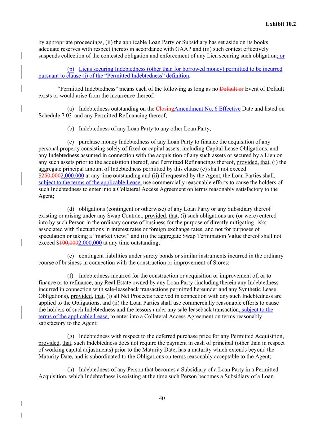 40 Exhibit 10.2 by appropriate proceedings, (ii) the applicable Loan Party or Subsidiary has set aside on its books adequate reserves with respect thereto in accordance with GAAP and (iii) such contest effectively suspends collection of the contested obligation and enforcement of any Lien securing such obligation; or (p) Liens securing Indebtedness (other than for borrowed money) permitted to be incurred pursuant to clause (j) of the “Permitted Indebtedness” definition. “Permitted Indebtedness” means each of the following as long as no Default or Event of Default exists or would arise from the incurrence thereof: (a) Indebtedness outstanding on the ClosingAmendment No. 6 Effective Date and listed on Schedule 7.03 and any Permitted Refinancing thereof; (b) Indebtedness of any Loan Party to any other Loan Party; (c) purchase money Indebtedness of any Loan Party to finance the acquisition of any personal property consisting solely of fixed or capital assets, including Capital Lease Obligations, and any Indebtedness assumed in connection with the acquisition of any such assets or secured by a Lien on any such assets prior to the acquisition thereof, and Permitted Refinancings thereof, provided, that, (i) the aggregate principal amount of Indebtedness permitted by this clause (c) shall not exceed $250,0002,000,000 at any time outstanding and (ii) if requested by the Agent, the Loan Parties shall, subject to the terms of the applicable Lease, use commercially reasonable efforts to cause the holders of such Indebtedness to enter into a Collateral Access Agreement on terms reasonably satisfactory to the Agent; (d) obligations (contingent or otherwise) of any Loan Party or any Subsidiary thereof existing or arising under any Swap Contract, provided, that, (i) such obligations are (or were) entered into by such Person in the ordinary course of business for the purpose of directly mitigating risks associated with fluctuations in interest rates or foreign exchange rates, and not for purposes of speculation or taking a “market view;” and (ii) the aggregate Swap Termination Value thereof shall not exceed $100,0002,000,000 at any time outstanding; (e) contingent liabilities under surety bonds or similar instruments incurred in the ordinary course of business in connection with the construction or improvement of Stores; (f) Indebtedness incurred for the construction or acquisition or improvement of, or to finance or to refinance, any Real Estate owned by any Loan Party (including therein any Indebtedness incurred in connection with sale-leaseback transactions permitted hereunder and any Synthetic Lease Obligations), provided, that, (i) all Net Proceeds received in connection with any such Indebtedness are applied to the Obligations, and (ii) the Loan Parties shall use commercially reasonable efforts to cause the holders of such Indebtedness and the lessors under any sale-leaseback transaction, subject to the terms of the applicable Lease, to enter into a Collateral Access Agreement on terms reasonably satisfactory to the Agent; (g) Indebtedness with respect to the deferred purchase price for any Permitted Acquisition, provided, that, such Indebtedness does not require the payment in cash of principal (other than in respect of working capital adjustments) prior to the Maturity Date, has a maturity which extends beyond the Maturity Date, and is subordinated to the Obligations on terms reasonably acceptable to the Agent; (h) Indebtedness of any Person that becomes a Subsidiary of a Loan Party in a Permitted Acquisition, which Indebtedness is existing at the time such Person becomes a Subsidiary of a Loan