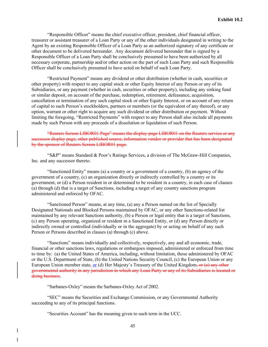 45 Exhibit 10.2 “Responsible Officer” means the chief executive officer, president, chief financial officer, treasurer or assistant treasurer of a Loan Party or any of the other individuals designated in writing to the Agent by an existing Responsible Officer of a Loan Party as an authorized signatory of any certificate or other document to be delivered hereunder. Any document delivered hereunder that is signed by a Responsible Officer of a Loan Party shall be conclusively presumed to have been authorized by all necessary corporate, partnership and/or other action on the part of such Loan Party and such Responsible Officer shall be conclusively presumed to have acted on behalf of such Loan Party. “Restricted Payment” means any dividend or other distribution (whether in cash, securities or other property) with respect to any capital stock or other Equity Interest of any Person or any of its Subsidiaries, or any payment (whether in cash, securities or other property), including any sinking fund or similar deposit, on account of the purchase, redemption, retirement, defeasance, acquisition, cancellation or termination of any such capital stock or other Equity Interest, or on account of any return of capital to such Person’s stockholders, partners or members (or the equivalent of any thereof), or any option, warrant or other right to acquire any such dividend or other distribution or payment. Without limiting the foregoing, “Restricted Payments” with respect to any Person shall also include all payments made by such Person with any proceeds of a dissolution or liquidation of such Person. “Reuters Screen LIBOR01 Page” means the display page LIBOR01 on the Reuters service or any successor display page, other published source, information vendor or provider that has been designated by the sponsor of Reuters Screen LIBOR01 page. “S&P” means Standard & Poor’s Ratings Services, a division of The McGraw-Hill Companies, Inc. and any successor thereto. “Sanctioned Entity” means (a) a country or a government of a country, (b) an agency of the government of a country, (c) an organization directly or indirectly controlled by a country or its government, or (d) a Person resident in or determined to be resident in a country, in each case of clauses (a) through (d) that is a target of Sanctions, including a target of any country sanctions program administered and enforced by OFAC. “Sanctioned Person” means, at any time, (a) any a Person named on the list of Specially Designated Nationals and Blocked Persons maintained by OFAC, or any other Sanctions-related list maintained by any relevant Sanctions authority, (b) a Person or legal entity that is a target of Sanctions, (c) any Person operating, organized or resident in a Sanctioned Entity, or (d) any Person directly or indirectly owned or controlled (individually or in the aggregate) by or acting on behalf of any such Person or Persons described in clauses (a) through (c) above. “Sanctions” means individually and collectively, respectively, any and all economic, trade, financial or other sanctions laws, regulations or embargoes imposed, administered or enforced from time to time by: (a) the United States of America, including, without limitation, those administered by OFAC or the U.S. Department of State, (b) the United Nations Security Council, (c) the European Union or any European Union member state, or (d) Her Majesty’s Treasury of the United Kingdom, or (e) any other governmental authority in any jurisdiction in which any Loan Party or any of its Subsidiaries is located or doing business. “Sarbanes-Oxley” means the Sarbanes-Oxley Act of 2002. “SEC” means the Securities and Exchange Commission, or any Governmental Authority succeeding to any of its principal functions. “Securities Account” has the meaning given to such term in the UCC.