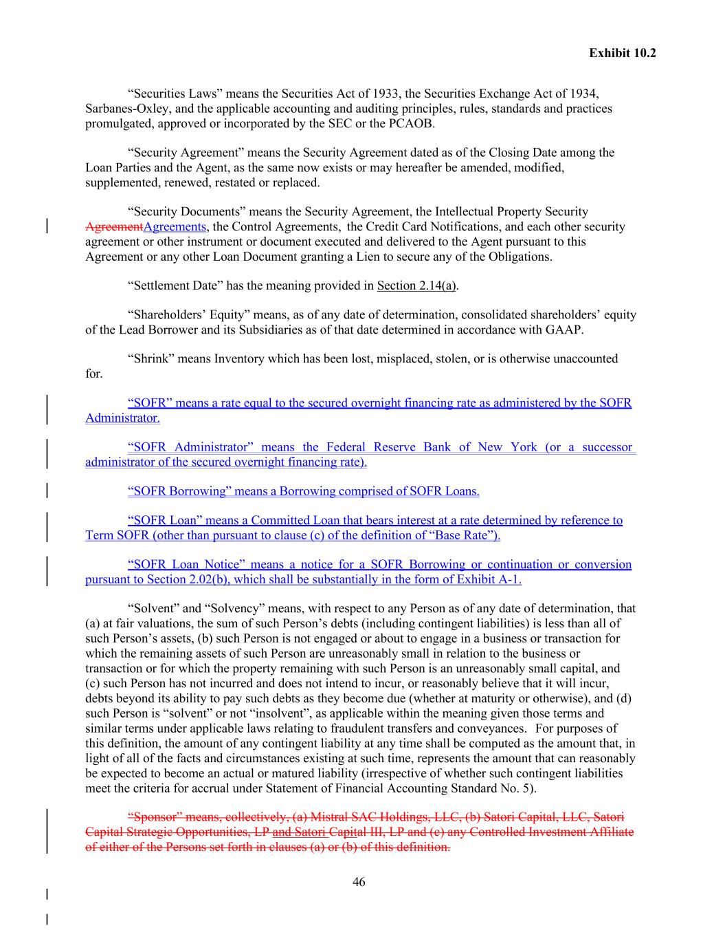 46 Exhibit 10.2 “Securities Laws” means the Securities Act of 1933, the Securities Exchange Act of 1934, Sarbanes-Oxley, and the applicable accounting and auditing principles, rules, standards and practices promulgated, approved or incorporated by the SEC or the PCAOB. “Security Agreement” means the Security Agreement dated as of the Closing Date among the Loan Parties and the Agent, as the same now exists or may hereafter be amended, modified, supplemented, renewed, restated or replaced. “Security Documents” means the Security Agreement, the Intellectual Property Security AgreementAgreements, the Control Agreements, the Credit Card Notifications, and each other security agreement or other instrument or document executed and delivered to the Agent pursuant to this Agreement or any other Loan Document granting a Lien to secure any of the Obligations. “Settlement Date” has the meaning provided in Section 2.14(a). “Shareholders’ Equity” means, as of any date of determination, consolidated shareholders’ equity of the Lead Borrower and its Subsidiaries as of that date determined in accordance with GAAP. “Shrink” means Inventory which has been lost, misplaced, stolen, or is otherwise unaccounted for. “SOFR” means a rate equal to the secured overnight financing rate as administered by the SOFR Administrator. “SOFR Administrator” means the Federal Reserve Bank of New York (or a successor administrator of the secured overnight financing rate). “SOFR Borrowing” means a Borrowing comprised of SOFR Loans. “SOFR Loan” means a Committed Loan that bears interest at a rate determined by reference to Term SOFR (other than pursuant to clause (c) of the definition of “Base Rate”). “SOFR Loan Notice” means a notice for a SOFR Borrowing or continuation or conversion pursuant to Section 2.02(b), which shall be substantially in the form of Exhibit A-1. “Solvent” and “Solvency” means, with respect to any Person as of any date of determination, that (a) at fair valuations, the sum of such Person’s debts (including contingent liabilities) is less than all of such Person’s assets, (b) such Person is not engaged or about to engage in a business or transaction for which the remaining assets of such Person are unreasonably small in relation to the business or transaction or for which the property remaining with such Person is an unreasonably small capital, and (c) such Person has not incurred and does not intend to incur, or reasonably believe that it will incur, debts beyond its ability to pay such debts as they become due (whether at maturity or otherwise), and (d) such Person is “solvent” or not “insolvent”, as applicable within the meaning given those terms and similar terms under applicable laws relating to fraudulent transfers and conveyances. For purposes of this definition, the amount of any contingent liability at any time shall be computed as the amount that, in light of all of the facts and circumstances existing at such time, represents the amount that can reasonably be expected to become an actual or matured liability (irrespective of whether such contingent liabilities meet the criteria for accrual under Statement of Financial Accounting Standard No. 5). “Sponsor” means, collectively, (a) Mistral SAC Holdings, LLC, (b) Satori Capital, LLC, Satori Capital Strategic Opportunities, LP and Satori Capital III, LP and (c) any Controlled Investment Affiliate of either of the Persons set forth in clauses (a) or (b) of this definition.