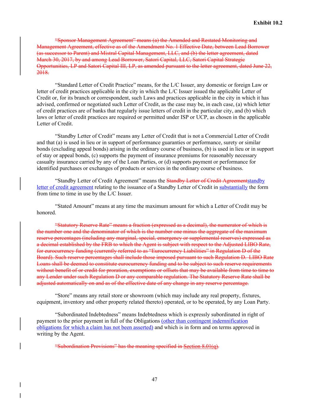 47 Exhibit 10.2 “Sponsor Management Agreement” means (a) the Amended and Restated Monitoring and Management Agreement, effective as of the Amendment No. 1 Effective Date, between Lead Borrower (as successor to Parent) and Mistral Capital Management, LLC, and (b) the letter agreement, dated March 30, 2017, by and among Lead Borrower, Satori Capital, LLC, Satori Capital Strategic Opportunities, LP and Satori Capital III, LP, as amended pursuant to the letter agreement, dated June 22, 2018. “Standard Letter of Credit Practice” means, for the L/C Issuer, any domestic or foreign Law or letter of credit practices applicable in the city in which the L/C Issuer issued the applicable Letter of Credit or, for its branch or correspondent, such Laws and practices applicable in the city in which it has advised, confirmed or negotiated such Letter of Credit, as the case may be, in each case, (a) which letter of credit practices are of banks that regularly issue letters of credit in the particular city, and (b) which laws or letter of credit practices are required or permitted under ISP or UCP, as chosen in the applicable Letter of Credit. “Standby Letter of Credit” means any Letter of Credit that is not a Commercial Letter of Credit and that (a) is used in lieu or in support of performance guaranties or performance, surety or similar bonds (excluding appeal bonds) arising in the ordinary course of business, (b) is used in lieu or in support of stay or appeal bonds, (c) supports the payment of insurance premiums for reasonably necessary casualty insurance carried by any of the Loan Parties, or (d) supports payment or performance for identified purchases or exchanges of products or services in the ordinary course of business. “Standby Letter of Credit Agreement” means the Standby Letter of Credit Agreementstandby letter of credit agreement relating to the issuance of a Standby Letter of Credit in substantially the form from time to time in use by the L/C Issuer. “Stated Amount” means at any time the maximum amount for which a Letter of Credit may be honored. “Statutory Reserve Rate” means a fraction (expressed as a decimal), the numerator of which is the number one and the denominator of which is the number one minus the aggregate of the maximum reserve percentages (including any marginal, special, emergency or supplemental reserves) expressed as a decimal established by the FRB to which the Agent is subject with respect to the Adjusted LIBO Rate, for eurocurrency funding (currently referred to as “Eurocurrency Liabilities” in Regulation D of the Board). Such reserve percentages shall include those imposed pursuant to such Regulation D. LIBO Rate Loans shall be deemed to constitute eurocurrency funding and to be subject to such reserve requirements without benefit of or credit for proration, exemptions or offsets that may be available from time to time to any Lender under such Regulation D or any comparable regulation. The Statutory Reserve Rate shall be adjusted automatically on and as of the effective date of any change in any reserve percentage. “Store” means any retail store or showroom (which may include any real property, fixtures, equipment, inventory and other property related thereto) operated, or to be operated, by any Loan Party. “Subordinated Indebtedness” means Indebtedness which is expressly subordinated in right of payment to the prior payment in full of the Obligations (other than contingent indemnification obligations for which a claim has not been asserted) and which is in form and on terms approved in writing by the Agent. “Subordination Provisions” has the meaning specified in Section 8.01(q).