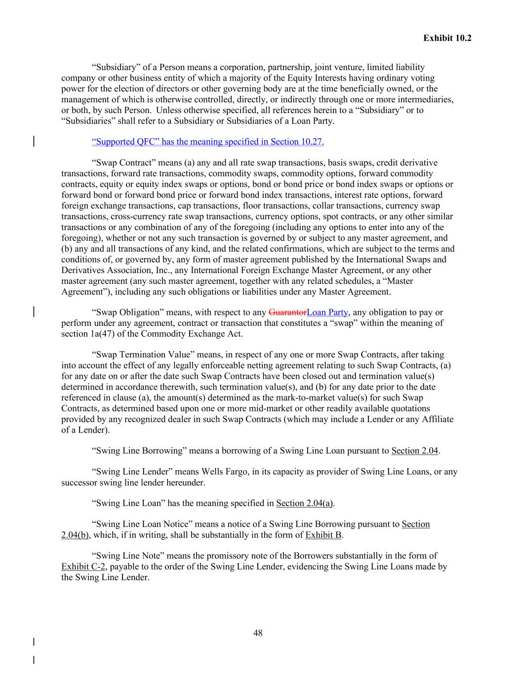 48 Exhibit 10.2 “Subsidiary” of a Person means a corporation, partnership, joint venture, limited liability company or other business entity of which a majority of the Equity Interests having ordinary voting power for the election of directors or other governing body are at the time beneficially owned, or the management of which is otherwise controlled, directly, or indirectly through one or more intermediaries, or both, by such Person. Unless otherwise specified, all references herein to a “Subsidiary” or to “Subsidiaries” shall refer to a Subsidiary or Subsidiaries of a Loan Party. “Supported QFC” has the meaning specified in Section 10.27. “Swap Contract” means (a) any and all rate swap transactions, basis swaps, credit derivative transactions, forward rate transactions, commodity swaps, commodity options, forward commodity contracts, equity or equity index swaps or options, bond or bond price or bond index swaps or options or forward bond or forward bond price or forward bond index transactions, interest rate options, forward foreign exchange transactions, cap transactions, floor transactions, collar transactions, currency swap transactions, cross-currency rate swap transactions, currency options, spot contracts, or any other similar transactions or any combination of any of the foregoing (including any options to enter into any of the foregoing), whether or not any such transaction is governed by or subject to any master agreement, and (b) any and all transactions of any kind, and the related confirmations, which are subject to the terms and conditions of, or governed by, any form of master agreement published by the International Swaps and Derivatives Association, Inc., any International Foreign Exchange Master Agreement, or any other master agreement (any such master agreement, together with any related schedules, a “Master Agreement”), including any such obligations or liabilities under any Master Agreement. “Swap Obligation” means, with respect to any GuarantorLoan Party, any obligation to pay or perform under any agreement, contract or transaction that constitutes a “swap” within the meaning of section 1a(47) of the Commodity Exchange Act. “Swap Termination Value” means, in respect of any one or more Swap Contracts, after taking into account the effect of any legally enforceable netting agreement relating to such Swap Contracts, (a) for any date on or after the date such Swap Contracts have been closed out and termination value(s) determined in accordance therewith, such termination value(s), and (b) for any date prior to the date referenced in clause (a), the amount(s) determined as the mark-to-market value(s) for such Swap Contracts, as determined based upon one or more mid-market or other readily available quotations provided by any recognized dealer in such Swap Contracts (which may include a Lender or any Affiliate of a Lender). “Swing Line Borrowing” means a borrowing of a Swing Line Loan pursuant to Section 2.04. “Swing Line Lender” means Wells Fargo, in its capacity as provider of Swing Line Loans, or any successor swing line lender hereunder. “Swing Line Loan” has the meaning specified in Section 2.04(a). “Swing Line Loan Notice” means a notice of a Swing Line Borrowing pursuant to Section 2.04(b), which, if in writing, shall be substantially in the form of Exhibit B. “Swing Line Note” means the promissory note of the Borrowers substantially in the form of Exhibit C-2, payable to the order of the Swing Line Lender, evidencing the Swing Line Loans made by the Swing Line Lender.