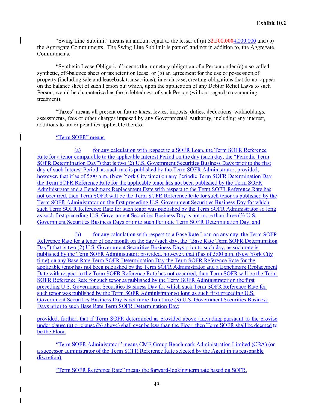 49 Exhibit 10.2 “Swing Line Sublimit” means an amount equal to the lesser of (a) $2,500,0004,000,000 and (b) the Aggregate Commitments. The Swing Line Sublimit is part of, and not in addition to, the Aggregate Commitments. “Synthetic Lease Obligation” means the monetary obligation of a Person under (a) a so-called synthetic, off-balance sheet or tax retention lease, or (b) an agreement for the use or possession of property (including sale and leaseback transactions), in each case, creating obligations that do not appear on the balance sheet of such Person but which, upon the application of any Debtor Relief Laws to such Person, would be characterized as the indebtedness of such Person (without regard to accounting treatment). “Taxes” means all present or future taxes, levies, imposts, duties, deductions, withholdings, assessments, fees or other charges imposed by any Governmental Authority, including any interest, additions to tax or penalties applicable thereto. “Term SOFR” means, (a) for any calculation with respect to a SOFR Loan, the Term SOFR Reference Rate for a tenor comparable to the applicable Interest Period on the day (such day, the “Periodic Term SOFR Determination Day”) that is two (2) U.S. Government Securities Business Days prior to the first day of such Interest Period, as such rate is published by the Term SOFR Administrator; provided, however, that if as of 5:00 p.m. (New York City time) on any Periodic Term SOFR Determination Day the Term SOFR Reference Rate for the applicable tenor has not been published by the Term SOFR Administrator and a Benchmark Replacement Date with respect to the Term SOFR Reference Rate has not occurred, then Term SOFR will be the Term SOFR Reference Rate for such tenor as published by the Term SOFR Administrator on the first preceding U.S. Government Securities Business Day for which such Term SOFR Reference Rate for such tenor was published by the Term SOFR Administrator so long as such first preceding U.S. Government Securities Business Day is not more than three (3) U.S. Government Securities Business Days prior to such Periodic Term SOFR Determination Day, and (b) for any calculation with respect to a Base Rate Loan on any day, the Term SOFR Reference Rate for a tenor of one month on the day (such day, the “Base Rate Term SOFR Determination Day”) that is two (2) U.S. Government Securities Business Days prior to such day, as such rate is published by the Term SOFR Administrator; provided, however, that if as of 5:00 p.m. (New York City time) on any Base Rate Term SOFR Determination Day the Term SOFR Reference Rate for the applicable tenor has not been published by the Term SOFR Administrator and a Benchmark Replacement Date with respect to the Term SOFR Reference Rate has not occurred, then Term SOFR will be the Term SOFR Reference Rate for such tenor as published by the Term SOFR Administrator on the first preceding U.S. Government Securities Business Day for which such Term SOFR Reference Rate for such tenor was published by the Term SOFR Administrator so long as such first preceding U.S. Government Securities Business Day is not more than three (3) U.S. Government Securities Business Days prior to such Base Rate Term SOFR Determination Day; provided, further, that if Term SOFR determined as provided above (including pursuant to the proviso under clause (a) or clause (b) above) shall ever be less than the Floor, then Term SOFR shall be deemed to be the Floor. “Term SOFR Administrator” means CME Group Benchmark Administration Limited (CBA) (or a successor administrator of the Term SOFR Reference Rate selected by the Agent in its reasonable discretion). “Term SOFR Reference Rate” means the forward-looking term rate based on SOFR.
