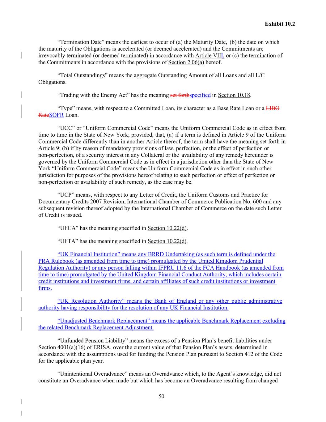 50 Exhibit 10.2 “Termination Date” means the earliest to occur of (a) the Maturity Date, (b) the date on which the maturity of the Obligations is accelerated (or deemed accelerated) and the Commitments are irrevocably terminated (or deemed terminated) in accordance with Article VIII, or (c) the termination of the Commitments in accordance with the provisions of Section 2.06(a) hereof. “Total Outstandings” means the aggregate Outstanding Amount of all Loans and all L/C Obligations. “Trading with the Enemy Act” has the meaning set forthspecified in Section 10.18. “Type” means, with respect to a Committed Loan, its character as a Base Rate Loan or a LIBO RateSOFR Loan. “UCC” or “Uniform Commercial Code” means the Uniform Commercial Code as in effect from time to time in the State of New York; provided, that, (a) if a term is defined in Article 9 of the Uniform Commercial Code differently than in another Article thereof, the term shall have the meaning set forth in Article 9; (b) if by reason of mandatory provisions of law, perfection, or the effect of perfection or non-perfection, of a security interest in any Collateral or the availability of any remedy hereunder is governed by the Uniform Commercial Code as in effect in a jurisdiction other than the State of New York “Uniform Commercial Code” means the Uniform Commercial Code as in effect in such other jurisdiction for purposes of the provisions hereof relating to such perfection or effect of perfection or non-perfection or availability of such remedy, as the case may be. “UCP” means, with respect to any Letter of Credit, the Uniform Customs and Practice for Documentary Credits 2007 Revision, International Chamber of Commerce Publication No. 600 and any subsequent revision thereof adopted by the International Chamber of Commerce on the date such Letter of Credit is issued. “UFCA” has the meaning specified in Section 10.22(d). “UFTA” has the meaning specified in Section 10.22(d). “UK Financial Institution” means any BRRD Undertaking (as such term is defined under the PRA Rulebook (as amended from time to time) promulgated by the United Kingdom Prudential Regulation Authority) or any person falling within IFPRU 11.6 of the FCA Handbook (as amended from time to time) promulgated by the United Kingdom Financial Conduct Authority, which includes certain credit institutions and investment firms, and certain affiliates of such credit institutions or investment firms. “UK Resolution Authority” means the Bank of England or any other public administrative authority having responsibility for the resolution of any UK Financial Institution. “Unadjusted Benchmark Replacement” means the applicable Benchmark Replacement excluding the related Benchmark Replacement Adjustment. “Unfunded Pension Liability” means the excess of a Pension Plan’s benefit liabilities under Section 4001(a)(16) of ERISA, over the current value of that Pension Plan’s assets, determined in accordance with the assumptions used for funding the Pension Plan pursuant to Section 412 of the Code for the applicable plan year. “Unintentional Overadvance” means an Overadvance which, to the Agent’s knowledge, did not constitute an Overadvance when made but which has become an Overadvance resulting from changed