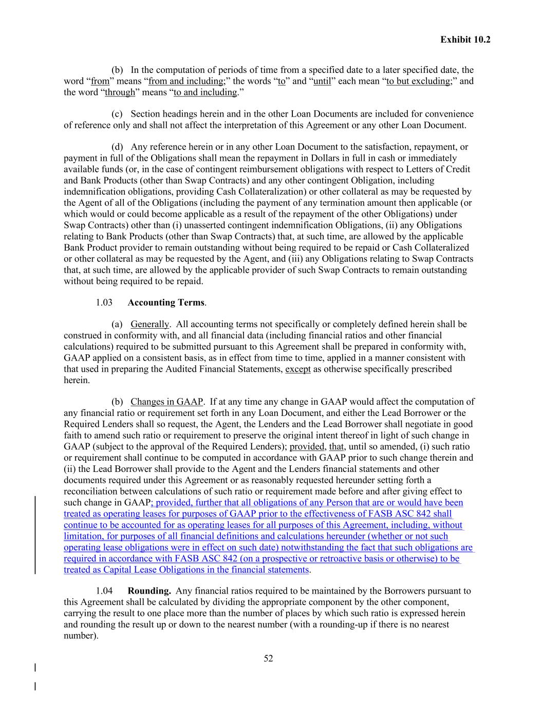 52 Exhibit 10.2 (b) In the computation of periods of time from a specified date to a later specified date, the word “from” means “from and including;” the words “to” and “until” each mean “to but excluding;” and the word “through” means “to and including.” (c) Section headings herein and in the other Loan Documents are included for convenience of reference only and shall not affect the interpretation of this Agreement or any other Loan Document. (d) Any reference herein or in any other Loan Document to the satisfaction, repayment, or payment in full of the Obligations shall mean the repayment in Dollars in full in cash or immediately available funds (or, in the case of contingent reimbursement obligations with respect to Letters of Credit and Bank Products (other than Swap Contracts) and any other contingent Obligation, including indemnification obligations, providing Cash Collateralization) or other collateral as may be requested by the Agent of all of the Obligations (including the payment of any termination amount then applicable (or which would or could become applicable as a result of the repayment of the other Obligations) under Swap Contracts) other than (i) unasserted contingent indemnification Obligations, (ii) any Obligations relating to Bank Products (other than Swap Contracts) that, at such time, are allowed by the applicable Bank Product provider to remain outstanding without being required to be repaid or Cash Collateralized or other collateral as may be requested by the Agent, and (iii) any Obligations relating to Swap Contracts that, at such time, are allowed by the applicable provider of such Swap Contracts to remain outstanding without being required to be repaid. 1.03 Accounting Terms. (a) Generally. All accounting terms not specifically or completely defined herein shall be construed in conformity with, and all financial data (including financial ratios and other financial calculations) required to be submitted pursuant to this Agreement shall be prepared in conformity with, GAAP applied on a consistent basis, as in effect from time to time, applied in a manner consistent with that used in preparing the Audited Financial Statements, except as otherwise specifically prescribed herein. (b) Changes in GAAP. If at any time any change in GAAP would affect the computation of any financial ratio or requirement set forth in any Loan Document, and either the Lead Borrower or the Required Lenders shall so request, the Agent, the Lenders and the Lead Borrower shall negotiate in good faith to amend such ratio or requirement to preserve the original intent thereof in light of such change in GAAP (subject to the approval of the Required Lenders); provided, that, until so amended, (i) such ratio or requirement shall continue to be computed in accordance with GAAP prior to such change therein and (ii) the Lead Borrower shall provide to the Agent and the Lenders financial statements and other documents required under this Agreement or as reasonably requested hereunder setting forth a reconciliation between calculations of such ratio or requirement made before and after giving effect to such change in GAAP; provided, further that all obligations of any Person that are or would have been treated as operating leases for purposes of GAAP prior to the effectiveness of FASB ASC 842 shall continue to be accounted for as operating leases for all purposes of this Agreement, including, without limitation, for purposes of all financial definitions and calculations hereunder (whether or not such operating lease obligations were in effect on such date) notwithstanding the fact that such obligations are required in accordance with FASB ASC 842 (on a prospective or retroactive basis or otherwise) to be treated as Capital Lease Obligations in the financial statements. 1.04 Rounding. Any financial ratios required to be maintained by the Borrowers pursuant to this Agreement shall be calculated by dividing the appropriate component by the other component, carrying the result to one place more than the number of places by which such ratio is expressed herein and rounding the result up or down to the nearest number (with a rounding-up if there is no nearest number).