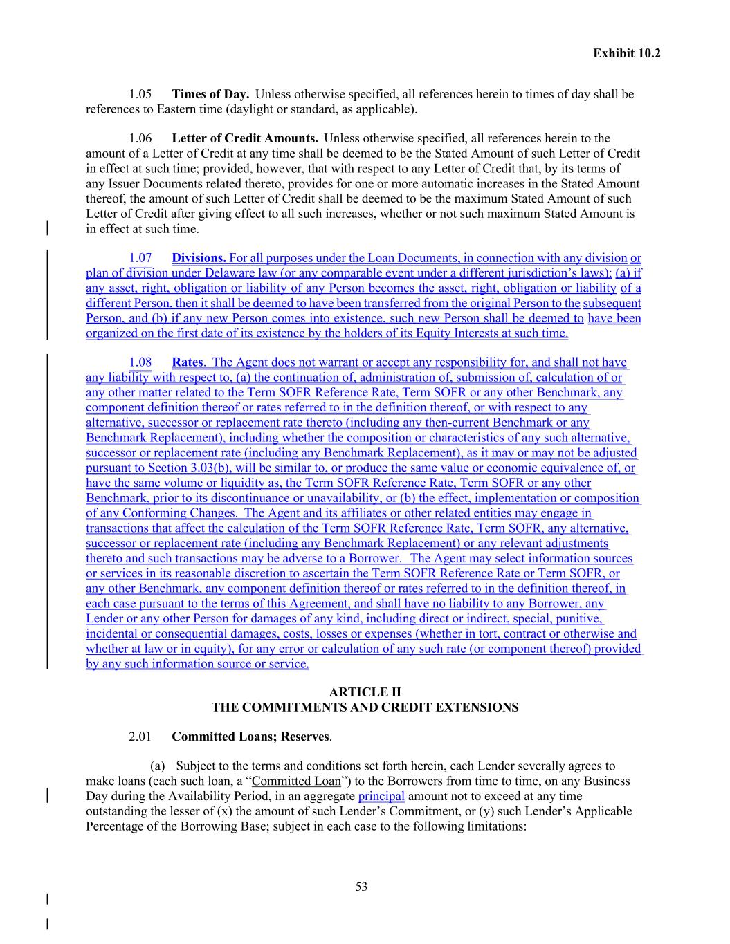 53 Exhibit 10.2 1.05 Times of Day. Unless otherwise specified, all references herein to times of day shall be references to Eastern time (daylight or standard, as applicable). 1.06 Letter of Credit Amounts. Unless otherwise specified, all references herein to the amount of a Letter of Credit at any time shall be deemed to be the Stated Amount of such Letter of Credit in effect at such time; provided, however, that with respect to any Letter of Credit that, by its terms of any Issuer Documents related thereto, provides for one or more automatic increases in the Stated Amount thereof, the amount of such Letter of Credit shall be deemed to be the maximum Stated Amount of such Letter of Credit after giving effect to all such increases, whether or not such maximum Stated Amount is in effect at such time. 1.07 Divisions. For all purposes under the Loan Documents, in connection with any division or plan of division under Delaware law (or any comparable event under a different jurisdiction’s laws): (a) if any asset, right, obligation or liability of any Person becomes the asset, right, obligation or liability of a different Person, then it shall be deemed to have been transferred from the original Person to the subsequent Person, and (b) if any new Person comes into existence, such new Person shall be deemed to have been organized on the first date of its existence by the holders of its Equity Interests at such time. 1.08 Rates. The Agent does not warrant or accept any responsibility for, and shall not have any liability with respect to, (a) the continuation of, administration of, submission of, calculation of or any other matter related to the Term SOFR Reference Rate, Term SOFR or any other Benchmark, any component definition thereof or rates referred to in the definition thereof, or with respect to any alternative, successor or replacement rate thereto (including any then-current Benchmark or any Benchmark Replacement), including whether the composition or characteristics of any such alternative, successor or replacement rate (including any Benchmark Replacement), as it may or may not be adjusted pursuant to Section 3.03(b), will be similar to, or produce the same value or economic equivalence of, or have the same volume or liquidity as, the Term SOFR Reference Rate, Term SOFR or any other Benchmark, prior to its discontinuance or unavailability, or (b) the effect, implementation or composition of any Conforming Changes. The Agent and its affiliates or other related entities may engage in transactions that affect the calculation of the Term SOFR Reference Rate, Term SOFR, any alternative, successor or replacement rate (including any Benchmark Replacement) or any relevant adjustments thereto and such transactions may be adverse to a Borrower. The Agent may select information sources or services in its reasonable discretion to ascertain the Term SOFR Reference Rate or Term SOFR, or any other Benchmark, any component definition thereof or rates referred to in the definition thereof, in each case pursuant to the terms of this Agreement, and shall have no liability to any Borrower, any Lender or any other Person for damages of any kind, including direct or indirect, special, punitive, incidental or consequential damages, costs, losses or expenses (whether in tort, contract or otherwise and whether at law or in equity), for any error or calculation of any such rate (or component thereof) provided by any such information source or service. ARTICLE II THE COMMITMENTS AND CREDIT EXTENSIONS 2.01 Committed Loans; Reserves. (a) Subject to the terms and conditions set forth herein, each Lender severally agrees to make loans (each such loan, a “Committed Loan”) to the Borrowers from time to time, on any Business Day during the Availability Period, in an aggregate principal amount not to exceed at any time outstanding the lesser of (x) the amount of such Lender’s Commitment, or (y) such Lender’s Applicable Percentage of the Borrowing Base; subject in each case to the following limitations:
