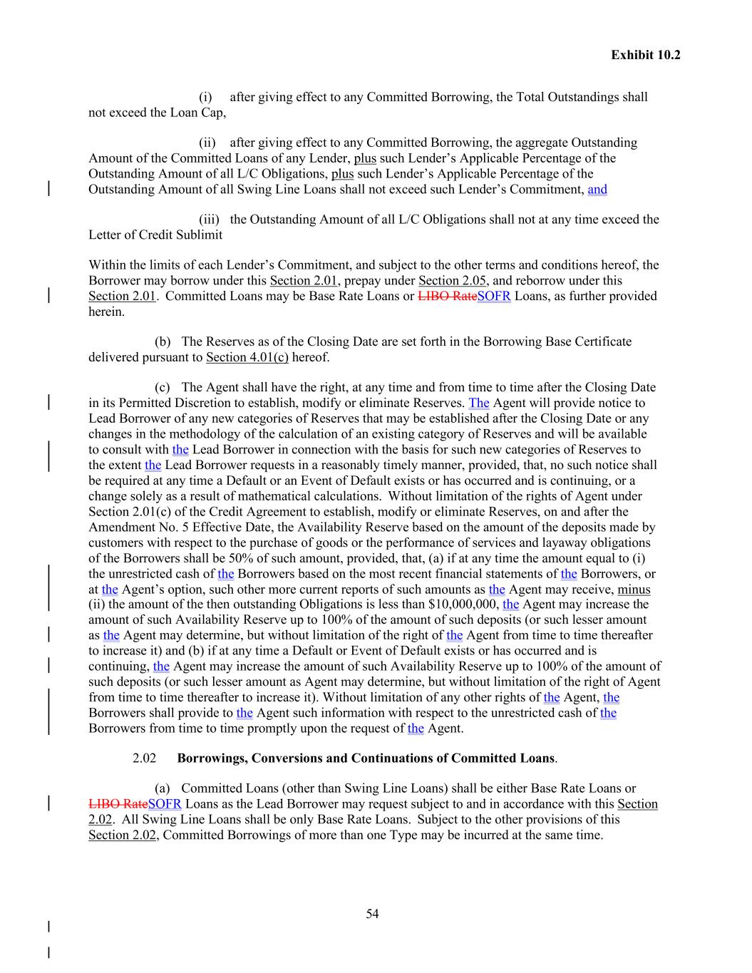 54 Exhibit 10.2 (i) after giving effect to any Committed Borrowing, the Total Outstandings shall not exceed the Loan Cap, (ii) after giving effect to any Committed Borrowing, the aggregate Outstanding Amount of the Committed Loans of any Lender, plus such Lender’s Applicable Percentage of the Outstanding Amount of all L/C Obligations, plus such Lender’s Applicable Percentage of the Outstanding Amount of all Swing Line Loans shall not exceed such Lender’s Commitment, and (iii) the Outstanding Amount of all L/C Obligations shall not at any time exceed the Letter of Credit Sublimit Within the limits of each Lender’s Commitment, and subject to the other terms and conditions hereof, the Borrower may borrow under this Section 2.01, prepay under Section 2.05, and reborrow under this Section 2.01. Committed Loans may be Base Rate Loans or LIBO RateSOFR Loans, as further provided herein. (b) The Reserves as of the Closing Date are set forth in the Borrowing Base Certificate delivered pursuant to Section 4.01(c) hereof. (c) The Agent shall have the right, at any time and from time to time after the Closing Date in its Permitted Discretion to establish, modify or eliminate Reserves. The Agent will provide notice to Lead Borrower of any new categories of Reserves that may be established after the Closing Date or any changes in the methodology of the calculation of an existing category of Reserves and will be available to consult with the Lead Borrower in connection with the basis for such new categories of Reserves to the extent the Lead Borrower requests in a reasonably timely manner, provided, that, no such notice shall be required at any time a Default or an Event of Default exists or has occurred and is continuing, or a change solely as a result of mathematical calculations. Without limitation of the rights of Agent under Section 2.01(c) of the Credit Agreement to establish, modify or eliminate Reserves, on and after the Amendment No. 5 Effective Date, the Availability Reserve based on the amount of the deposits made by customers with respect to the purchase of goods or the performance of services and layaway obligations of the Borrowers shall be 50% of such amount, provided, that, (a) if at any time the amount equal to (i) the unrestricted cash of the Borrowers based on the most recent financial statements of the Borrowers, or at the Agent’s option, such other more current reports of such amounts as the Agent may receive, minus (ii) the amount of the then outstanding Obligations is less than $10,000,000, the Agent may increase the amount of such Availability Reserve up to 100% of the amount of such deposits (or such lesser amount as the Agent may determine, but without limitation of the right of the Agent from time to time thereafter to increase it) and (b) if at any time a Default or Event of Default exists or has occurred and is continuing, the Agent may increase the amount of such Availability Reserve up to 100% of the amount of such deposits (or such lesser amount as Agent may determine, but without limitation of the right of Agent from time to time thereafter to increase it). Without limitation of any other rights of the Agent, the Borrowers shall provide to the Agent such information with respect to the unrestricted cash of the Borrowers from time to time promptly upon the request of the Agent. 2.02 Borrowings, Conversions and Continuations of Committed Loans. (a) Committed Loans (other than Swing Line Loans) shall be either Base Rate Loans or LIBO RateSOFR Loans as the Lead Borrower may request subject to and in accordance with this Section 2.02. All Swing Line Loans shall be only Base Rate Loans. Subject to the other provisions of this Section 2.02, Committed Borrowings of more than one Type may be incurred at the same time.