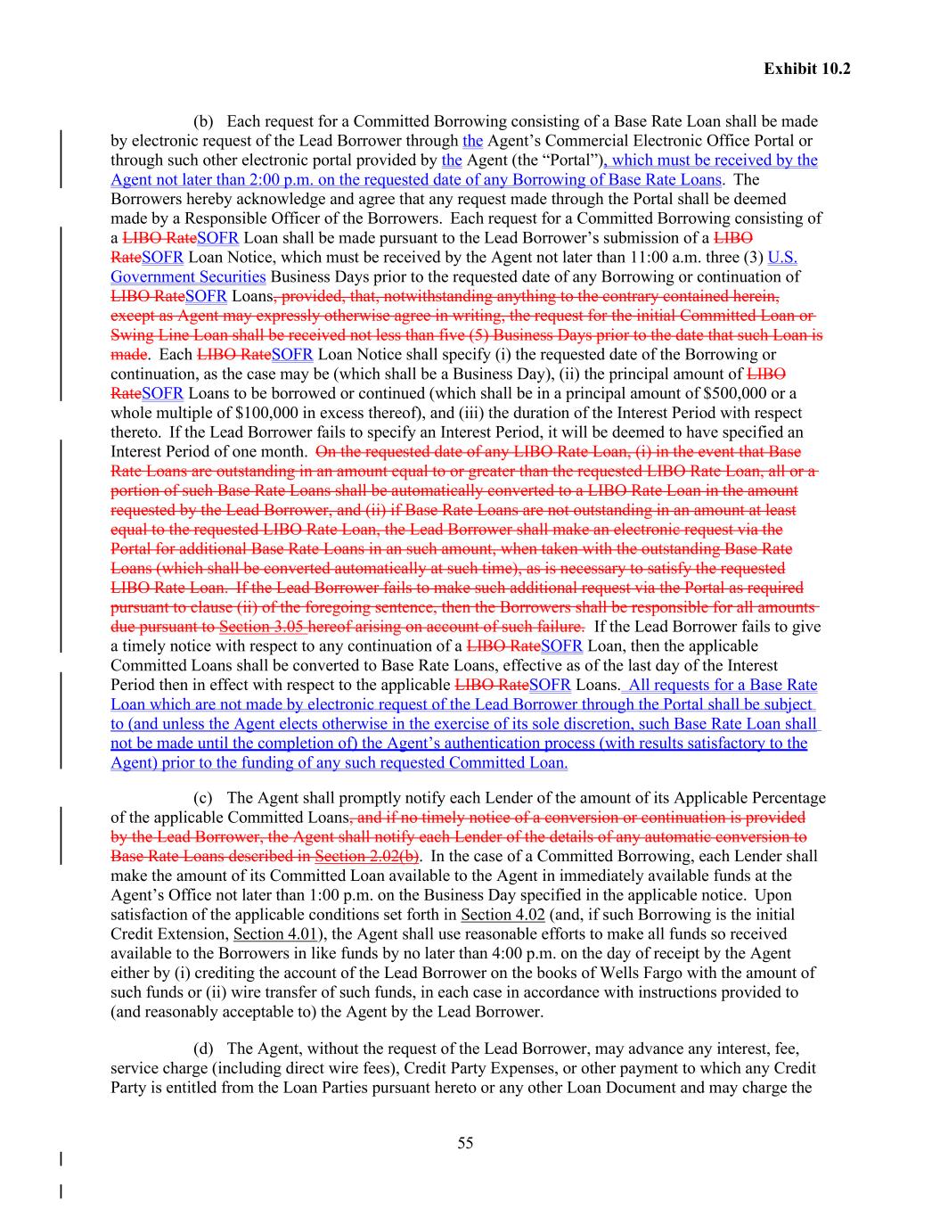 55 Exhibit 10.2 (b) Each request for a Committed Borrowing consisting of a Base Rate Loan shall be made by electronic request of the Lead Borrower through the Agent’s Commercial Electronic Office Portal or through such other electronic portal provided by the Agent (the “Portal”), which must be received by the Agent not later than 2:00 p.m. on the requested date of any Borrowing of Base Rate Loans. The Borrowers hereby acknowledge and agree that any request made through the Portal shall be deemed made by a Responsible Officer of the Borrowers. Each request for a Committed Borrowing consisting of a LIBO RateSOFR Loan shall be made pursuant to the Lead Borrower’s submission of a LIBO RateSOFR Loan Notice, which must be received by the Agent not later than 11:00 a.m. three (3) U.S. Government Securities Business Days prior to the requested date of any Borrowing or continuation of LIBO RateSOFR Loans, provided, that, notwithstanding anything to the contrary contained herein, except as Agent may expressly otherwise agree in writing, the request for the initial Committed Loan or Swing Line Loan shall be received not less than five (5) Business Days prior to the date that such Loan is made. Each LIBO RateSOFR Loan Notice shall specify (i) the requested date of the Borrowing or continuation, as the case may be (which shall be a Business Day), (ii) the principal amount of LIBO RateSOFR Loans to be borrowed or continued (which shall be in a principal amount of $500,000 or a whole multiple of $100,000 in excess thereof), and (iii) the duration of the Interest Period with respect thereto. If the Lead Borrower fails to specify an Interest Period, it will be deemed to have specified an Interest Period of one month. On the requested date of any LIBO Rate Loan, (i) in the event that Base Rate Loans are outstanding in an amount equal to or greater than the requested LIBO Rate Loan, all or a portion of such Base Rate Loans shall be automatically converted to a LIBO Rate Loan in the amount requested by the Lead Borrower, and (ii) if Base Rate Loans are not outstanding in an amount at least equal to the requested LIBO Rate Loan, the Lead Borrower shall make an electronic request via the Portal for additional Base Rate Loans in an such amount, when taken with the outstanding Base Rate Loans (which shall be converted automatically at such time), as is necessary to satisfy the requested LIBO Rate Loan. If the Lead Borrower fails to make such additional request via the Portal as required pursuant to clause (ii) of the foregoing sentence, then the Borrowers shall be responsible for all amounts due pursuant to Section 3.05 hereof arising on account of such failure. If the Lead Borrower fails to give a timely notice with respect to any continuation of a LIBO RateSOFR Loan, then the applicable Committed Loans shall be converted to Base Rate Loans, effective as of the last day of the Interest Period then in effect with respect to the applicable LIBO RateSOFR Loans. All requests for a Base Rate Loan which are not made by electronic request of the Lead Borrower through the Portal shall be subject to (and unless the Agent elects otherwise in the exercise of its sole discretion, such Base Rate Loan shall not be made until the completion of) the Agent’s authentication process (with results satisfactory to the Agent) prior to the funding of any such requested Committed Loan. (c) The Agent shall promptly notify each Lender of the amount of its Applicable Percentage of the applicable Committed Loans, and if no timely notice of a conversion or continuation is provided by the Lead Borrower, the Agent shall notify each Lender of the details of any automatic conversion to Base Rate Loans described in Section 2.02(b). In the case of a Committed Borrowing, each Lender shall make the amount of its Committed Loan available to the Agent in immediately available funds at the Agent’s Office not later than 1:00 p.m. on the Business Day specified in the applicable notice. Upon satisfaction of the applicable conditions set forth in Section 4.02 (and, if such Borrowing is the initial Credit Extension, Section 4.01), the Agent shall use reasonable efforts to make all funds so received available to the Borrowers in like funds by no later than 4:00 p.m. on the day of receipt by the Agent either by (i) crediting the account of the Lead Borrower on the books of Wells Fargo with the amount of such funds or (ii) wire transfer of such funds, in each case in accordance with instructions provided to (and reasonably acceptable to) the Agent by the Lead Borrower. (d) The Agent, without the request of the Lead Borrower, may advance any interest, fee, service charge (including direct wire fees), Credit Party Expenses, or other payment to which any Credit Party is entitled from the Loan Parties pursuant hereto or any other Loan Document and may charge the