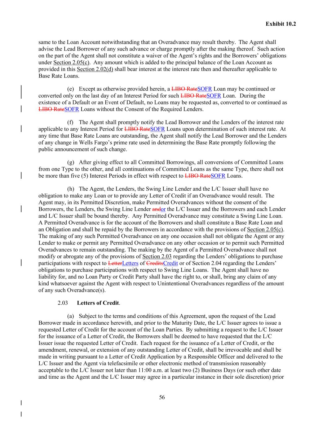 56 Exhibit 10.2 same to the Loan Account notwithstanding that an Overadvance may result thereby. The Agent shall advise the Lead Borrower of any such advance or charge promptly after the making thereof. Such action on the part of the Agent shall not constitute a waiver of the Agent’s rights and the Borrowers’ obligations under Section 2.05(c). Any amount which is added to the principal balance of the Loan Account as provided in this Section 2.02(d) shall bear interest at the interest rate then and thereafter applicable to Base Rate Loans. (e) Except as otherwise provided herein, a LIBO RateSOFR Loan may be continued or converted only on the last day of an Interest Period for such LIBO RateSOFR Loan. During the existence of a Default or an Event of Default, no Loans may be requested as, converted to or continued as LIBO RateSOFR Loans without the Consent of the Required Lenders. (f) The Agent shall promptly notify the Lead Borrower and the Lenders of the interest rate applicable to any Interest Period for LIBO RateSOFR Loans upon determination of such interest rate. At any time that Base Rate Loans are outstanding, the Agent shall notify the Lead Borrower and the Lenders of any change in Wells Fargo’s prime rate used in determining the Base Rate promptly following the public announcement of such change. (g) After giving effect to all Committed Borrowings, all conversions of Committed Loans from one Type to the other, and all continuations of Committed Loans as the same Type, there shall not be more than five (5) Interest Periods in effect with respect to LIBO RateSOFR Loans. (h) The Agent, the Lenders, the Swing Line Lender and the L/C Issuer shall have no obligation to make any Loan or to provide any Letter of Credit if an Overadvance would result. The Agent may, in its Permitted Discretion, make Permitted Overadvances without the consent of the Borrowers, the Lenders, the Swing Line Lender andor the L/C Issuer and the Borrowers and each Lender and L/C Issuer shall be bound thereby. Any Permitted Overadvance may constitute a Swing Line Loan. A Permitted Overadvance is for the account of the Borrowers and shall constitute a Base Rate Loan and an Obligation and shall be repaid by the Borrowers in accordance with the provisions of Section 2.05(c). The making of any such Permitted Overadvance on any one occasion shall not obligate the Agent or any Lender to make or permit any Permitted Overadvance on any other occasion or to permit such Permitted Overadvances to remain outstanding. The making by the Agent of a Permitted Overadvance shall not modify or abrogate any of the provisions of Section 2.03 regarding the Lenders’ obligations to purchase participations with respect to LetterLetters of CreditsCredit or of Section 2.04 regarding the Lenders’ obligations to purchase participations with respect to Swing Line Loans. The Agent shall have no liability for, and no Loan Party or Credit Party shall have the right to, or shall, bring any claim of any kind whatsoever against the Agent with respect to Unintentional Overadvances regardless of the amount of any such Overadvance(s). 2.03 Letters of Credit. (a) Subject to the terms and conditions of this Agreement, upon the request of the Lead Borrower made in accordance herewith, and prior to the Maturity Date, the L/C Issuer agrees to issue a requested Letter of Credit for the account of the Loan Parties. By submitting a request to the L/C Issuer for the issuance of a Letter of Credit, the Borrowers shall be deemed to have requested that the L/C Issuer issue the requested Letter of Credit. Each request for the issuance of a Letter of Credit, or the amendment, renewal, or extension of any outstanding Letter of Credit, shall be irrevocable and shall be made in writing pursuant to a Letter of Credit Application by a Responsible Officer and delivered to the L/C Issuer and the Agent via telefacsimile or other electronic method of transmission reasonably acceptable to the L/C Issuer not later than 11:00 a.m. at least two (2) Business Days (or such other date and time as the Agent and the L/C Issuer may agree in a particular instance in their sole discretion) prior